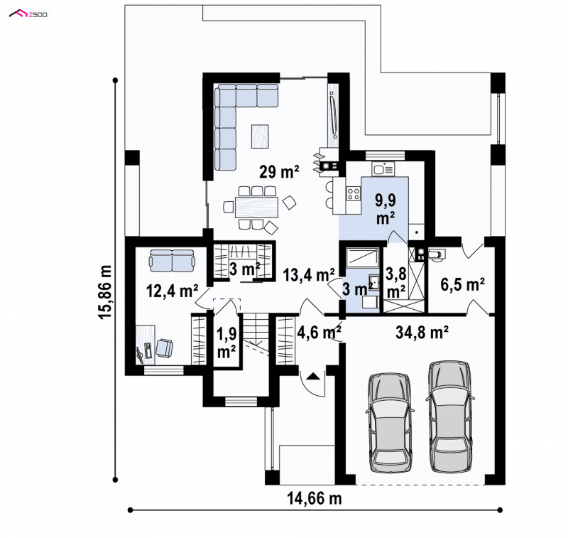 Wnętrze podzielono na dwie części domu. Parter to dzienna strefa naszych wpływów. Z dwustanowiskowego garażu mamy przejście do wnętrza domu. Jasny, rozświetlony dużymi przeszkleniami salon z gustownym kominkiem posiada dwa wyjścia na tarasy od strony ogrodu. Aneks kuchenny posiada możliwość odgrodzenia ścianą od części jadalnej. Prywatny gabinet oraz dodatkowo zaprojektowane pomieszczenia jak spiżarka, garderoba czy schowek dostarczą powierzchni na schowanie naszych niekoniecznie małych „drobiazgów”.