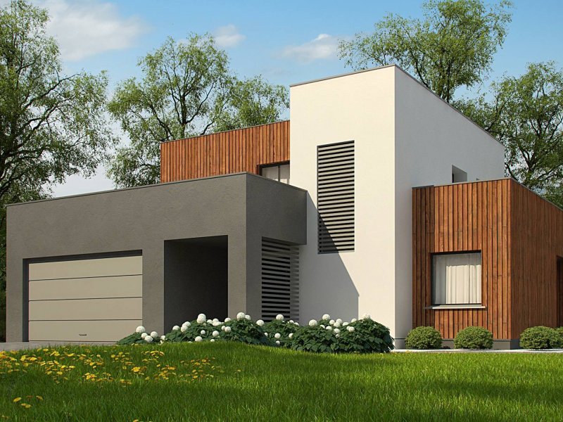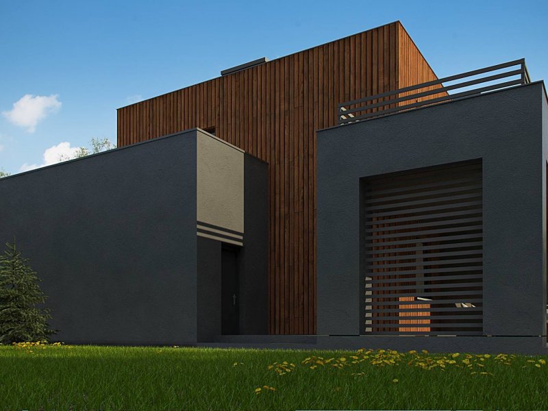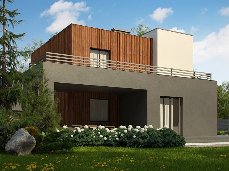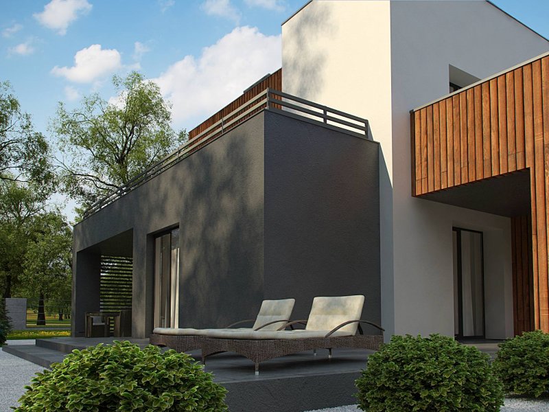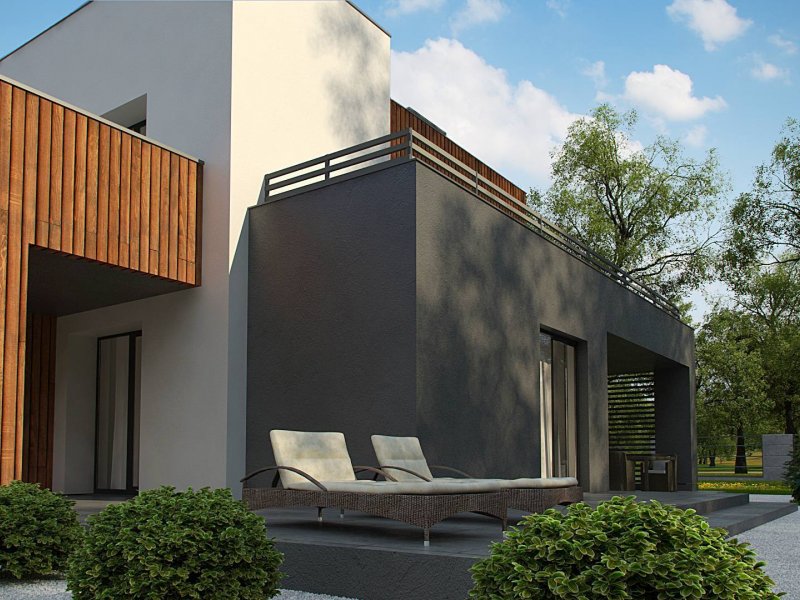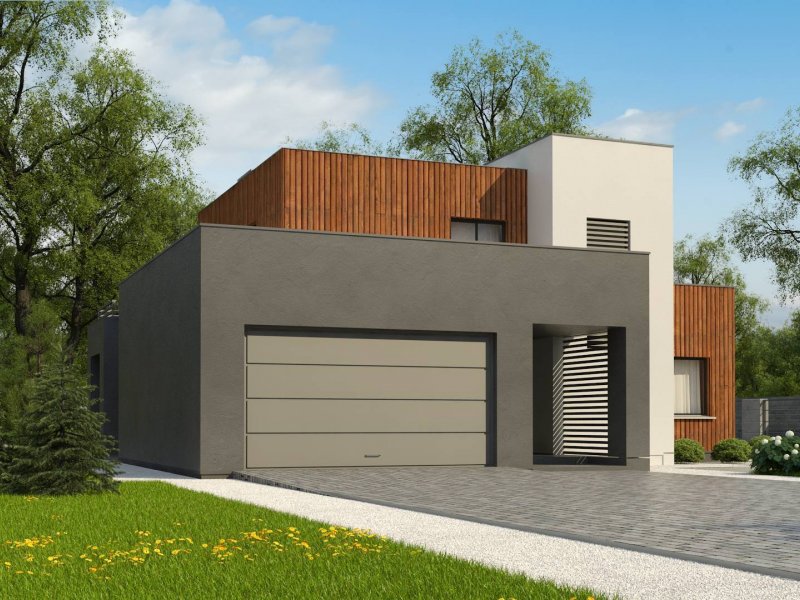 Dwukondygnacyjny, nowoczesny dom o powierzchni ok. 140m.2 z płaskim dachem i dwustanowiskowym garażem. Subtelna kolorystyka beży, brązów i geometria przenikających się sześcianów o różnych wysokościach, znakomicie licuje z drewnianymi elementami elewacji, nadając jej wrażenia neutralności i dobrego smaku.