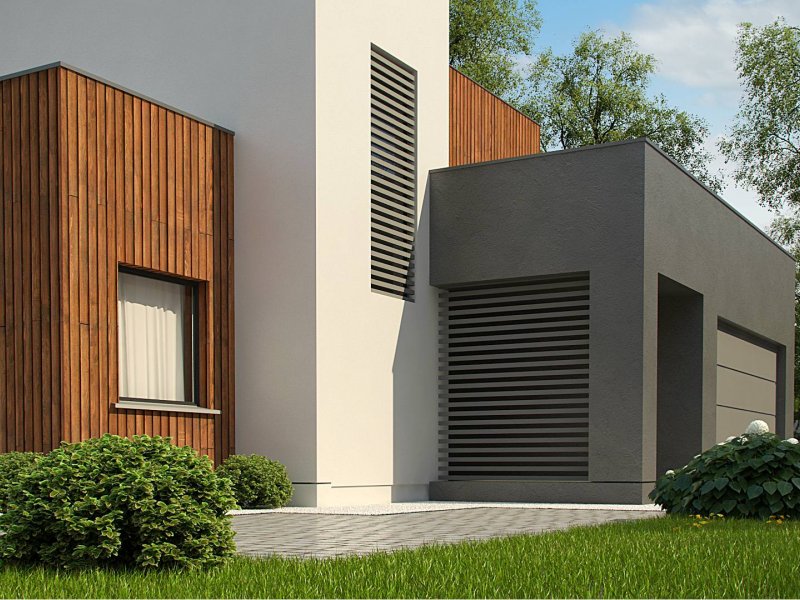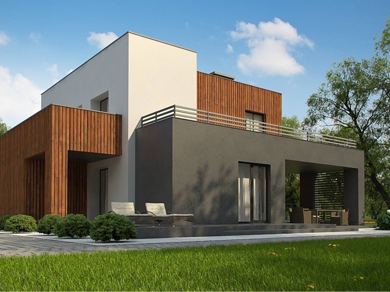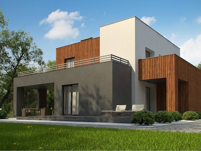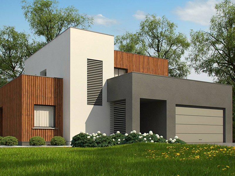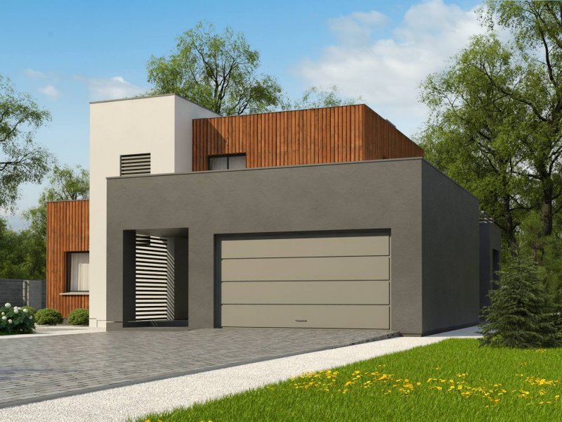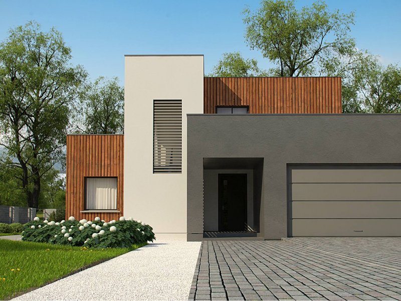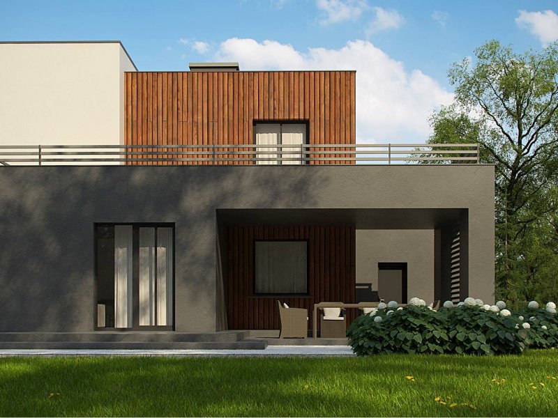 Dwukondygnacyjny, nowoczesny dom o powierzchni ok. 140m.2 z płaskim dachem i dwustanowiskowym garażem. Subtelna kolorystyka beży, brązów i geometria przenikających się sześcianów o różnych wysokościach, znakomicie licuje z drewnianymi elementami elewacji, nadając jej wrażenia neutralności i dobrego smaku.