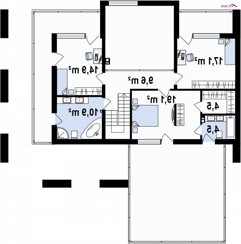 Piętro to nocna strefa domu. Trzy sypialnie, z których największa posiada prywatną łazienkę i garderobę stanowią idealną ilość pokoi dla rodziny z dwojgiem dzieci. Każde z pomieszczeń posiada wyjście na taras, więc domownicy niezależnie od siebie decydują kiedy chcą powiesić pranie lub wywietrzyć pościel.