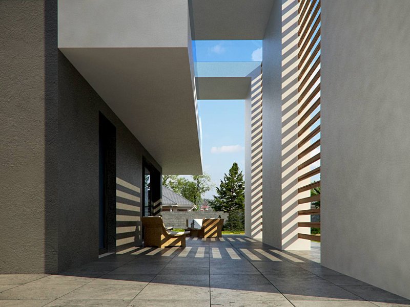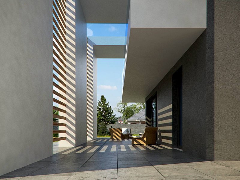 Zarówno z kuchni, salonu i jadalni prowadzą wyjścia na zadaszony taras. Dodatkowy gabinet również wyposażono w wyjście na ogród. Dzięki temu zawsze będziemy mogli zaczerpnąć świeżego powietrza podczas pracy.