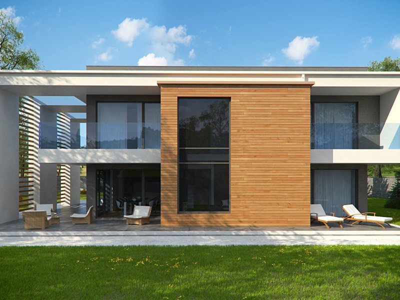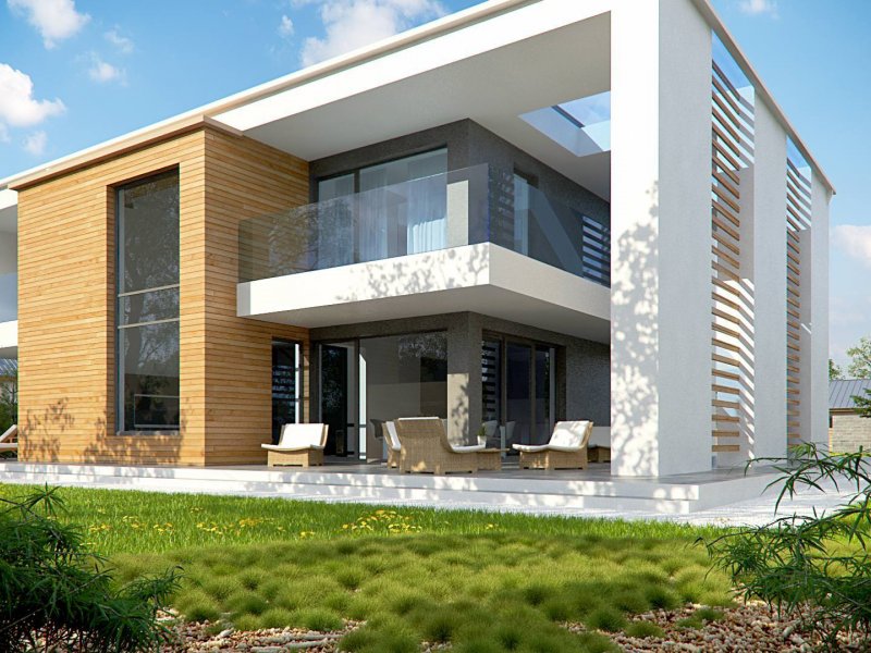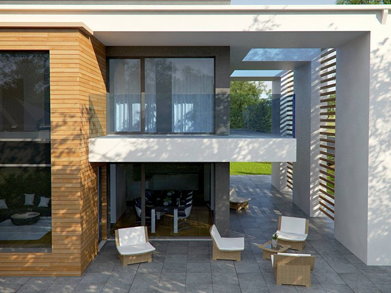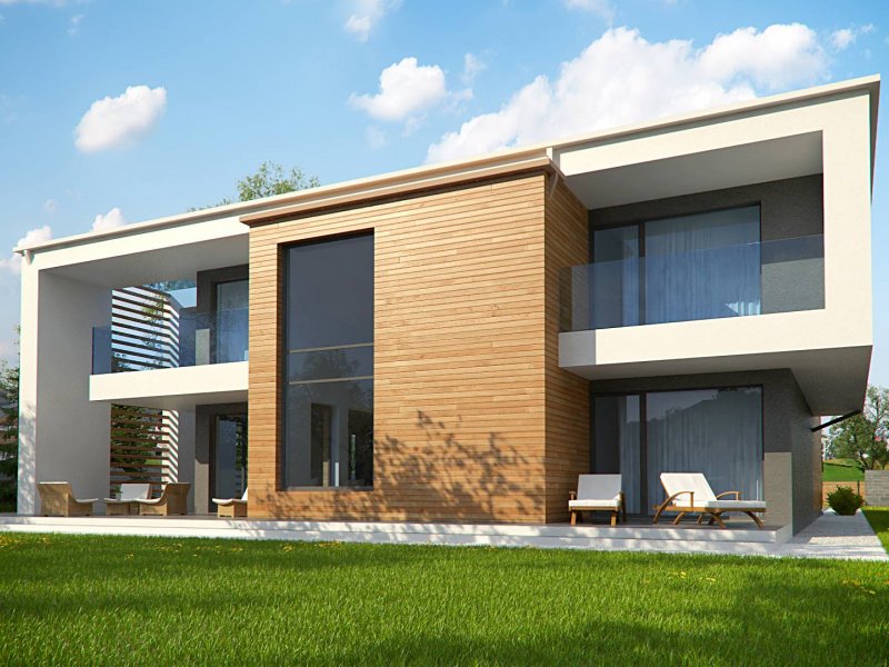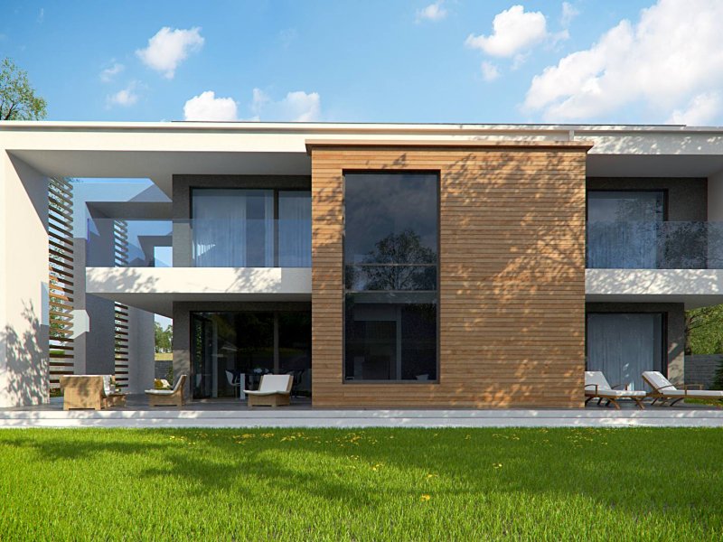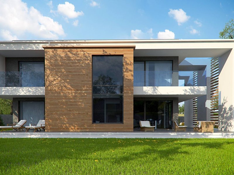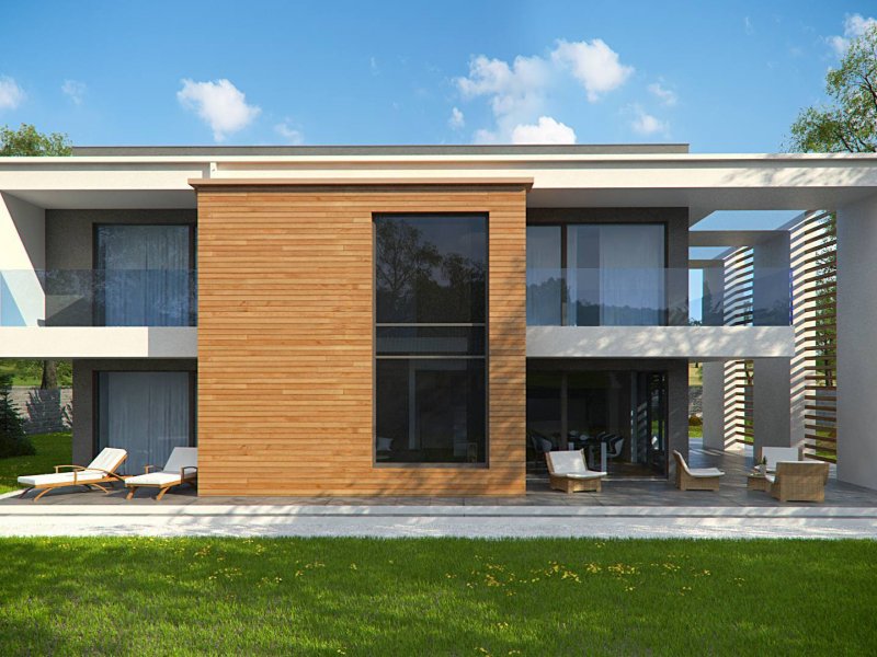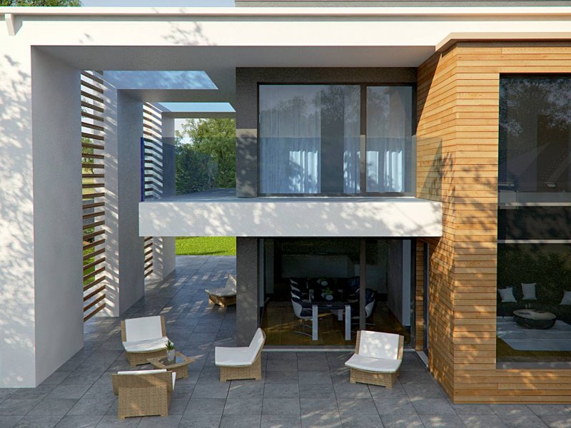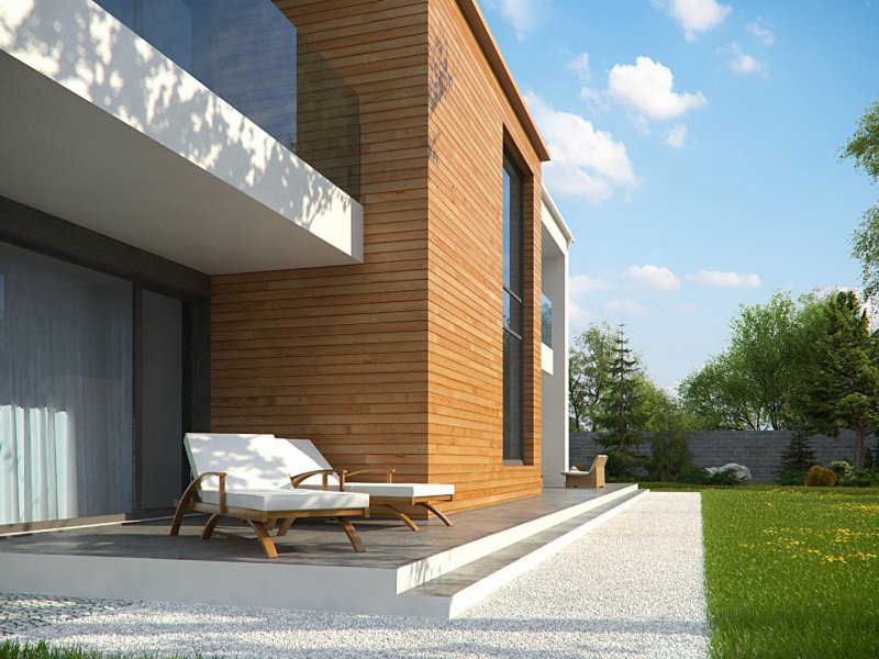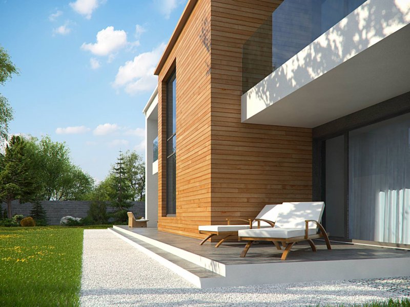 Elewację wykończono drewnianymi panelami. Biały tynk oraz drewniane elementy dekoracyjne, po których Romeo mógłby się wspinać do swojej Juli, znakomicie ze sobą współgrają.