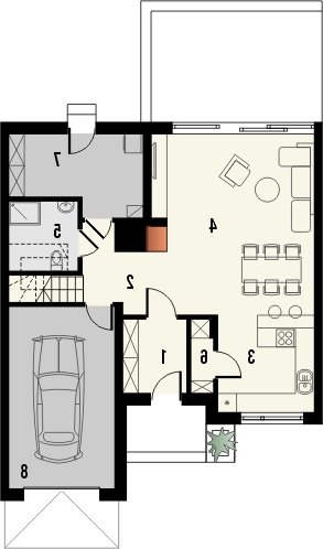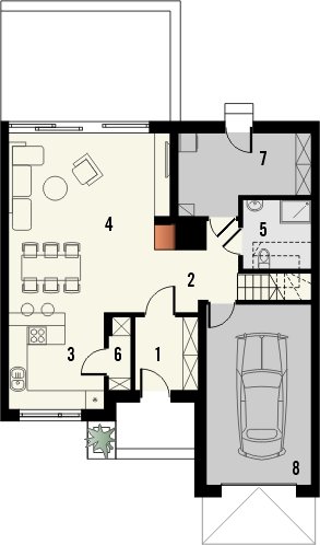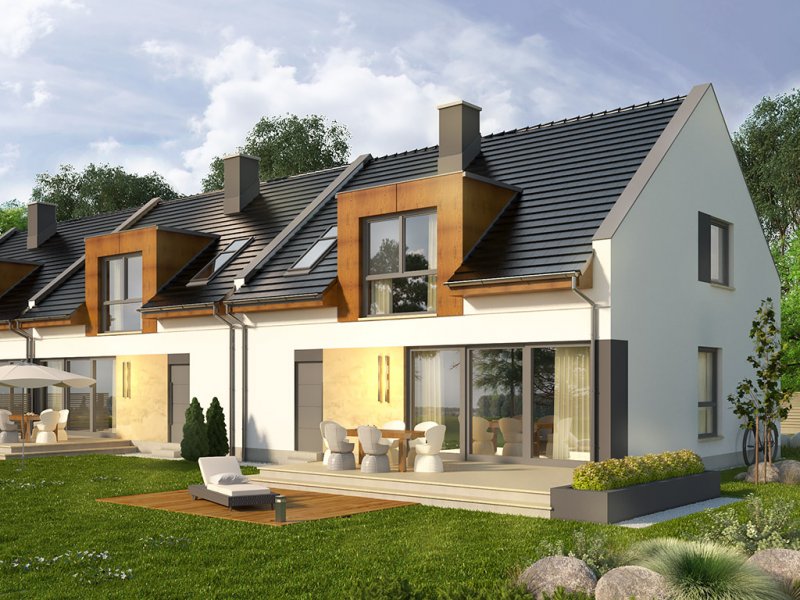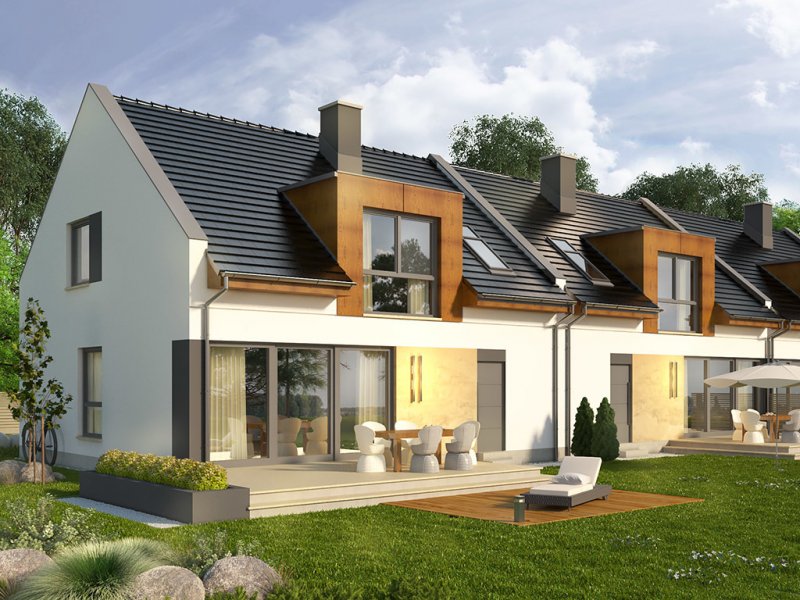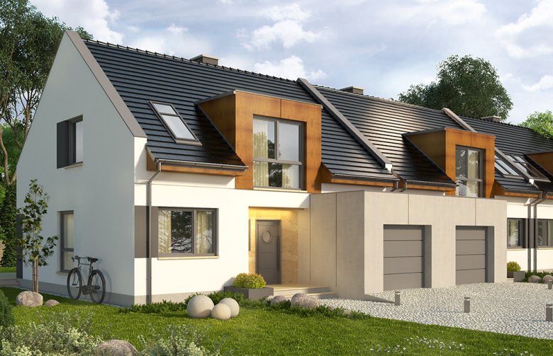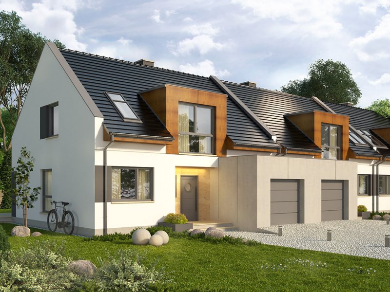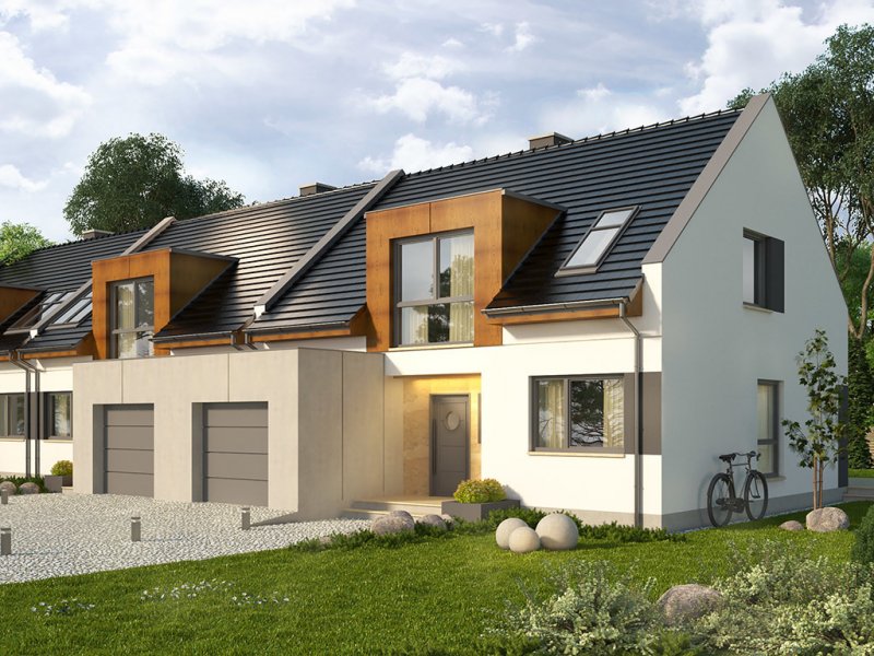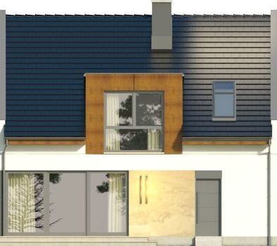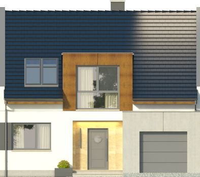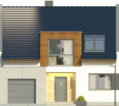 AVIATOR 6 to dom jednorodzinny w formie segmentu domu szeregowego, z garażem jednostanowiskowym, wysuniętym nieco względem pozostałej części budynku. Oprócz garażu, na parterze ulokowano także przestronny salon z dużymi oknami wychodzącymi na taras, kuchnię z niewielką spiżarką, a także łazienkę. Pomieszczenie gospodarcze, pełni również funkcję kotłowni i jest dostępne zarówno z holu, jak i z zewnątrz. Pokoje na poddaszu pod dachem stromym są wygodne, duże i jasne, a 2 z nich posiadają wydzielone garderoby. Na piętrze przewidziano również łazienkę.Dach domu jest dwuspadowy, przykuwającym uwagę elementem są podwyższone ściany szczytowe. Strefa wejściowa znalazła się we wnęce. Inne warianty, w jakich zakupić można projekt, to: bez garażu, w zabudowie bliźniaczej oraz w zabudowie wolnostojącej. Ponadto, wszystkie domki zakupić można w wersji standard oraz odbicie lustrzane.Materiały, z jakich wykonano dom, to gazobeton + styropian (ściany), tynk + płyty kamienne + płyty drewniane (wykończenie ścian), strop TERIVA , drewno (więźba), dachówka ceramiczna (pokrycie dachu). Na etapie adaptacji dostępne są wymienne materiały.