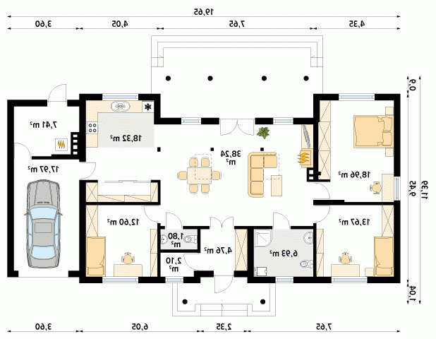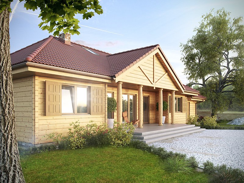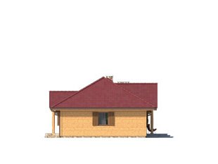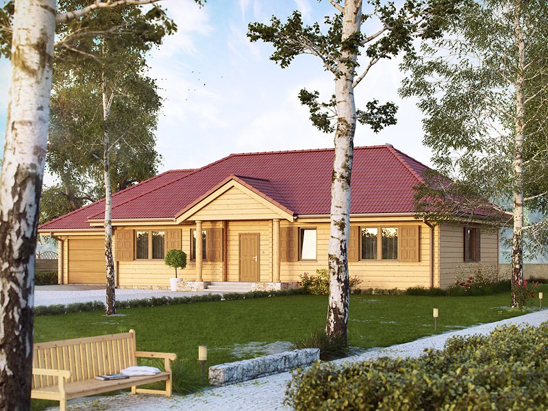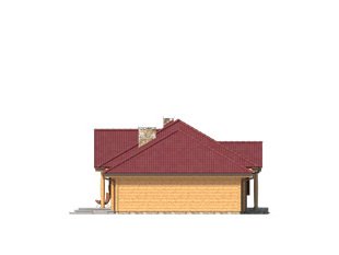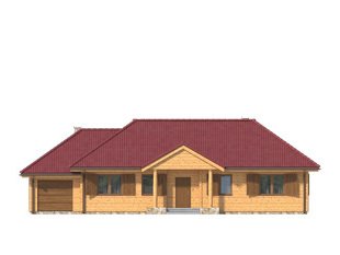 Dom jednorodzinny drewniany, parterowy. Układ funkcjonalny – pokój dzienny połączony z jadalnią, kuchnia, 3 pokoje, łazienka, kotłownia oraz garaż.