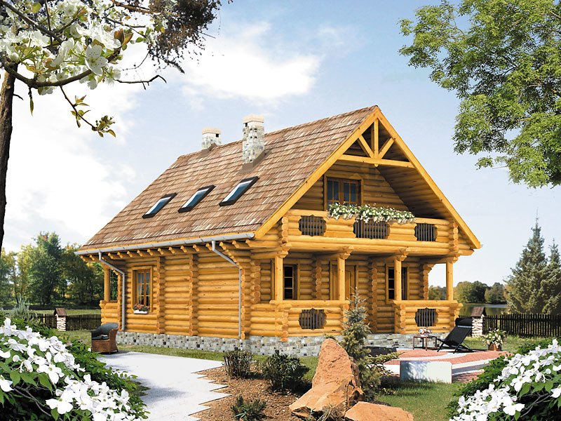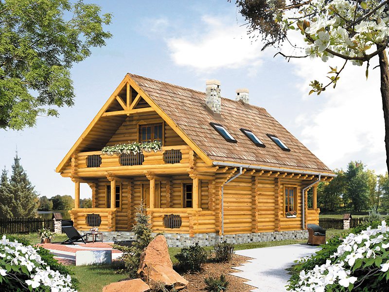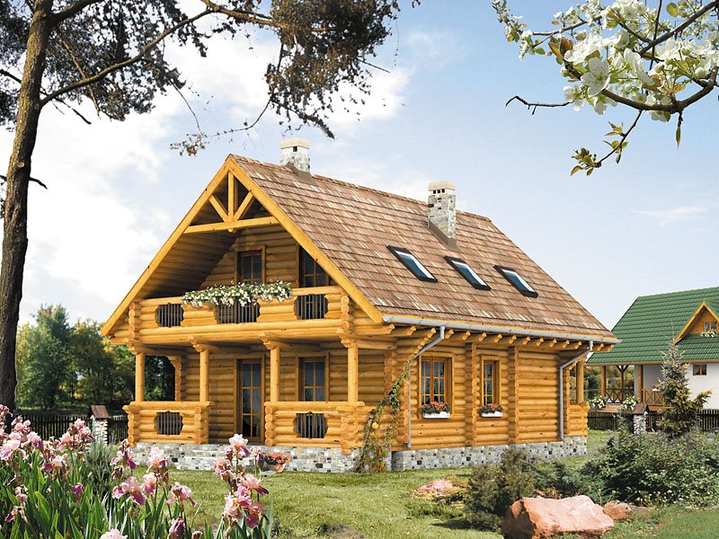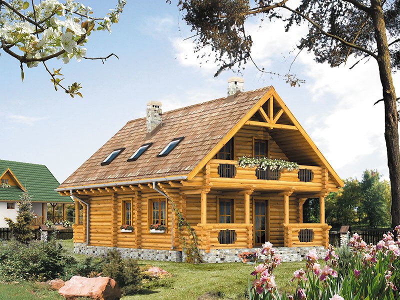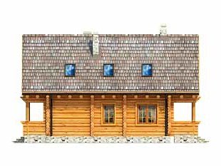 Ściany: z bali drewnianych, Stropy: belki drewniane, Dach: dachówka, kąt nachylenia 42°