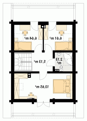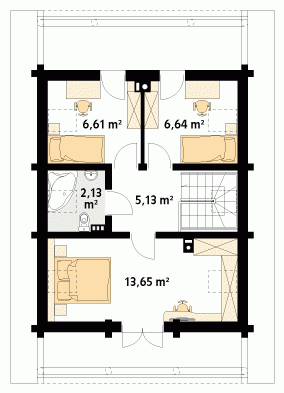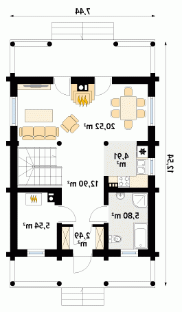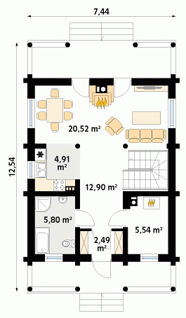 Dom mieszkalny o zwartej zabudowie, parterowy, niepodpiwniczony, dla 3 – 4-osobowej rodziny. Na parterze zaprojektowano otwarty pokój dzienny z kominkiem, kuchnię z jadalnią, łazienkę i pomieszczenie gospodarcze. Na poddaszu znajdują się trzy sypialnie i łazienka.