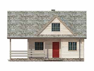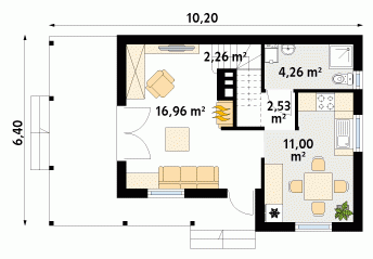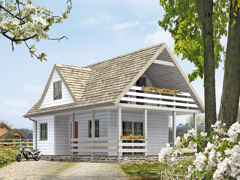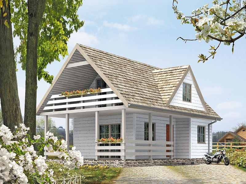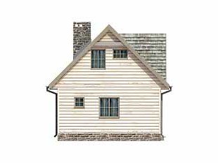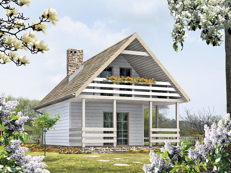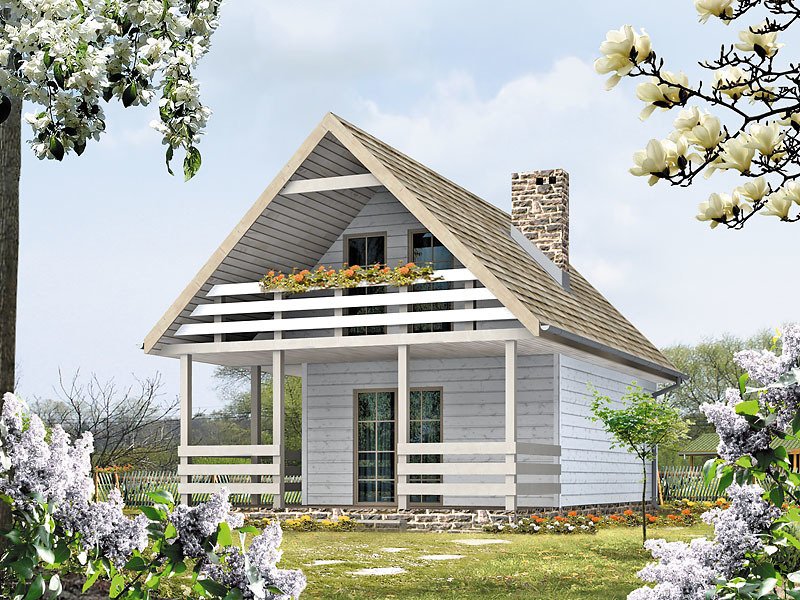 Mały letniskowy domek z czterema pokojami na poddaszu. Jadalnia z aneksem kuchennym. Pokój kominkowy z wyjściem na taras.