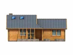 Ściany: bal drewniany + wełna mineralna, Stropy: na belkach drewnianych, Dach: dachówka bitumiczna, kąt nachylenia 26°
