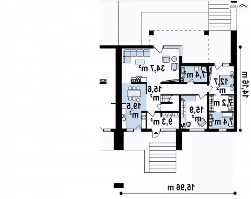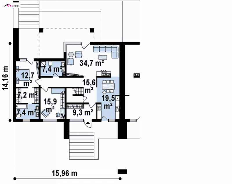 Zb19 został zaprojektowany w celu budowy szeregowej. Również jest podpiwniczony, więc można pomieszczenie piwniczne wykorzystać wedle własnych potrzeb. Posiada 2 stanowiskowy garaż, zadaszone wejście, kuchnie połączoną z jadalnią, kominek, sypialnię z łazienką i garderobą.