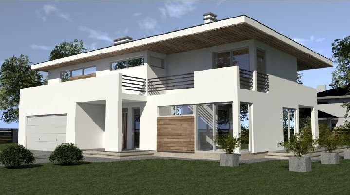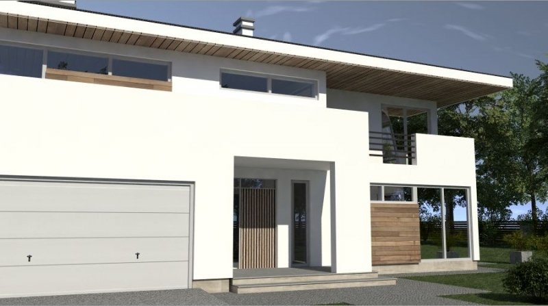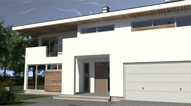 Projekt willi miejskiej o architekturze współczesnej. Parter domu tworzy otwartą przestrzeń na którą składa sie duży salon i kuchnia z jadalnią. Kuchnia w stylu nowoczesnym z miejscem na wolnostojącą "wyspę". Z jadalni jest wyjście na zadaszony taras. Piętro domu ma charakter strefy nocnej, w skład której wchodzą trzy sypialnie. Dom posiada wbudowany garaż na dwa samochody osobowe. Projekt z garażem jednostanowiskowym jest dostępny pod symbolem AN 006.