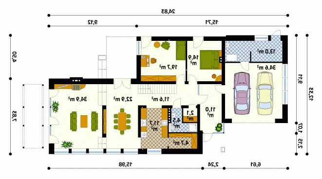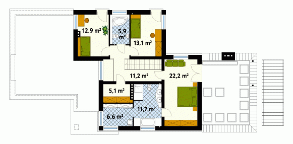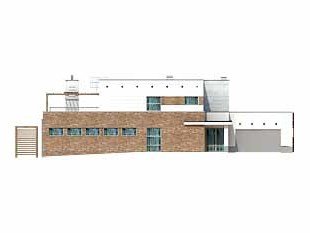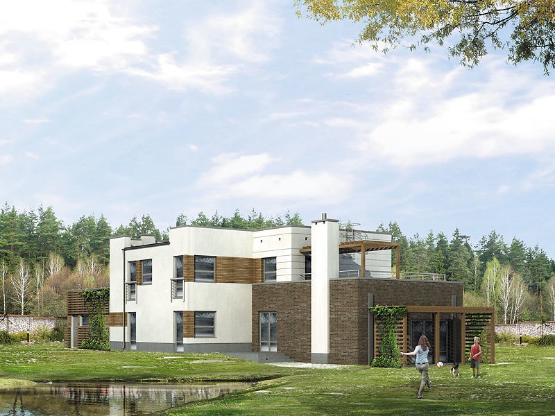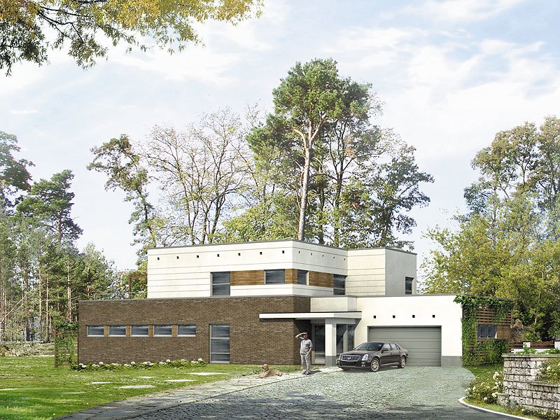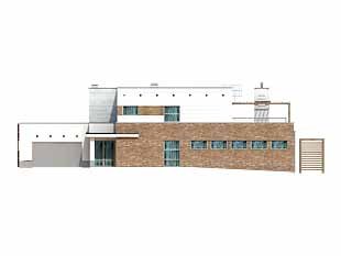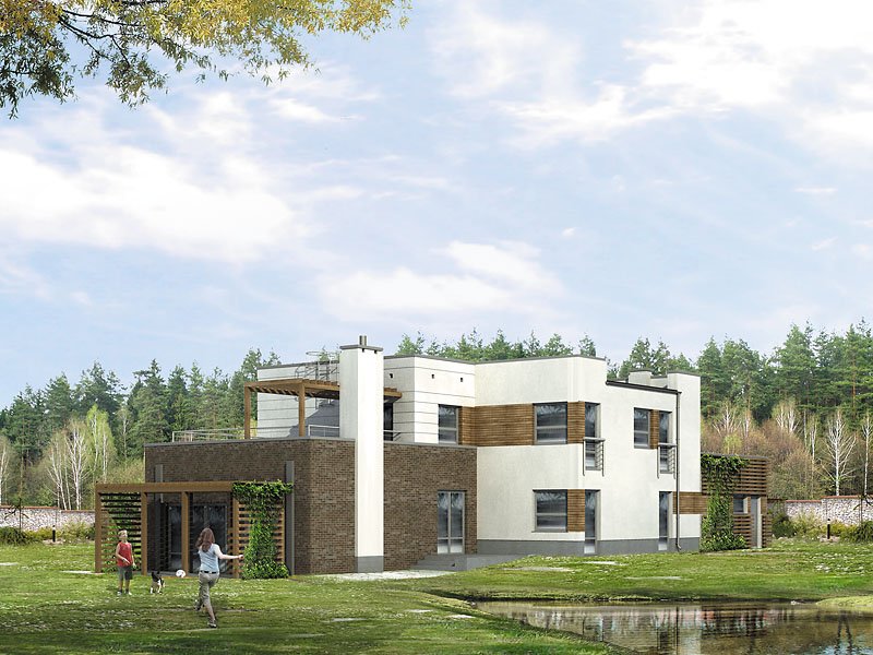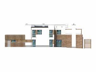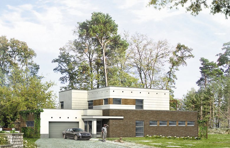 Dom jednorodzinny z garażem dwustanowiskowym, niepodpiwniczony, przewidziany dla wieloosobowej rodziny. Dwie pełne kondygnacje wynikają z nowoczesnej bryły budynku. Na parterze zaprojektowano pokój dzienny z aneksem jadalnianym i kuchnią ze spiżarnią oraz dodatkowe dwa pokoje. Na piętrze znajdują się trzy sypialnie, jedna z osobną łazienką i wyjściem na przestronny, częściowo zadaszony pergolą taras. Dodatkowo znajdują się tu pralnia i garderoba.