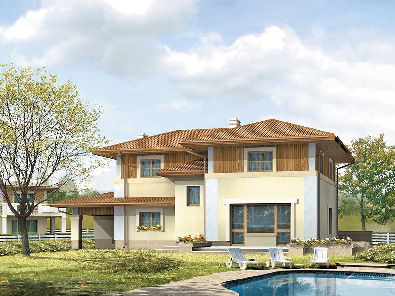 Ściany: 3-warstwowe - pustak ceramiczny + styropian, Stropy: gęstożebrowe AKERMAN, Dach: dachówka ceramiczna, kąt nachylenia 15° i 21°
