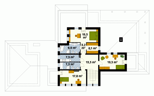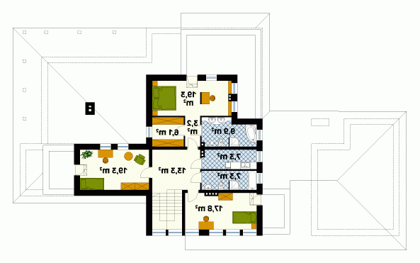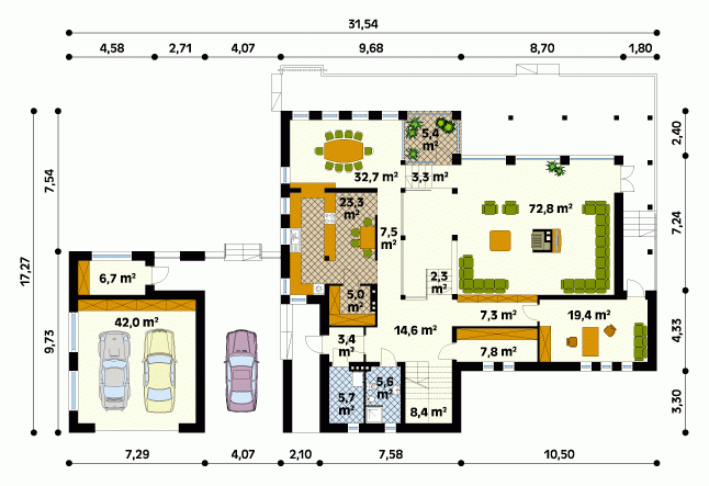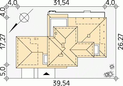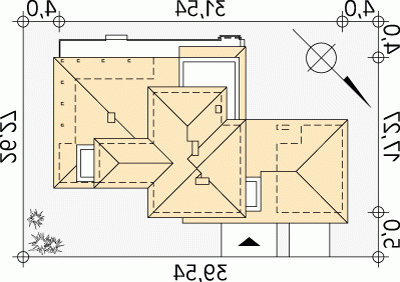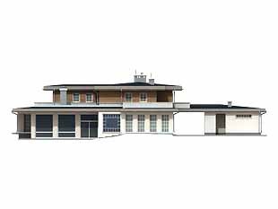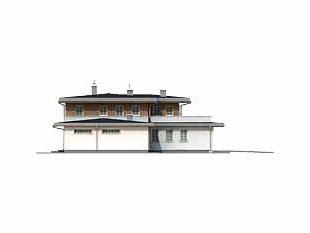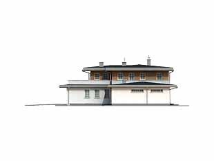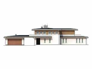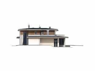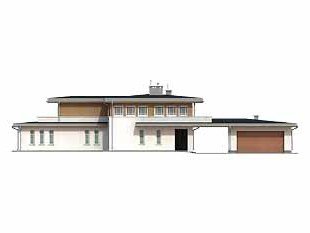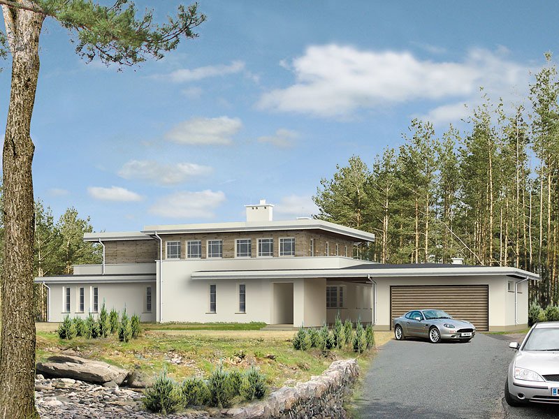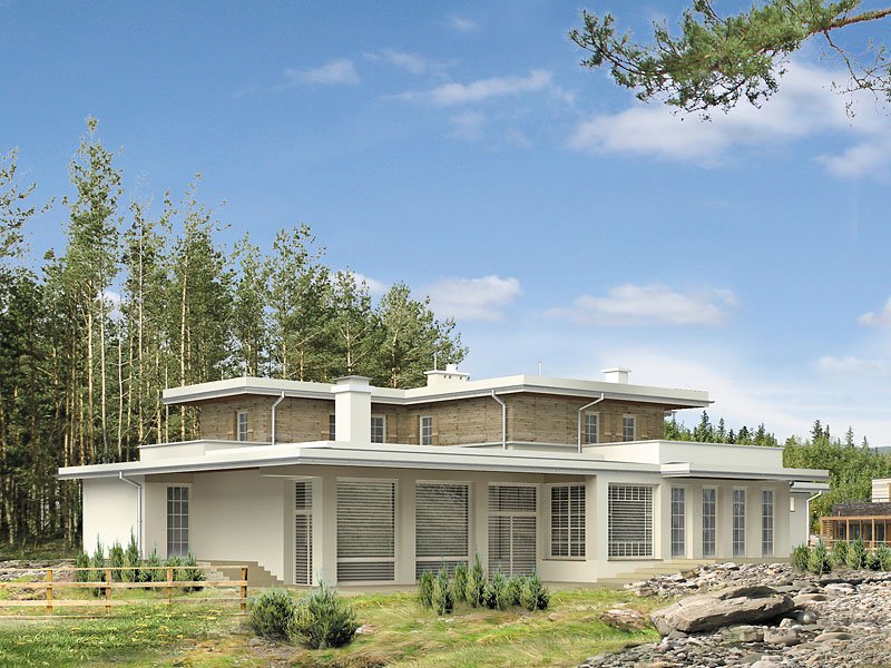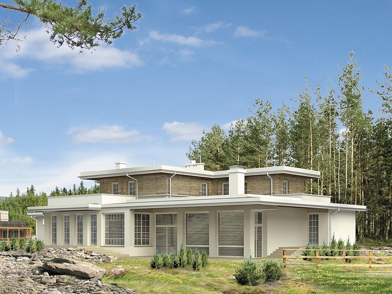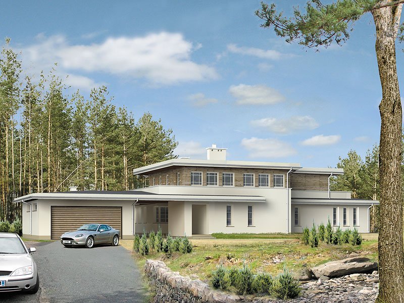 Dom piętrowy dla 3 - 4-osobowej rodziny. Nowoczesna bryła z płaskimi dachami. Na parterze część dzienna z pokojem dziennym, kuchnią, jadalnią oraz dodatkowym gabinetem. Na piętrze trzy sypialnie, łazienki oraz garderoba. W osobnej części budynku zaprojektowano garaż i pomieszczenie gospodarcze.