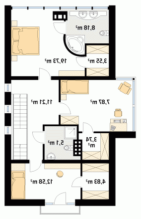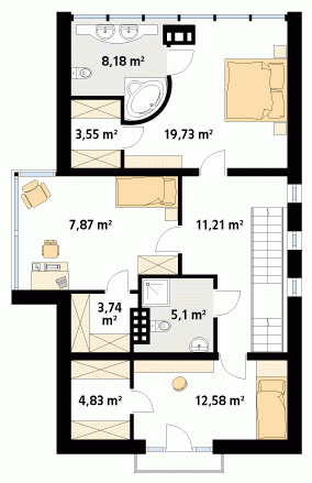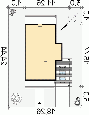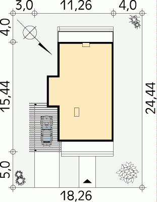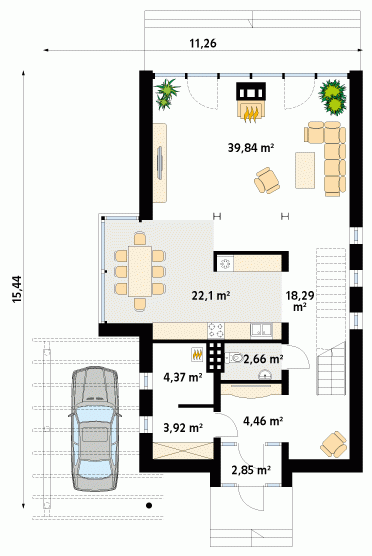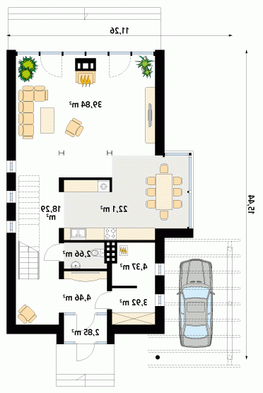 Dom jednorodzinny dwufunkcyjny, przeznaczony dla 4 osób. Na parterze zaprojektowano pomieszczenia dziennej strefy, takie jak: pokój dzienny, jadalnię, kuchnię, kotłownię i wc. Poddasze przeznaczone jest na pomieszczenia strefy nocnej: trzy sypialnie z garderobami i dwie łazienki, w tym jedna dostępna z dwóch sypialni. Przy domu zaprojektowano wiatę, która po zabudowaniu może funkcjonować jako garaż.