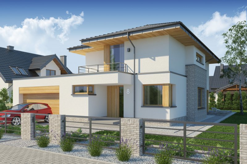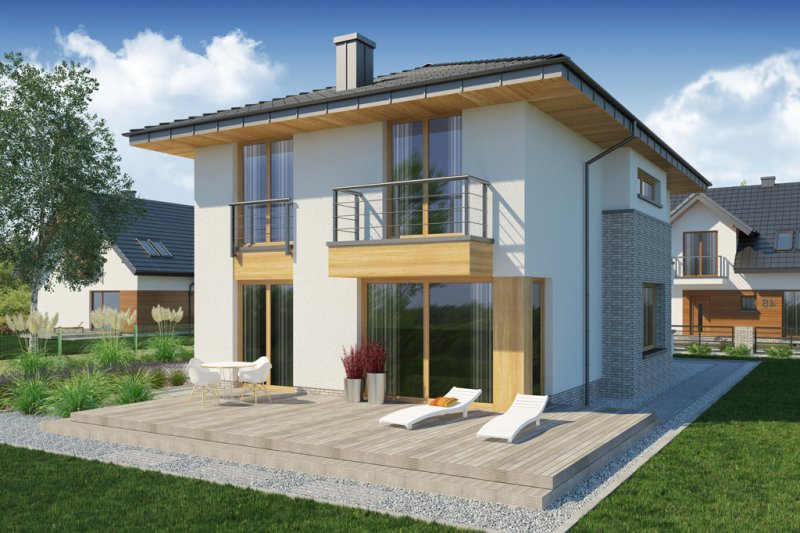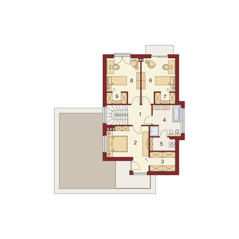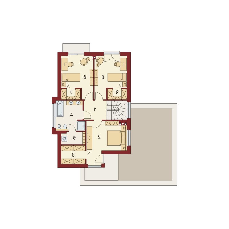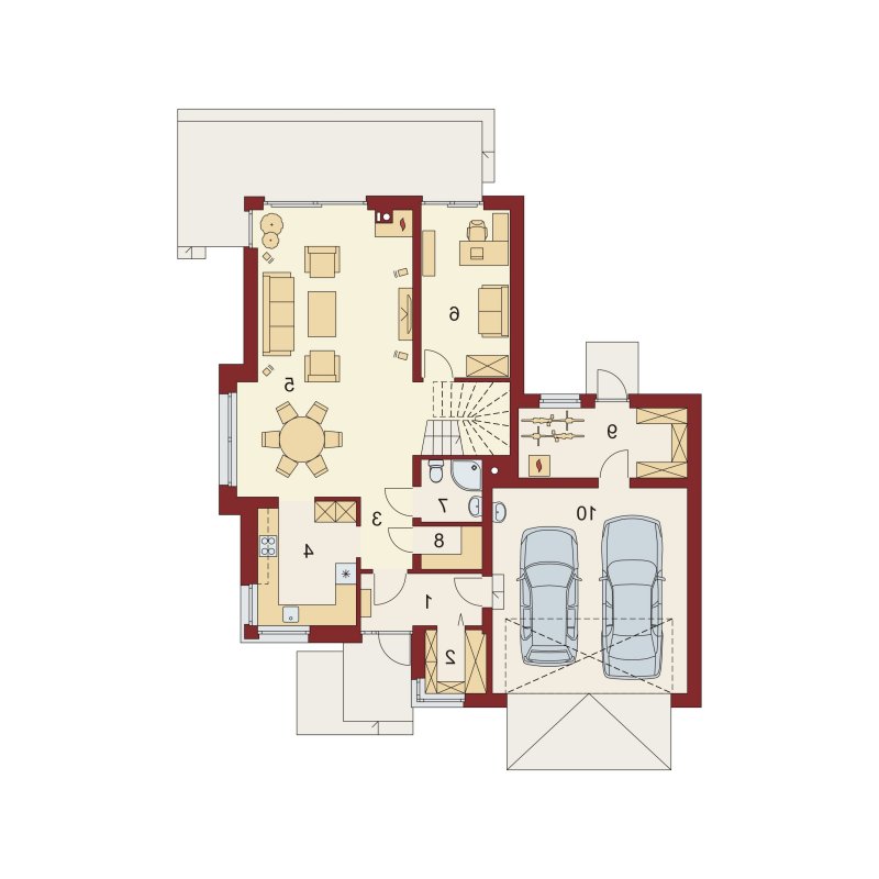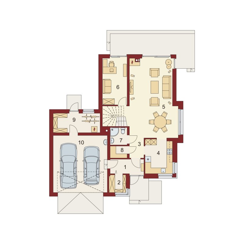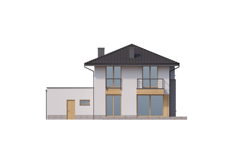 DEMETER 2 PS to nowoczesny piętrowy dom, zaprojektowany z myślą o 4-5-osobowej rodzinie. Przedsionek zapewnia bezpośredni dostęp do praktycznego pomieszczenia gospodarczego, garażu i części dziennej budynku. Obszerną kuchnię, uzupełnioną spiżarnią i wydzieloną ściankami działowymi, można według upodobań zamknąć drzwiami bądź całkowicie otworzyć na położoną dalej jadalnię i salon. Z drugiej strony salonu znajduje się z kolei gabinet z dyskretnym wejściem pod schodami. Funkcjonalność parteru uzupełnia łazienka, oraz zlokalizowana za dwustanowiskowym garażem, duża kotłownia z praktycznym wyjściem na zewnątrz.