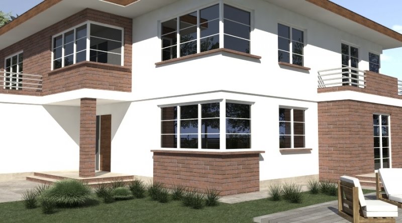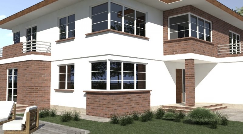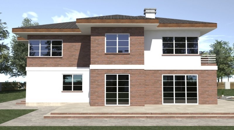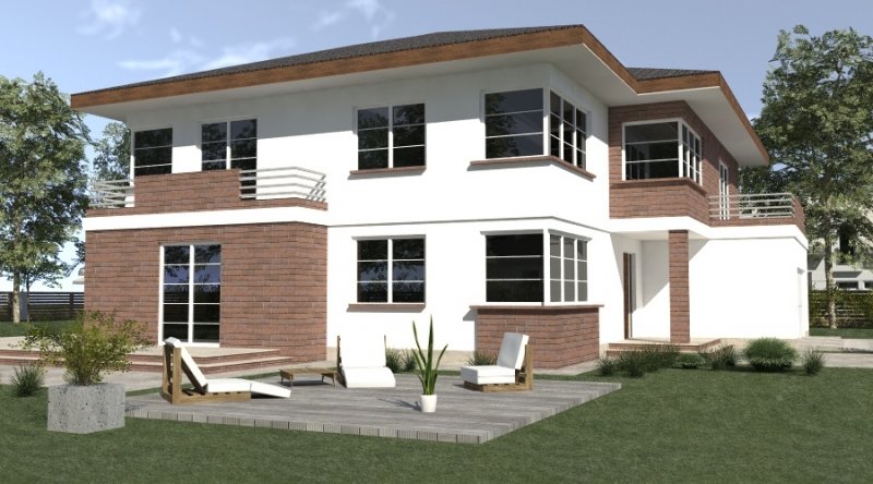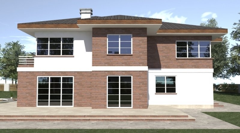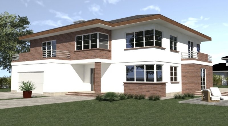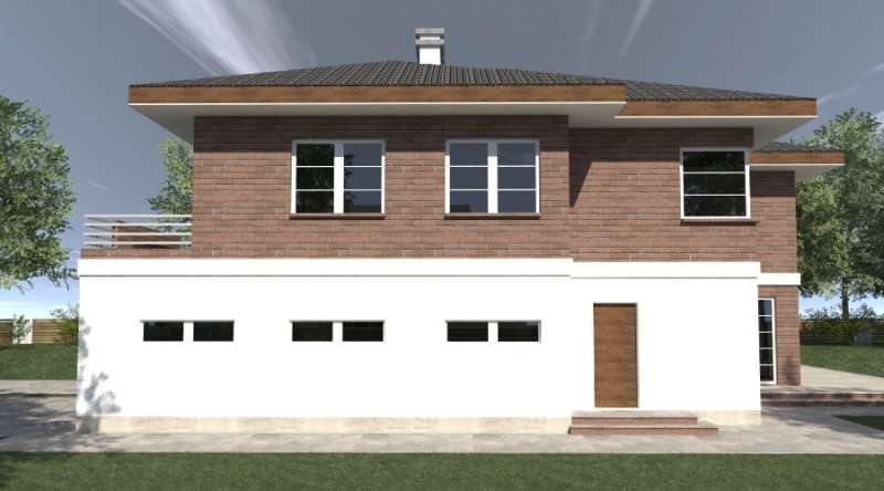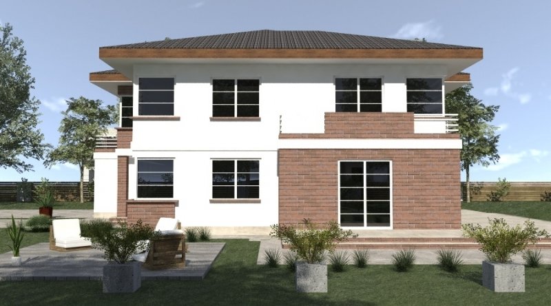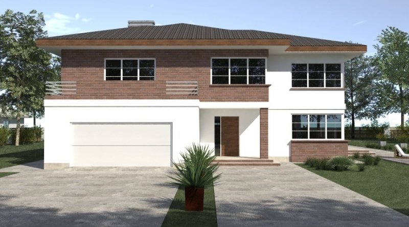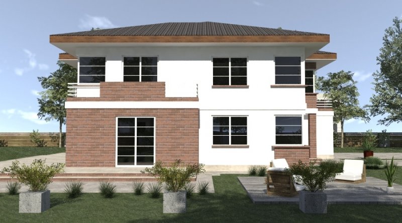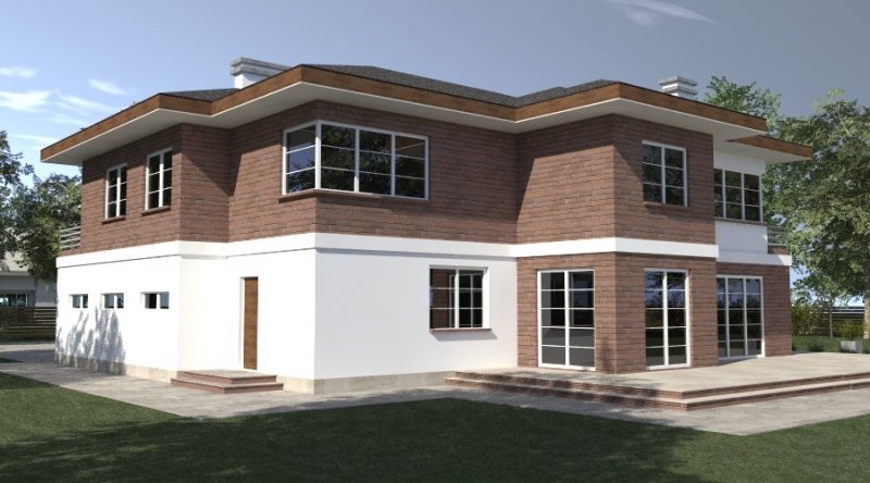 projekt domu piętrowego. dom posiada architekturę współczesnej willi podmiejskiej z nowoczesnymi akcentami. parter domu posiada układ otwarty. klatka schodowa jest ażurowa i tworzy wspólnie z salonem i kuchnią jedną wspólną przestrzeń. w kuchni można wykonać tzw. "wyspę". część gospodarcza to szeroki, wygodny garaż oraz dosyć duża przestrzeń pomocnicza.jedno z pomieszczeń gospodarczych posiada wyłącznie wejście od zewnątrz i jest przeznaczone na przechowywanie przyrządów i materiałów niezbędnych do pielęgnacji ogrodu i otoczenia domu. na piętrze domu zaprojektowano 3 duże sypialnie z dostepem do obszernych łazienek ( które mogą pełnić funkcje pokojów kąpielowych ). hall na piętrze jest duży i bardzo dobrze doświetlony. znajduje się w nim miejsce na obszerną szafę.