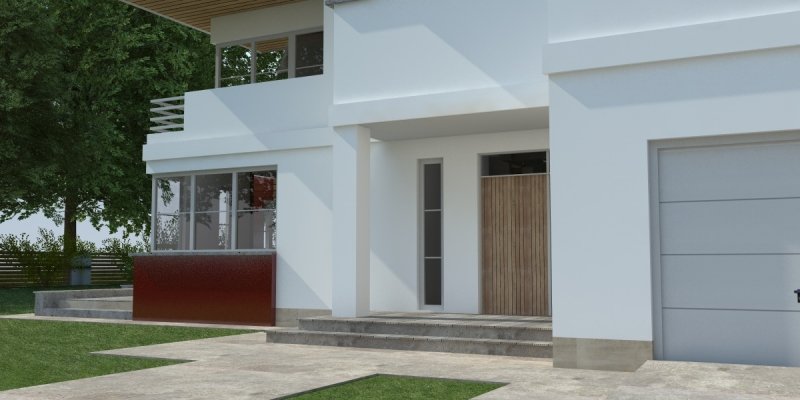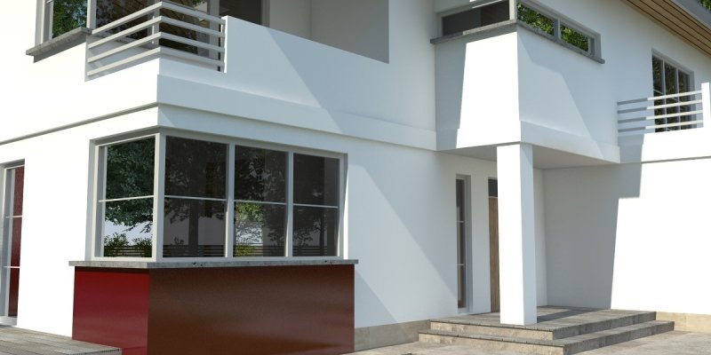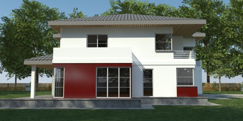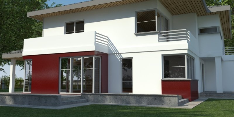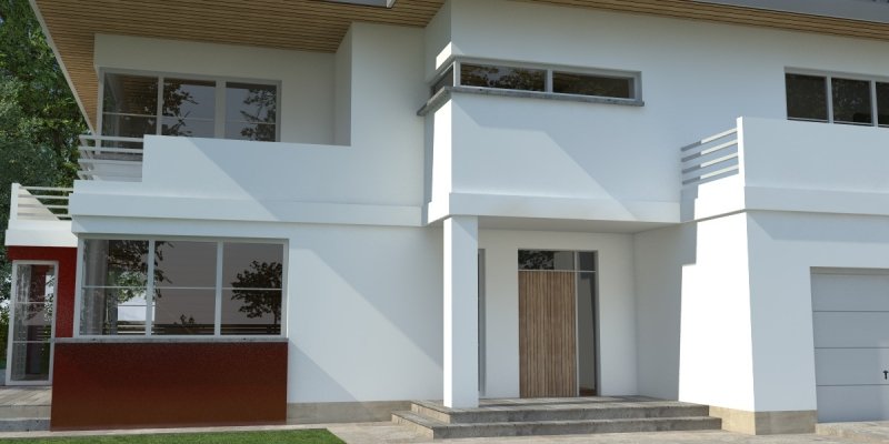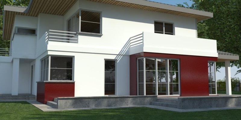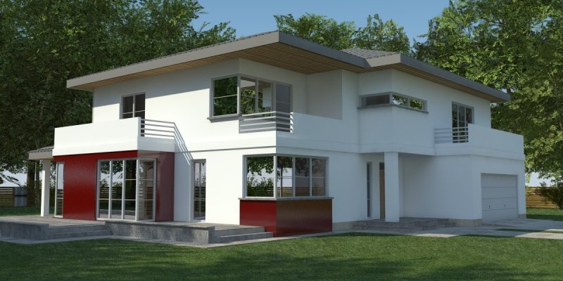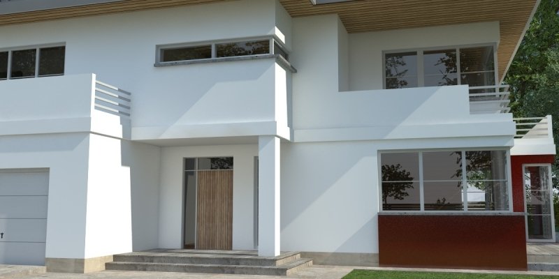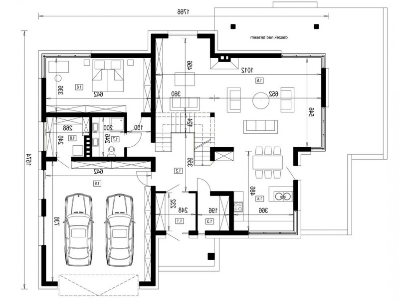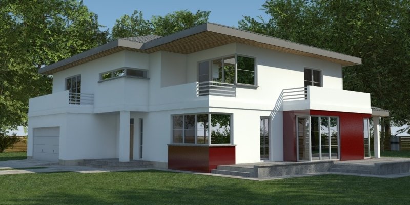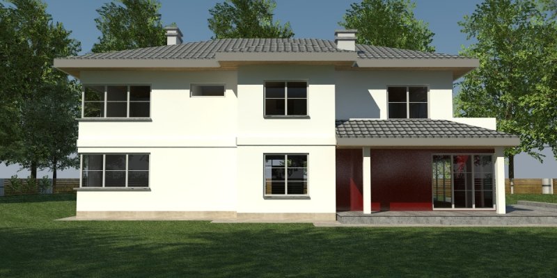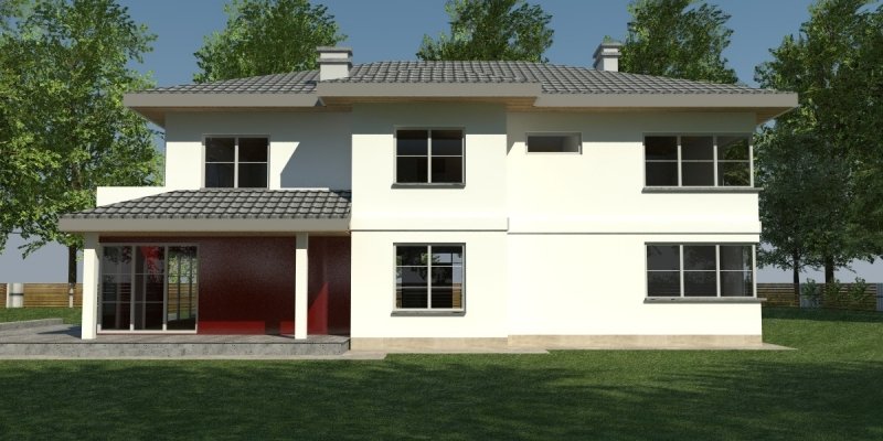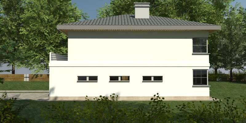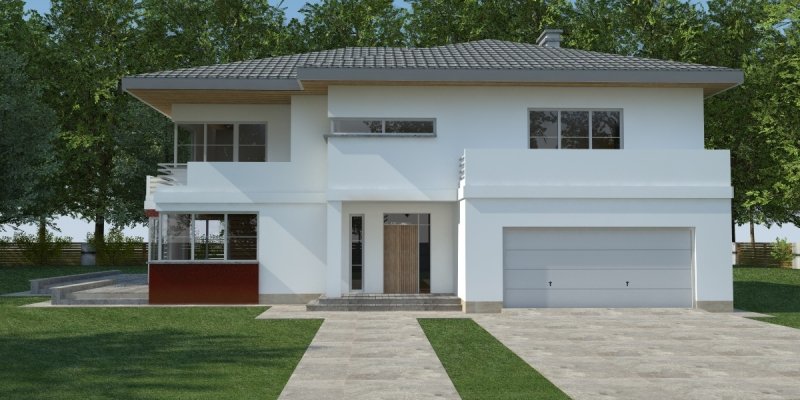projekt willi podmiejskiej o architekturze współczesnej. parter domu tworzy otwartą przestrzeń na którą składa sie duży salon, kuchnia z jadalnią oraz ażurowa klatka schodowa. kuchnia w stylu nowoczesnym z miejscem na wolnostojącą "wyspę" . piętro domu ma charakter strefy nocnej w skład której wchodzą sypialnie z garderobami oraz pomieszczeniami sanitarnymi. dom posiada duże, przestronne pomieszczenia .