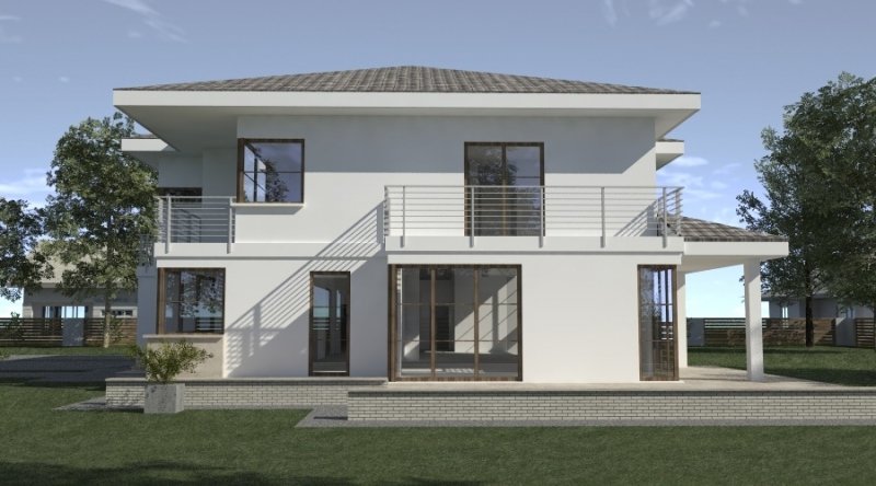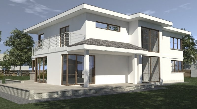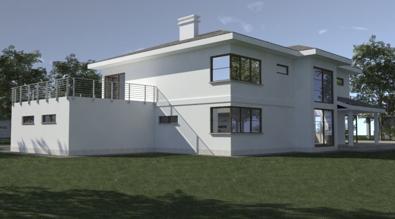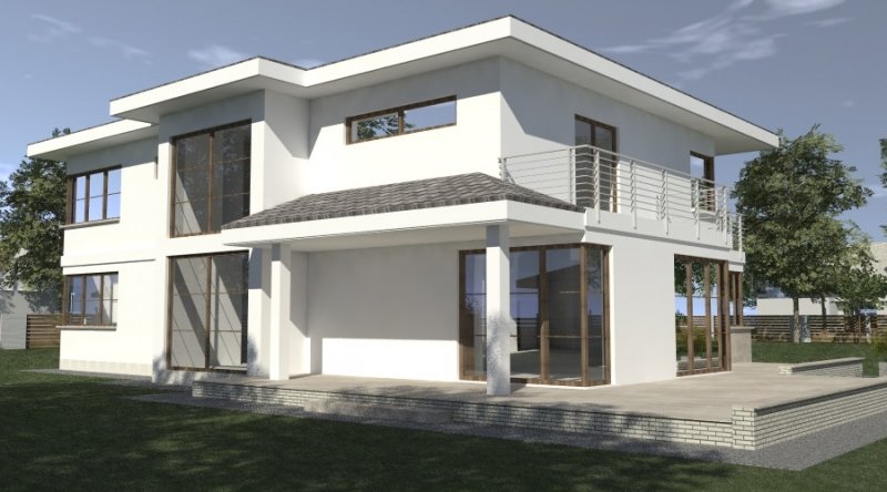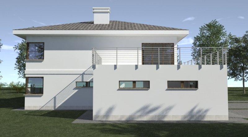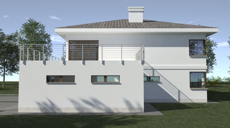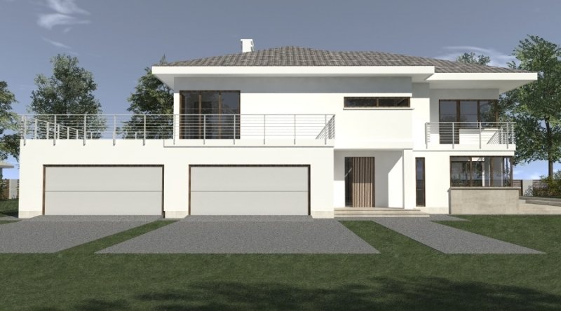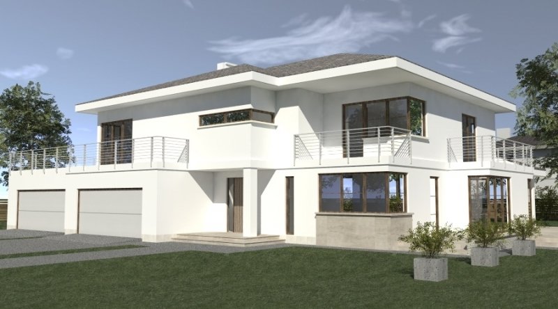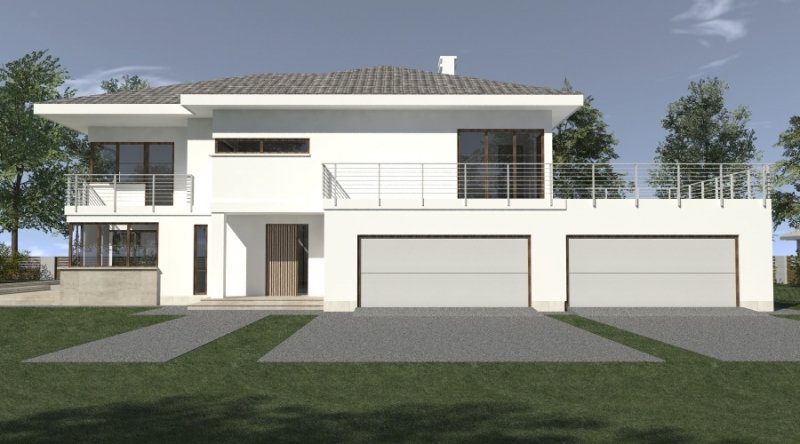 Projekt willi podmiejskiej o architekturze współczesnej. Parter domu tworzy otwartą przestrzeń, na którą składa sie duży salon, kuchnia z jadalnią. Kuchnia w stylu nowoczesnym z miejscem na wolnostojącą "wyspę". Piętro domu ma charakter strefy nocnej, w skład której wchodzą sypialnie z garderobami oraz pomieszczeniami sanitarnymi. Dom posiada duże, przestronne pomieszczenia. Na piętrze zamiast "pustki nad salonem" można wykonać 2 dodatkowe sypialnie. Projekt posiada garaż na 4 samochody osobowe. Istnieje możliwość zmniejszenia garażu do 2 stanowisk.