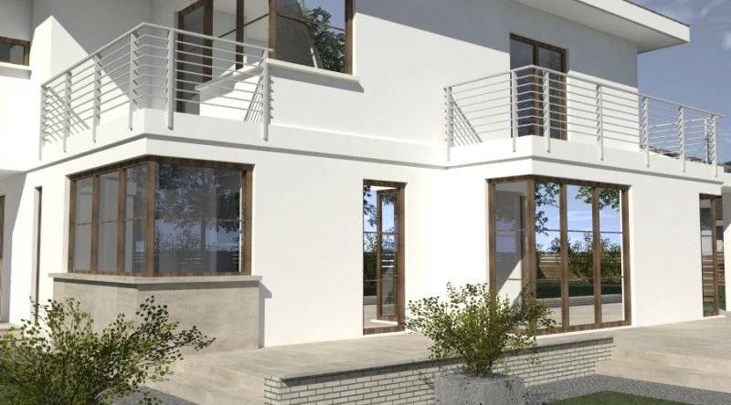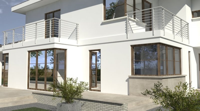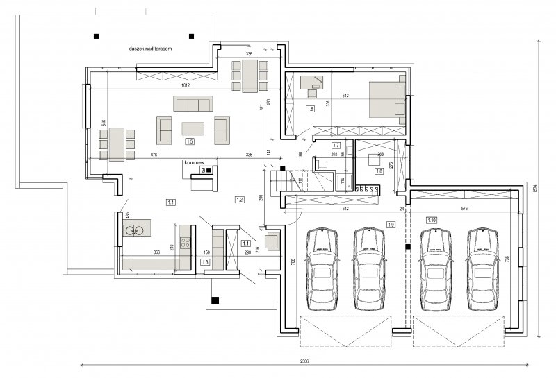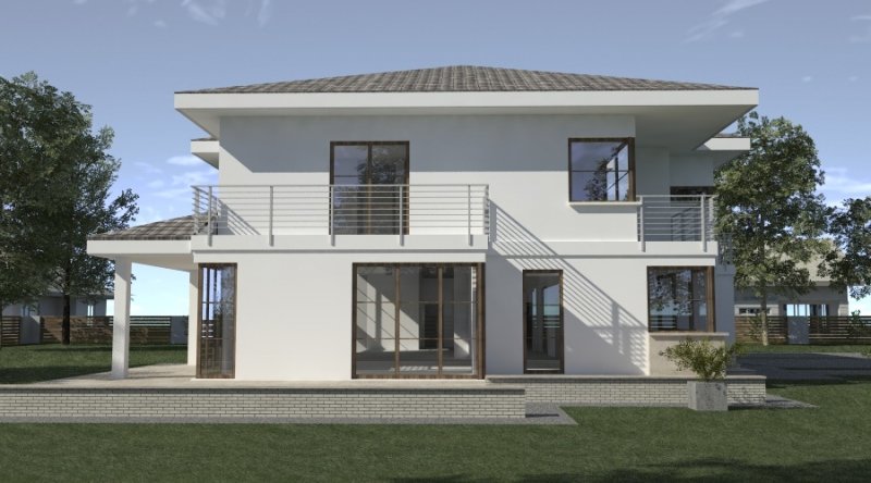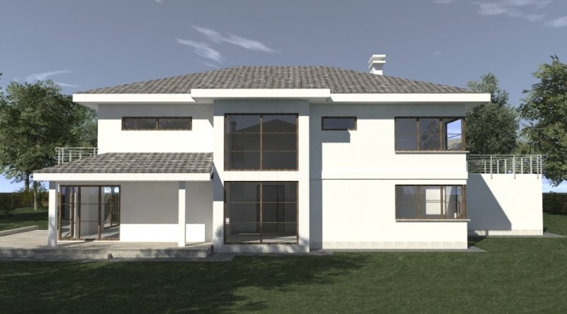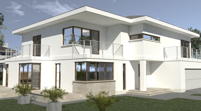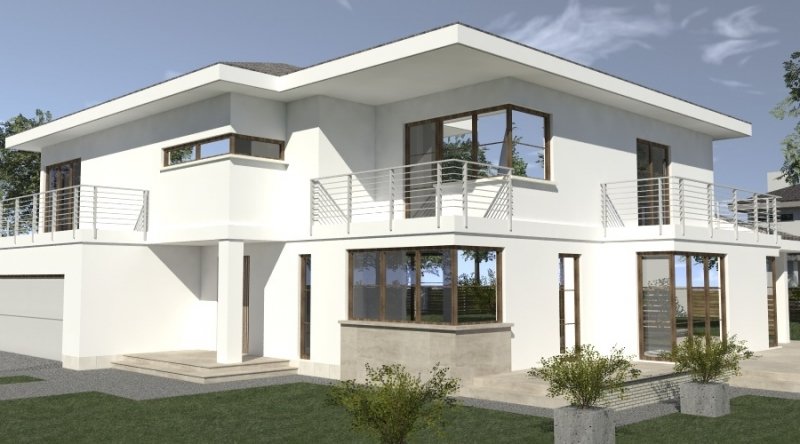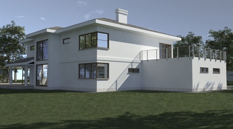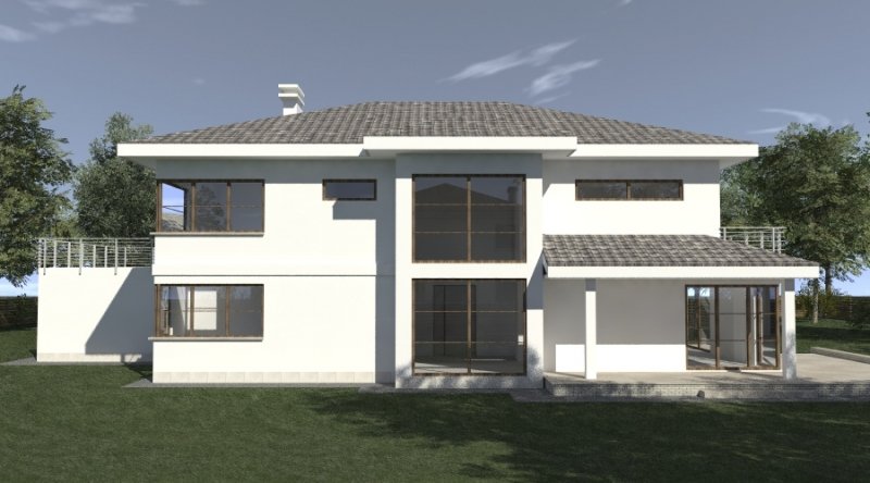 Projekt willi podmiejskiej o architekturze współczesnej. Parter domu tworzy otwartą przestrzeń, na którą składa sie duży salon, kuchnia z jadalnią. Kuchnia w stylu nowoczesnym z miejscem na wolnostojącą "wyspę". Piętro domu ma charakter strefy nocnej, w skład której wchodzą sypialnie z garderobami oraz pomieszczeniami sanitarnymi. Dom posiada duże, przestronne pomieszczenia. Na piętrze zamiast "pustki nad salonem" można wykonać 2 dodatkowe sypialnie. Projekt posiada garaż na 4 samochody osobowe. Istnieje możliwość zmniejszenia garażu do 2 stanowisk.