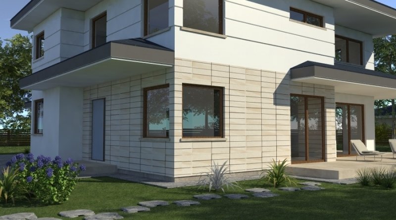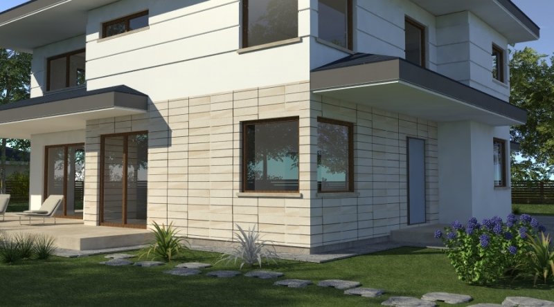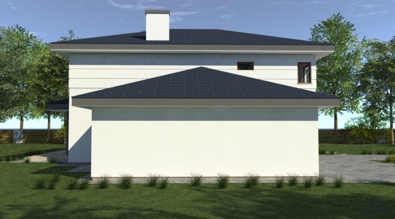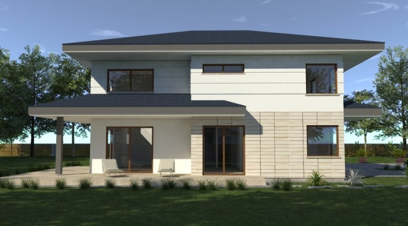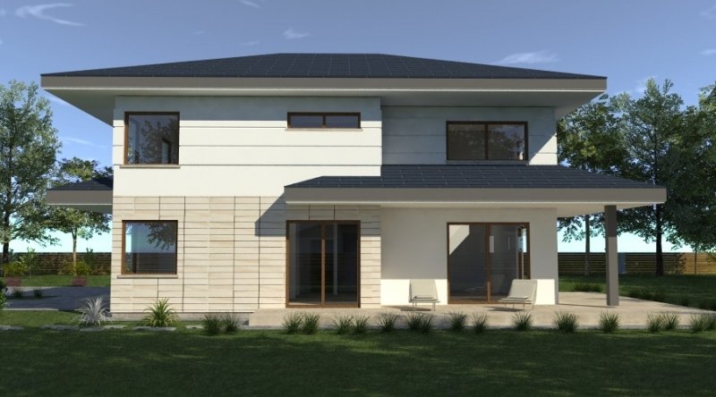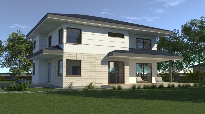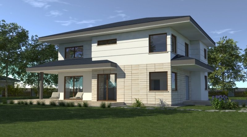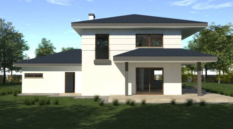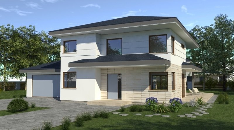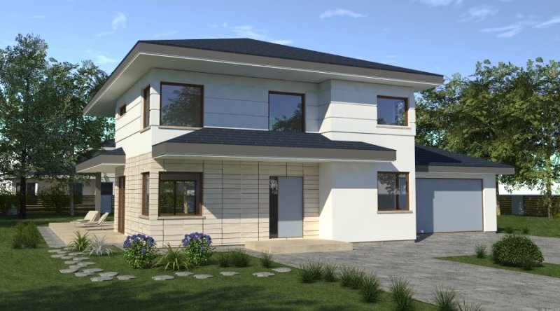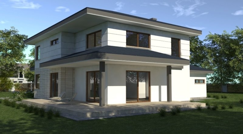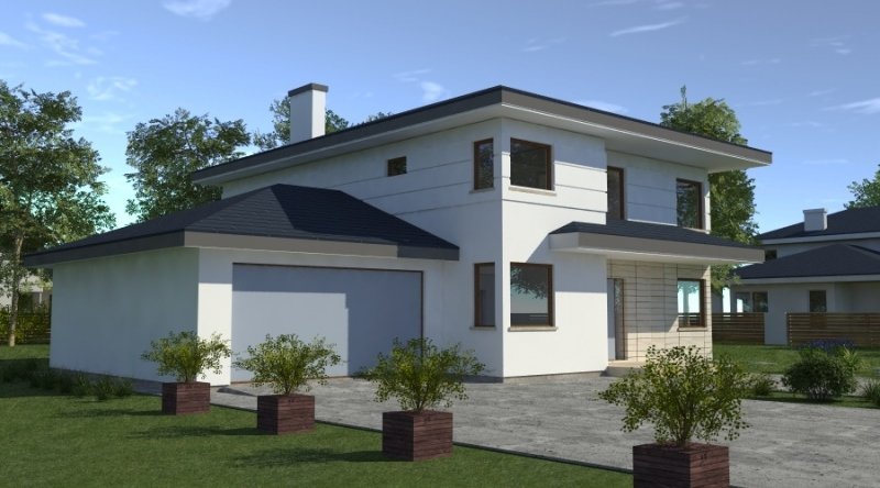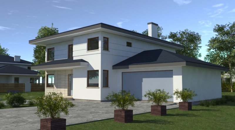 dom o architekturze współczesnej do realizacji na działkach podmiejskich umożliwiających postawienie domu piętrowego. układ domu jest prosty i przejrzysty, na parterze część dzienna - kuchnia z możliwością montażu tzw"wyspy" , duży salon, duże pomieszczenie gospodarcze z wyjściem na ogród, wygodny garaż na 2 samochody. na piętrze umieszczono pomieszczenia charakterystyczne dla strefy nocnej czyli : sypialnie oraz łazienki i garderoby.