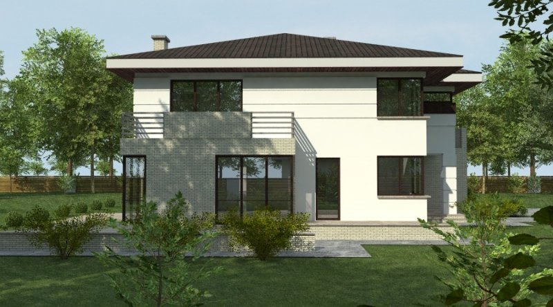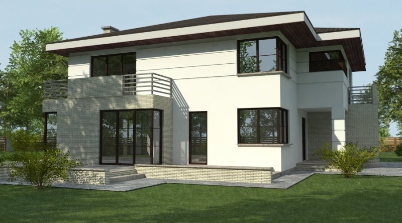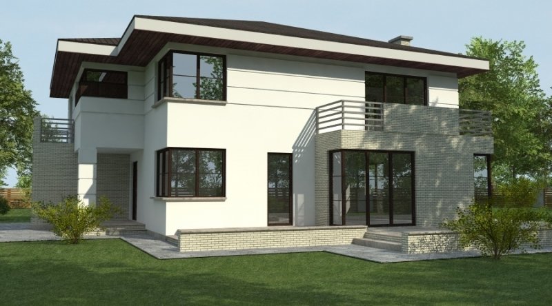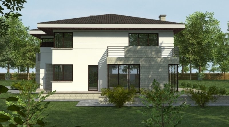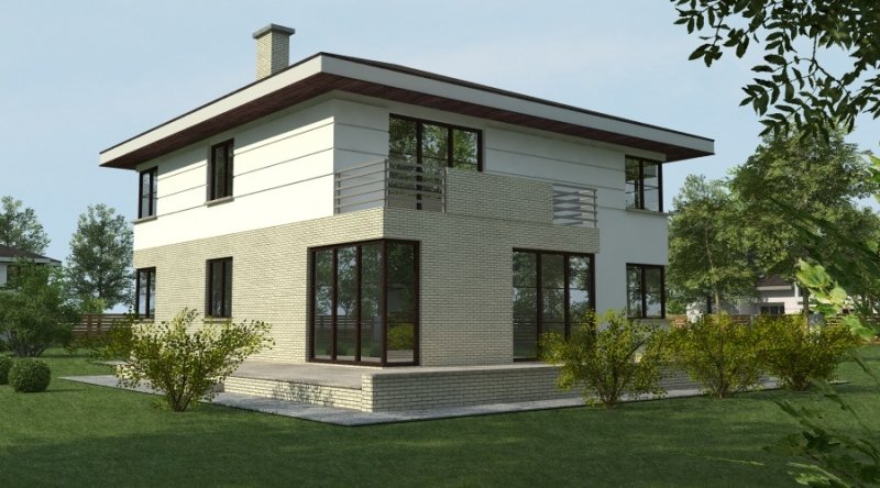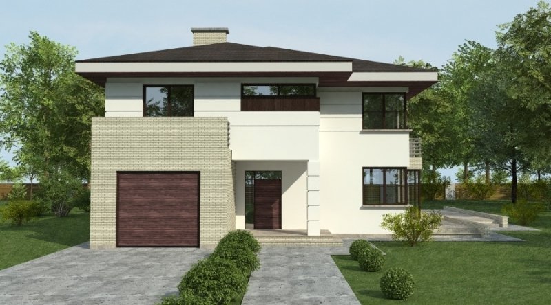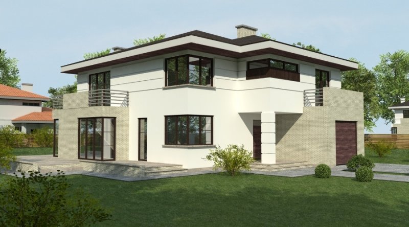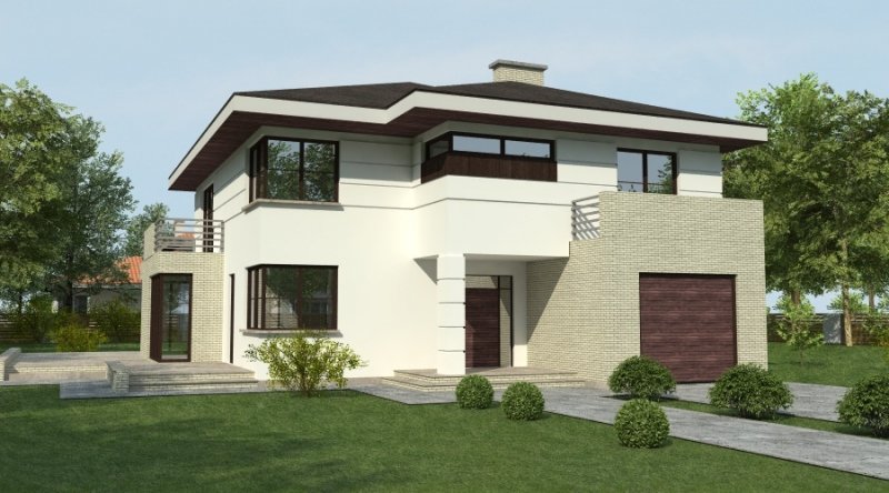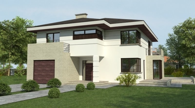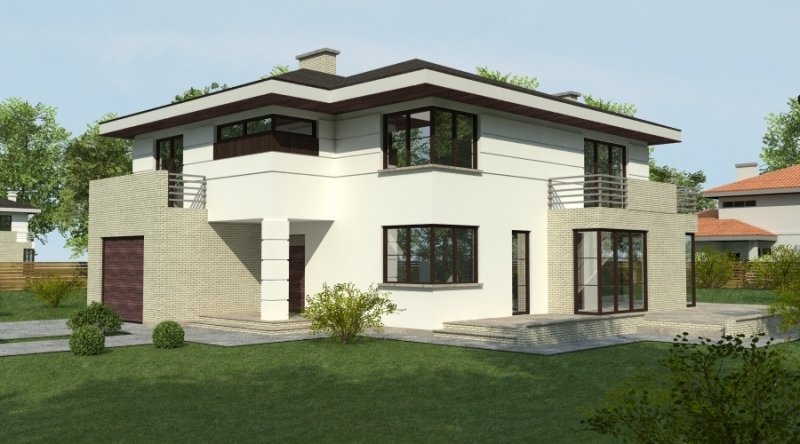 projekt domu podmiejskiego o architekturze współczesnej. parter domu tworzy otwartą przestrzeń na którą składa sie salon, kuchnia z jadalnią oraz ażurowa klatka schodowa. kuchnia możliwa do wykonania w stylu nowoczesnym z miejscem na wolnostojącą "wyspę" . piętro domu ma charakter strefy nocnej w skład której wchodzą 4 sypialnie z garderobami oraz pomieszczeniami sanitarnymi. w bryle budynku znajduje się wbudowany garaż 1-stanowiskowy .