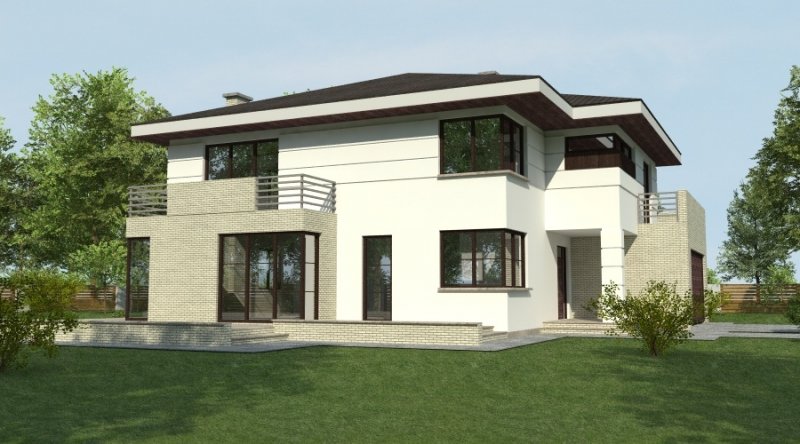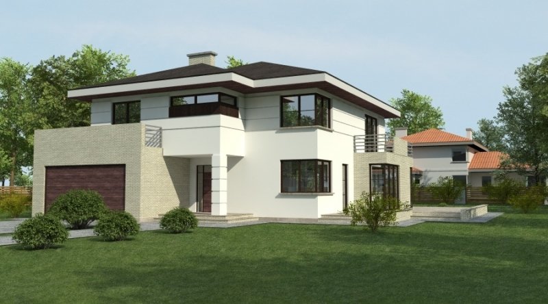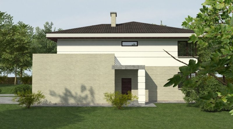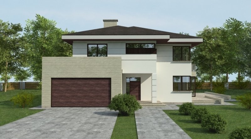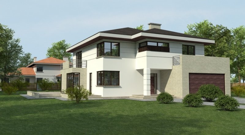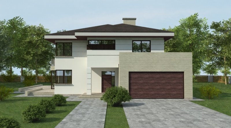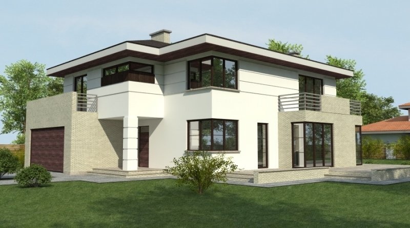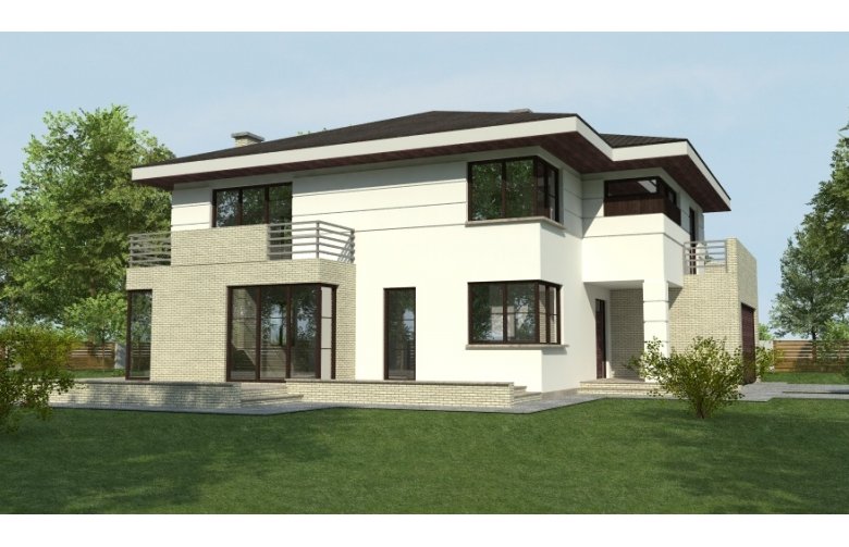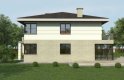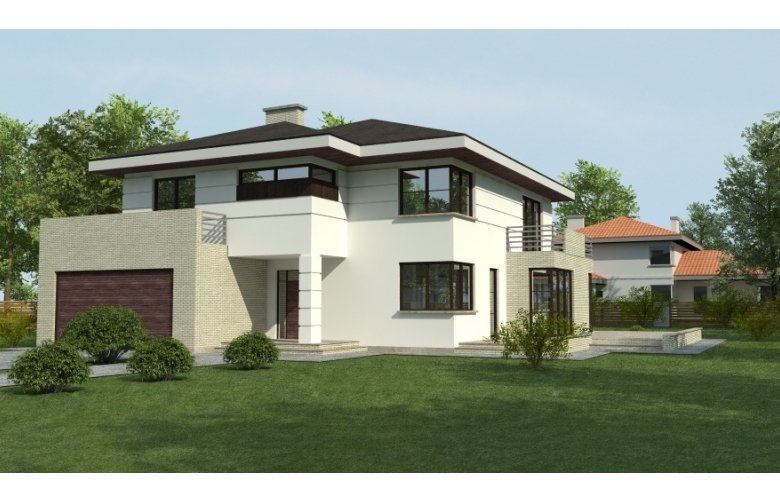 Projekt domu podmiejskiego o architekturze współczesnej. Parter domu tworzy otwartą przestrzeń, na którą składa się salon, kuchnia z jadalnią oraz ażurowa klatka schodowa. Kuchnia możliwa do wykonania w stylu nowoczesnym z miejscem na wolnostojącą "wyspę". Piętro domu ma charakter strefy nocnej, w skład której wchodzą 4 sypialnie z garderobami oraz pomieszczeniami sanitarnymi. W bryle budynku znajduje się wbudowany garaż 2-stanowiskowy.