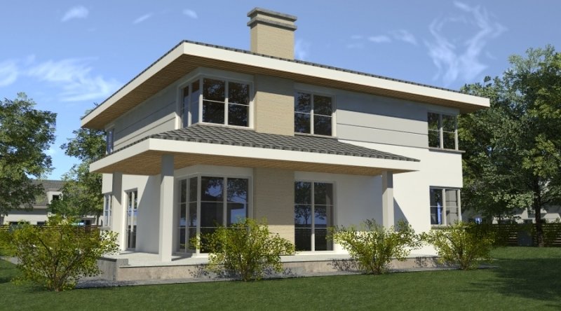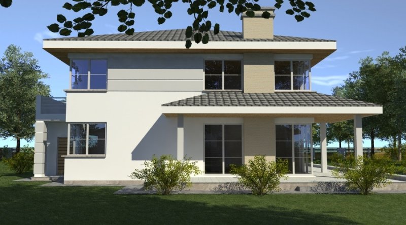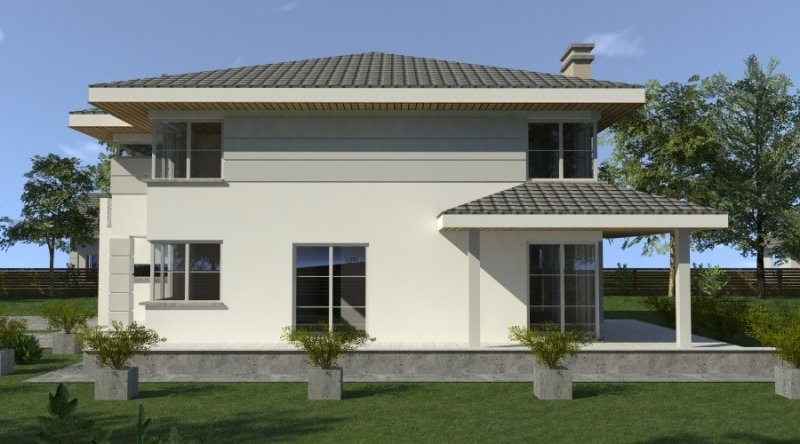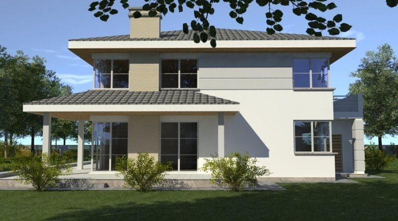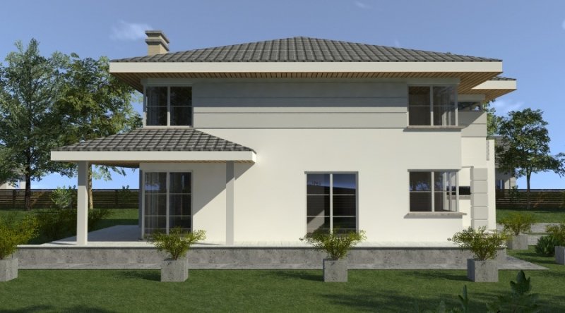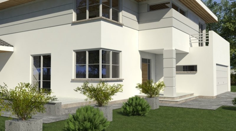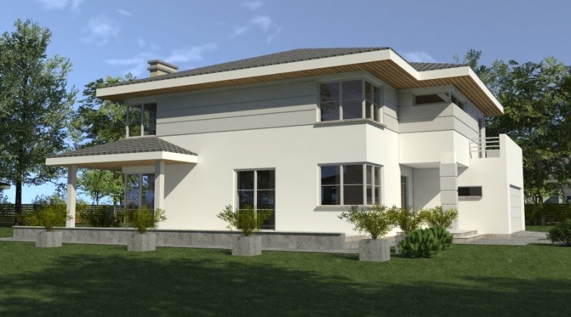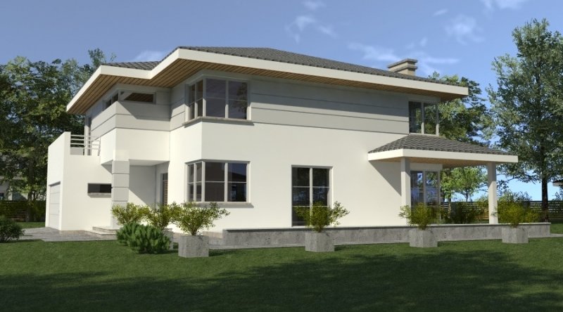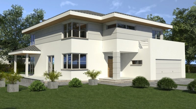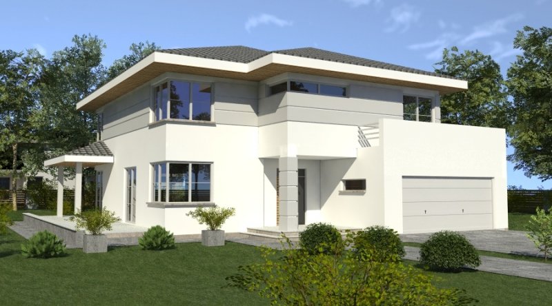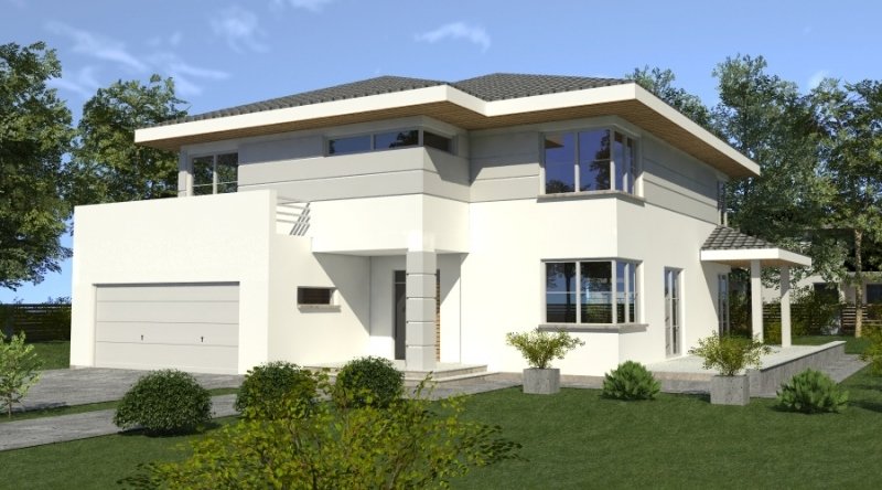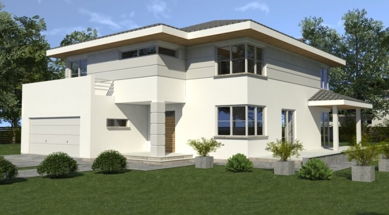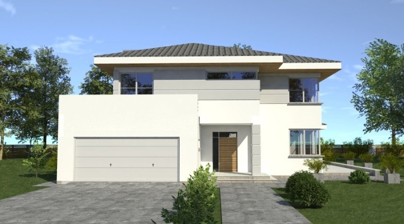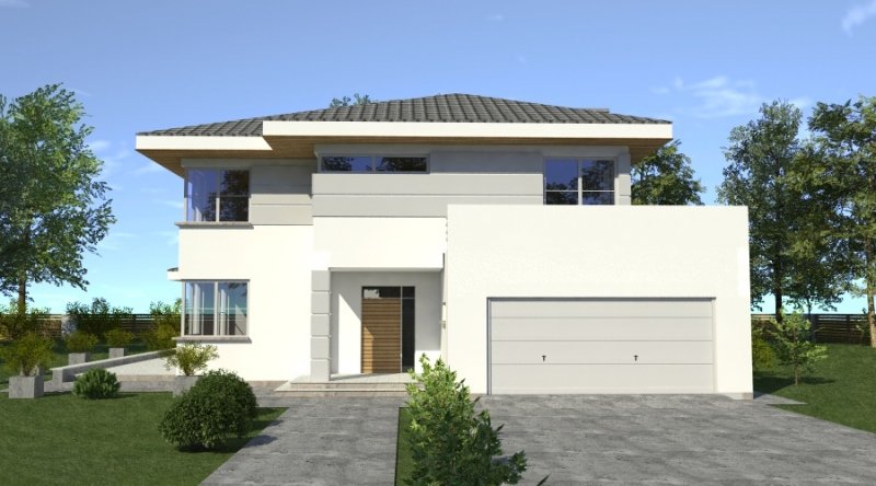 Dom piętrowy w stylu willi miejskiej o współczesnym wyglądzie. Na parterze kuchnia z jadalnią i salon tworzą otwartą przestrzeń, z salonu znajduje się wyjście na duży, zadaszony taras. Schody prowadzące na piętro zostały zaprojektowane jako 2-biegowe w stylu nowoczesnym. Na piętrze znajdują się 4 sypialnie. Dom posiada wbudowany, wygodny garaż na 2 samochody osobowe o szerokości 6.10m.