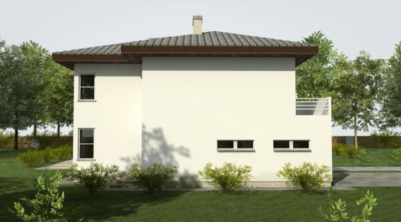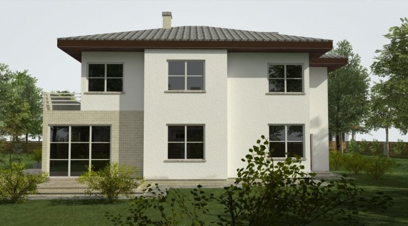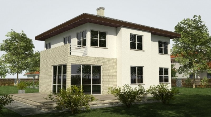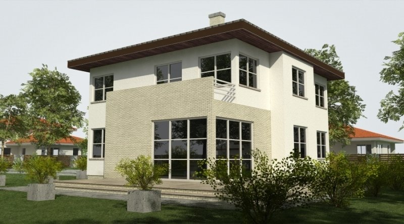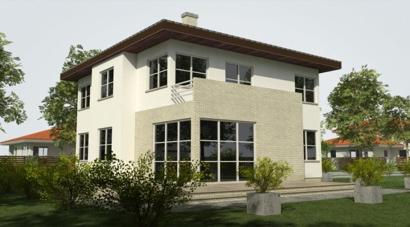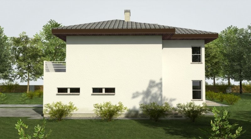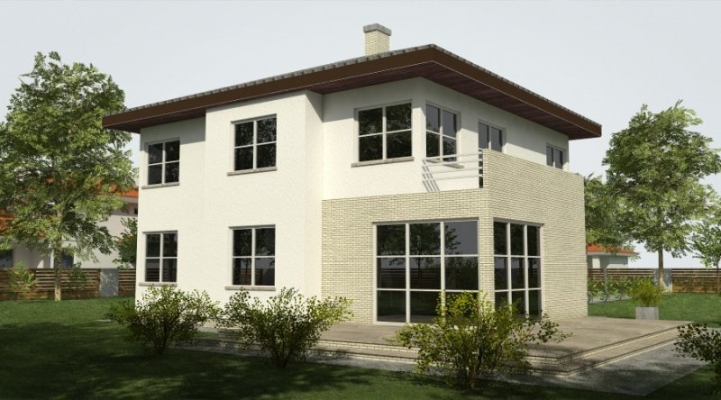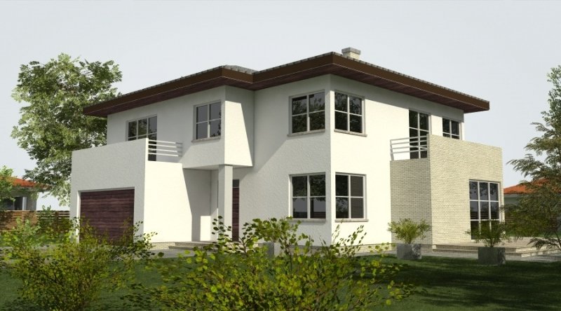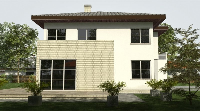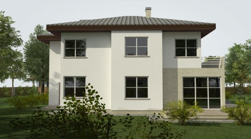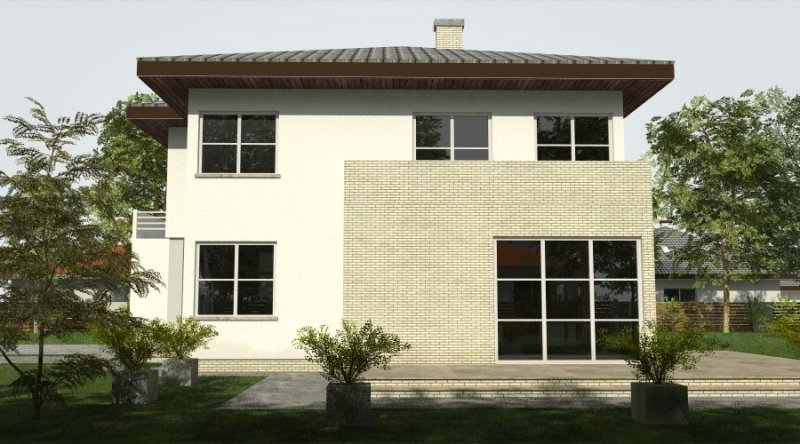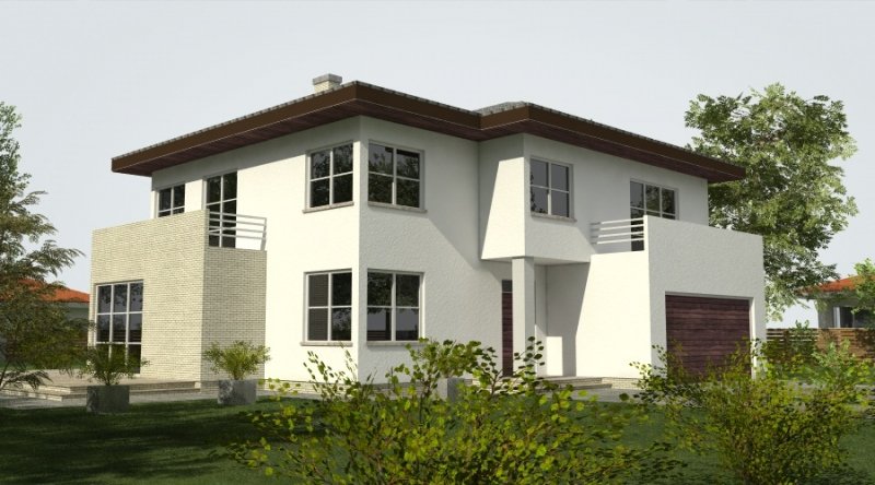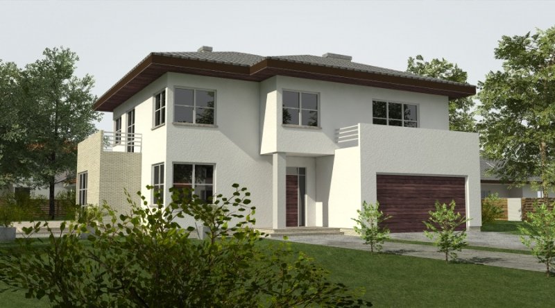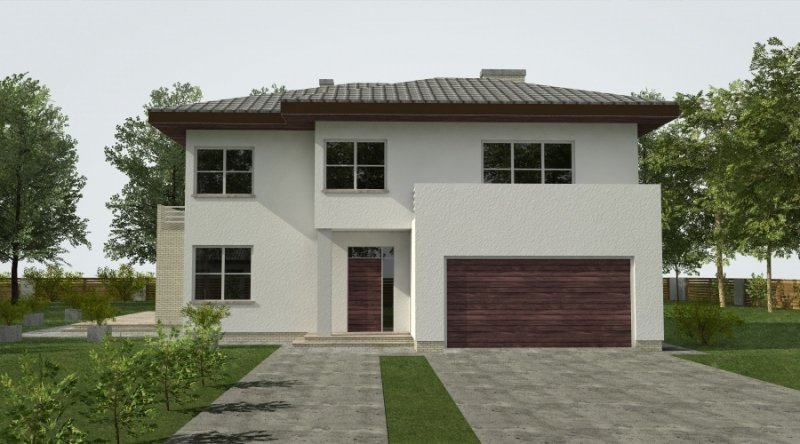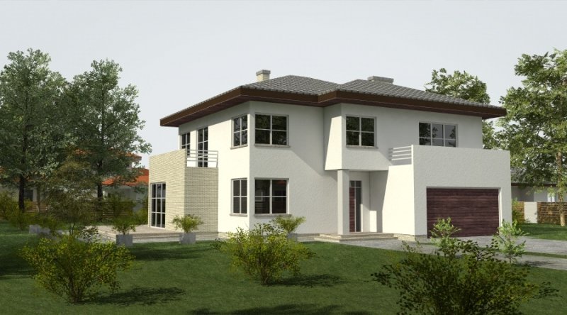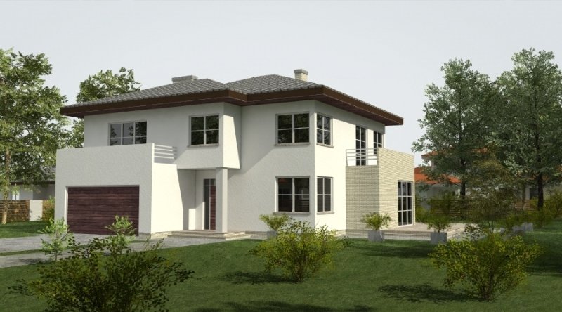 Projekt domu podmiejskiego o architekturze współczesnej. Parter domu tworzy otwartą przestrzeń, na którą składa się salon z otwartą kuchnią. Kuchnia możliwa do wykonania w stylu nowoczesnym z miejscem na wolnostojącą "wyspę". Piętro domu ma charakter strefy nocnej w skład której wchodzą 4 sypialnie z garderobami oraz pomieszczeniami sanitarnymi. W bryle budynku znajduje się wbudowany garaż 2-stanowiskowy.