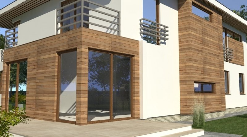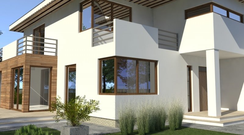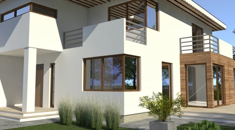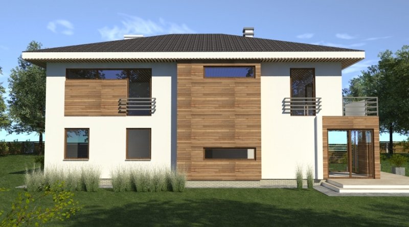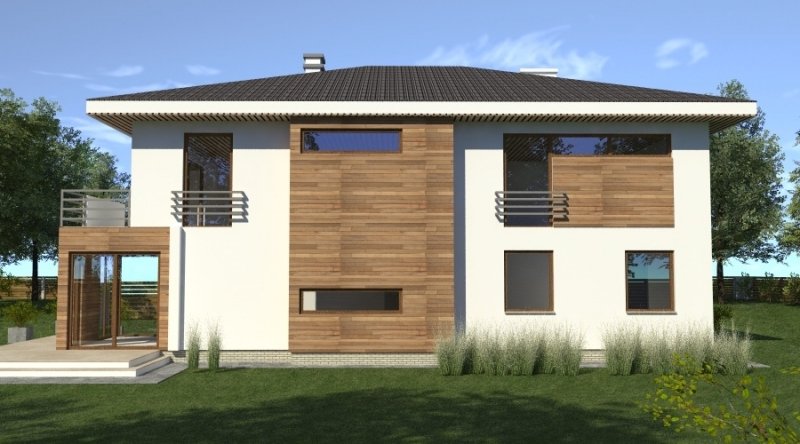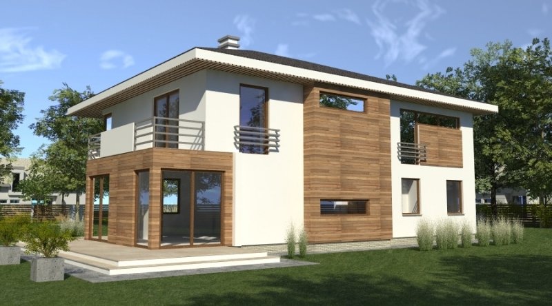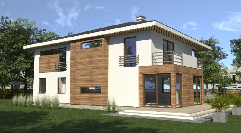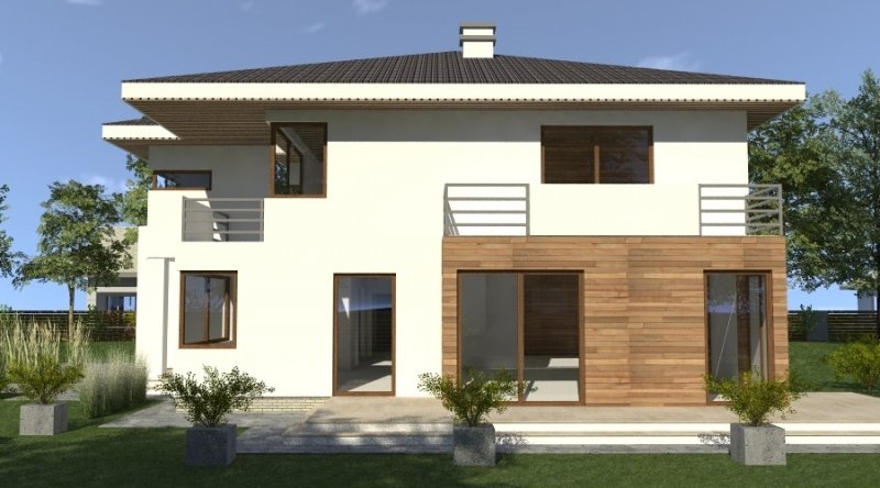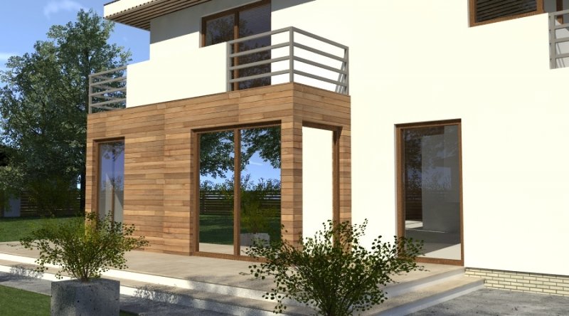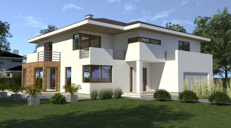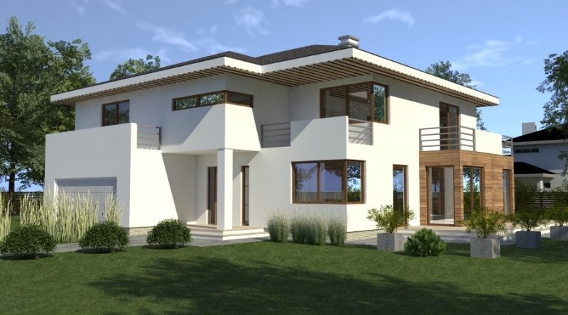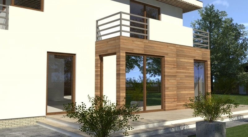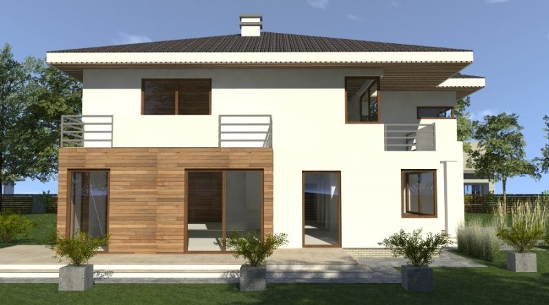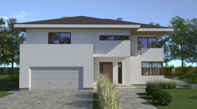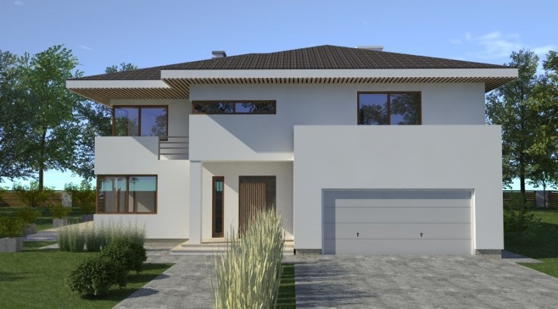 Dom piętrowy w stylu willi miejskiej o współczesnym wyglądzie. Na parterze kuchnia z jadalnią i 2-częściowy salon ( o powierzchni 45m2) tworzą otwartą przestrzeń, kominek znajdujący się w centralnym miejscu domu można wykonać w stylu nowoczesnym. Schody prowadzące na piętro są bardzo wygodne, zaprojektowane jako 3-biegowe ( bez zabiegów ). Na piętrze znajdują się 3 sypianie z własnymi garderobami ( w tym jedna z sypialń posiada prywatną łazienkę i wyjście na zadaszony balkon). Dom posiada wbudowany, wygodny garaż na 2 samochody osobowe o szerokości 6.06m.