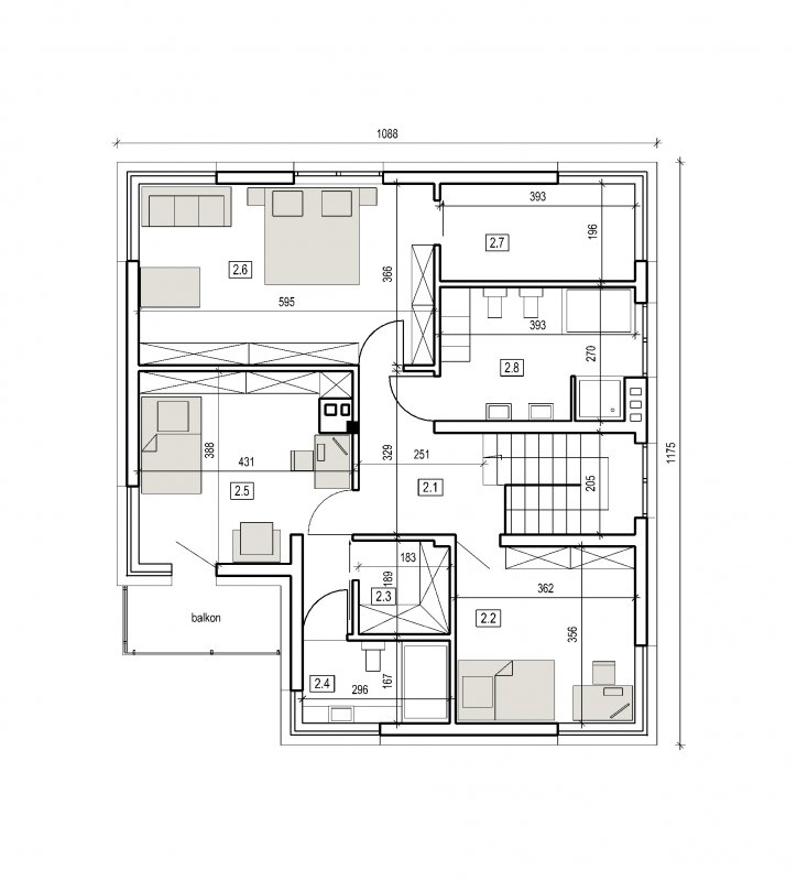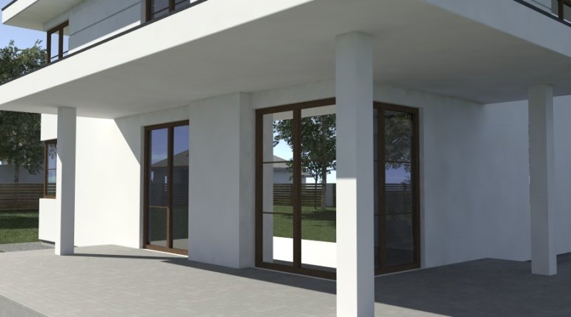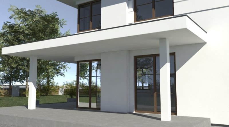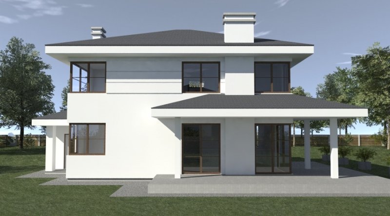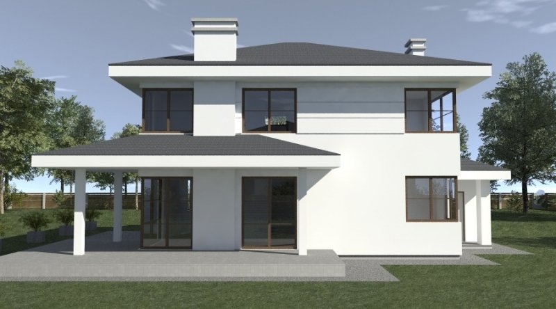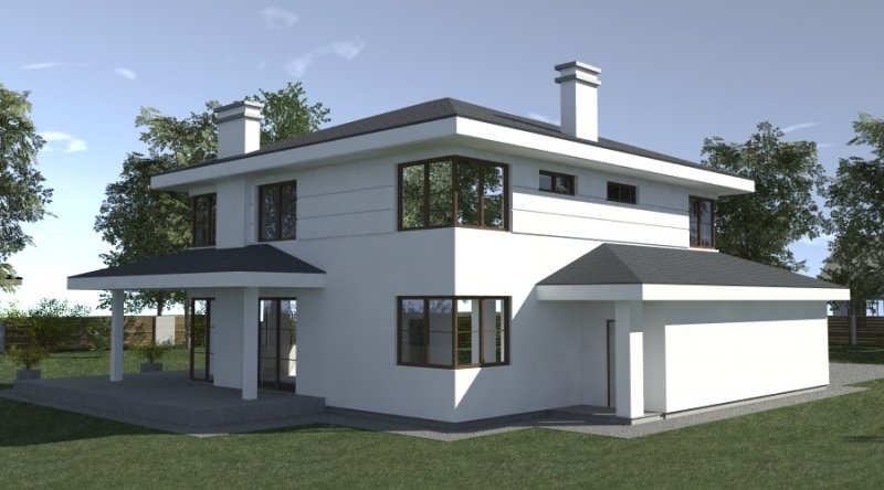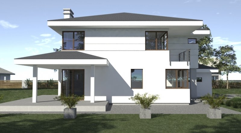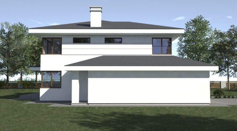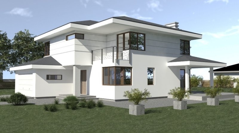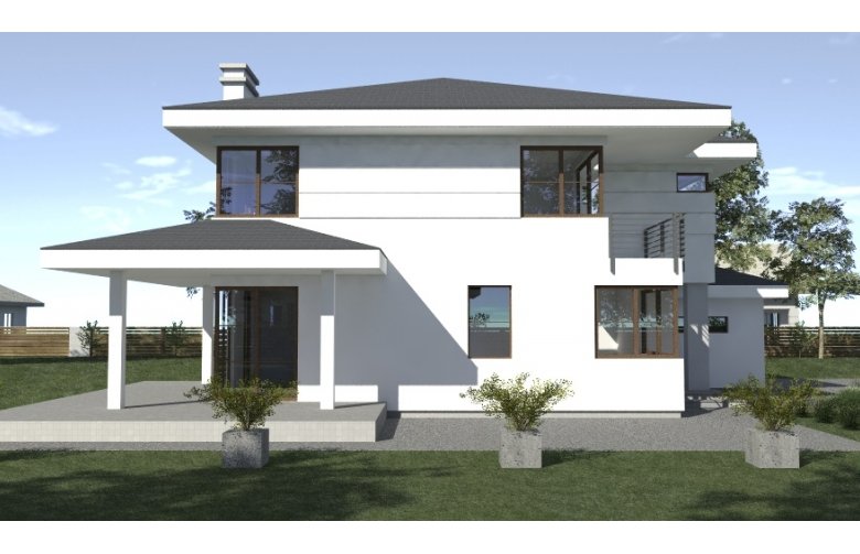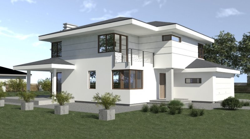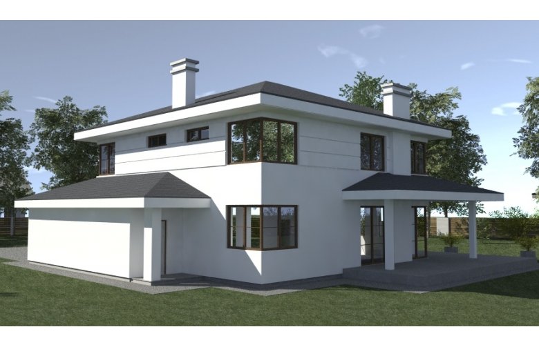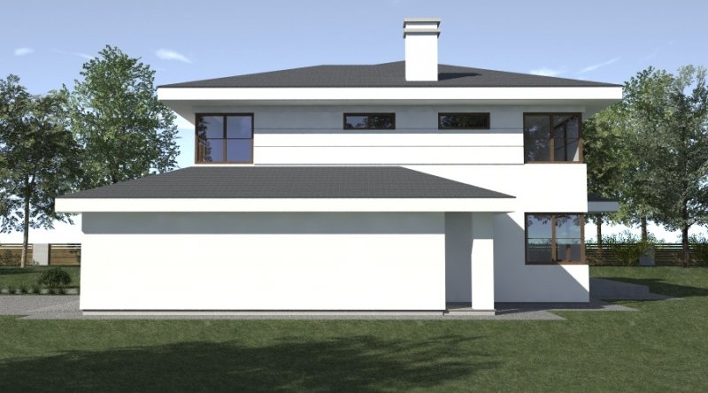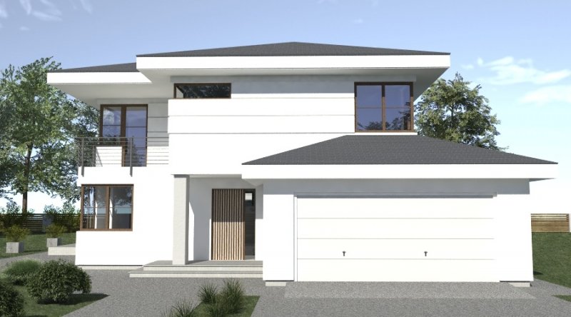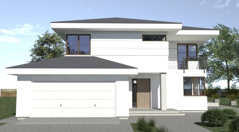 Dom piętrowy w stylu willi miejskiej o współczesnym wyglądzie. Na parterze kuchnia, jadalnia i salon tworzą otwartą przestrzeń. W kuchni można zamontować tzw. "wyspę" kuchenną, kominek znajdujący się w centralnym miejscu domu można wykonać w stylu nowoczesnym. Schody prowadzące na piętro są bardzo wygodne, zaprojektowane jako 2-biegowe ( bez zabiegów ). Na piętrze znajdują się 3 sypianie z własnymi garderobami ( w tym jedna z sypialń posiada prywatną łazienkę i wyjście na zadaszony balkon). Dom posiada wbudowany garaż na 2 samochody osobowe o szerokości 6.05m.