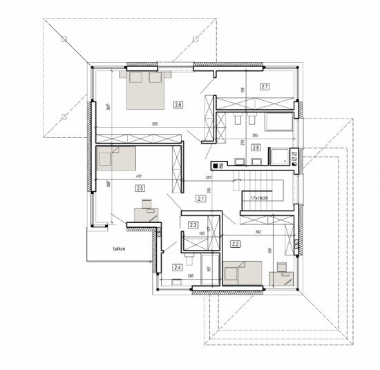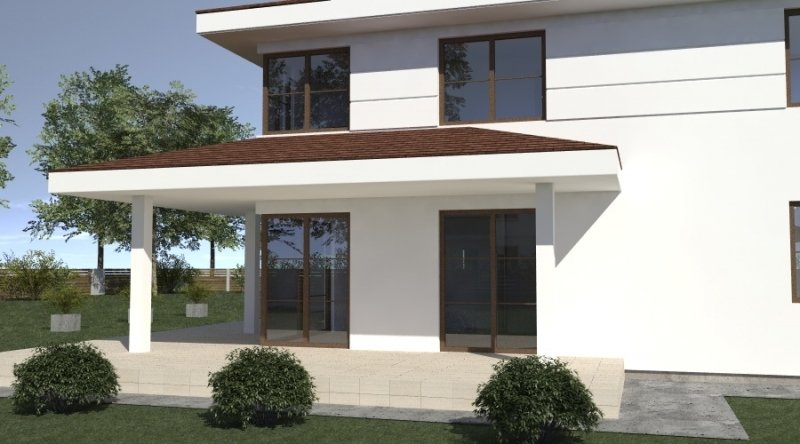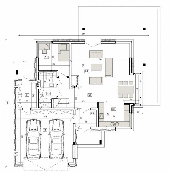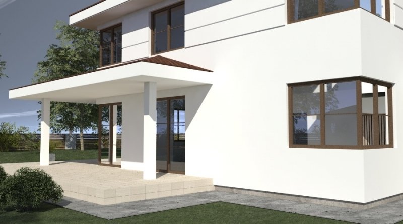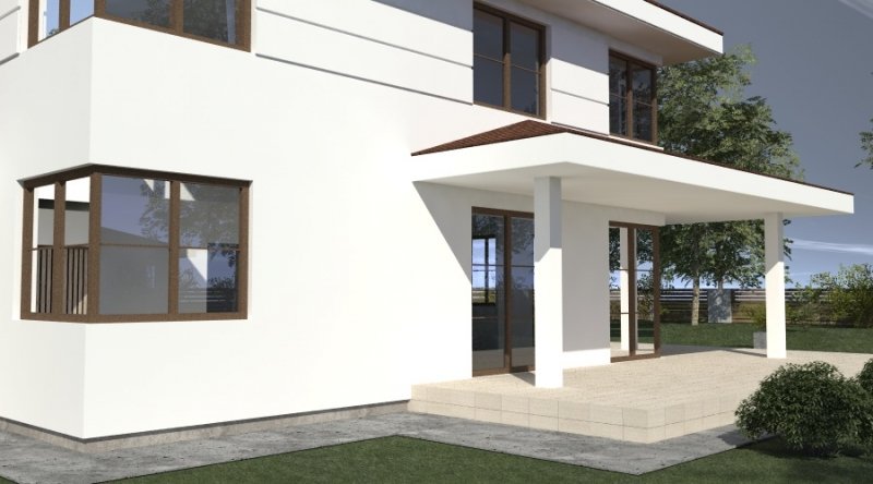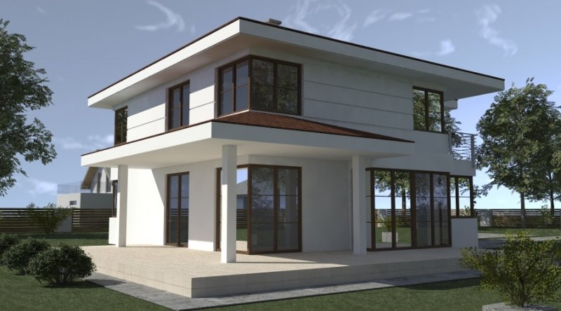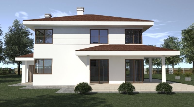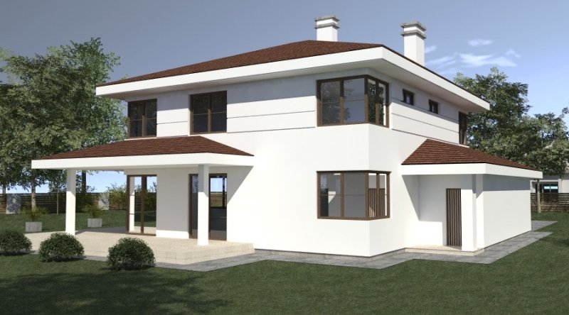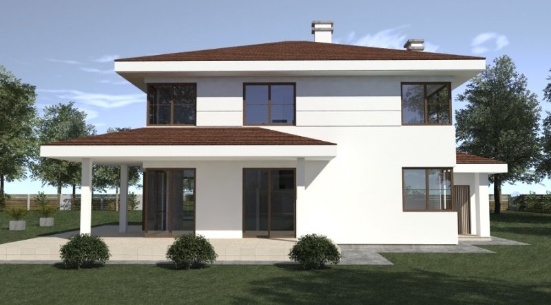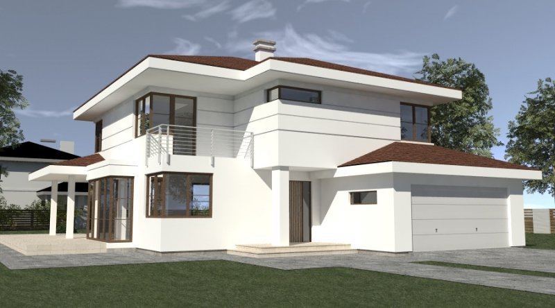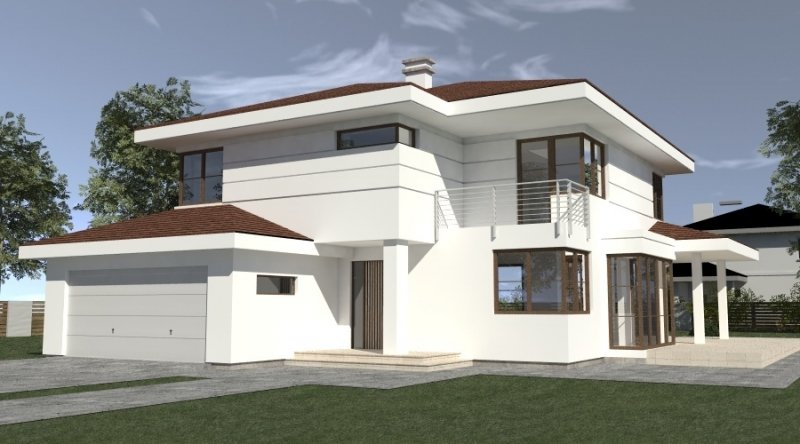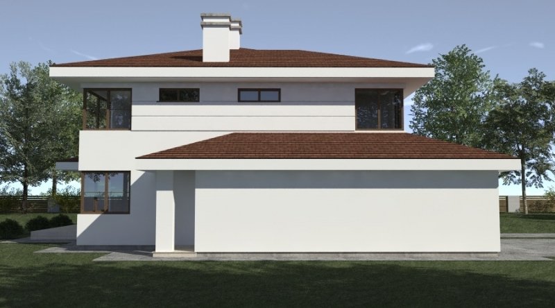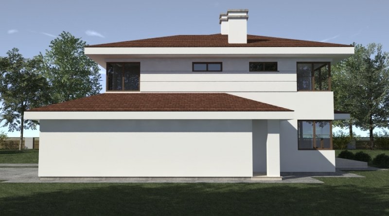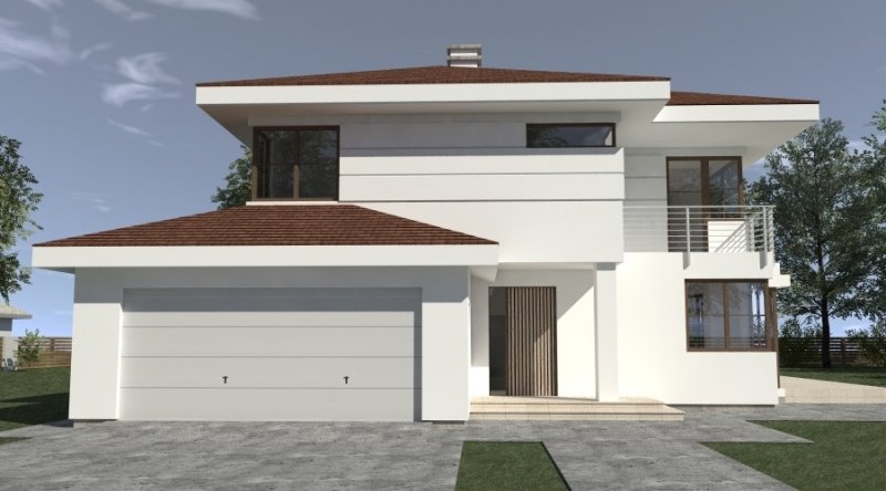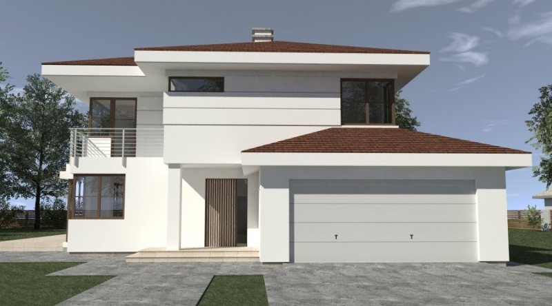 Dom o architekturze współczesnej do realizacji na działkach podmiejskich umożliwiających postawienie domu piętrowego. Układ domu jest prosty i przejrzysty, na parterze część dzienna - kuchnia z możliwością montażu tzw"wyspy", duży salon, pomieszczenie gospodarcze z wyjściem na ogród, wygodny garaż na 2 samochody. Na piętrze umieszczono pomieszczenia charakterystyczne dla strefy nocnej czyli: sypialnie oraz łazienki i garderoby.