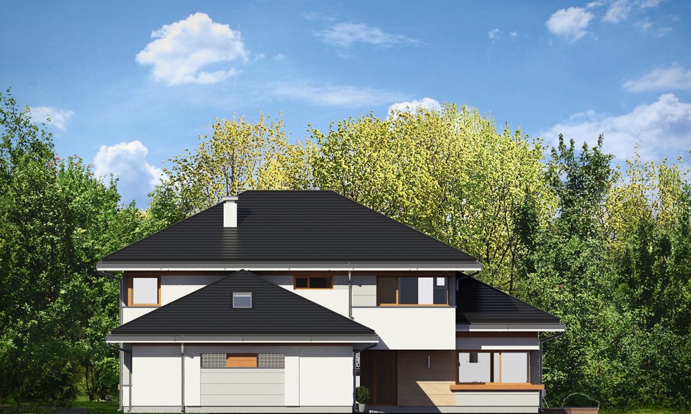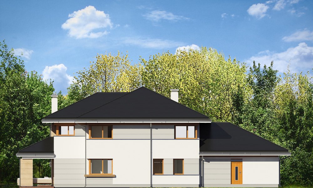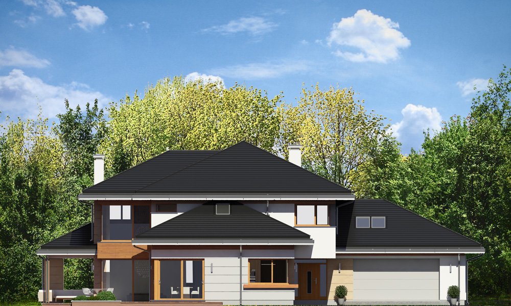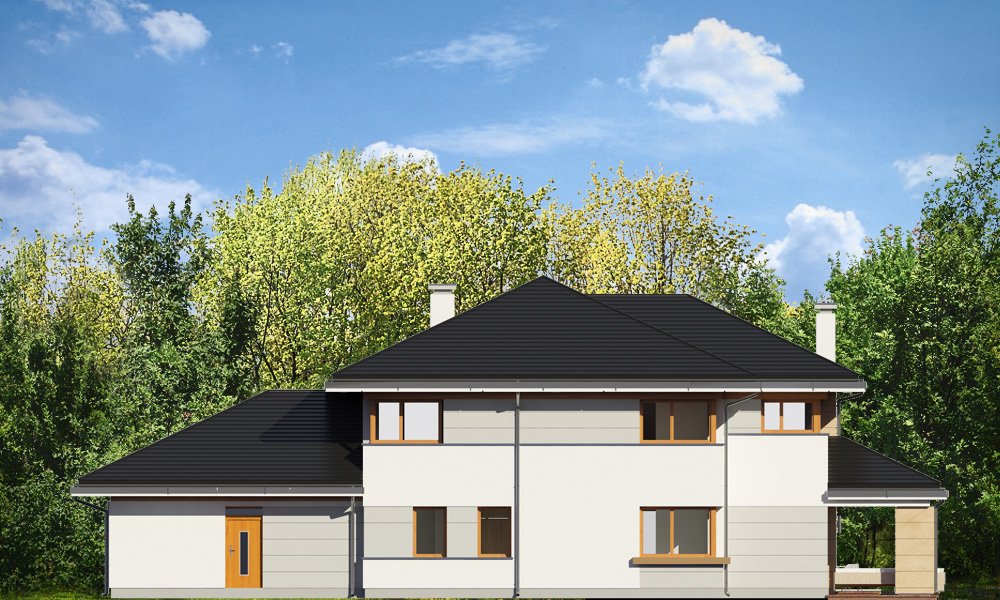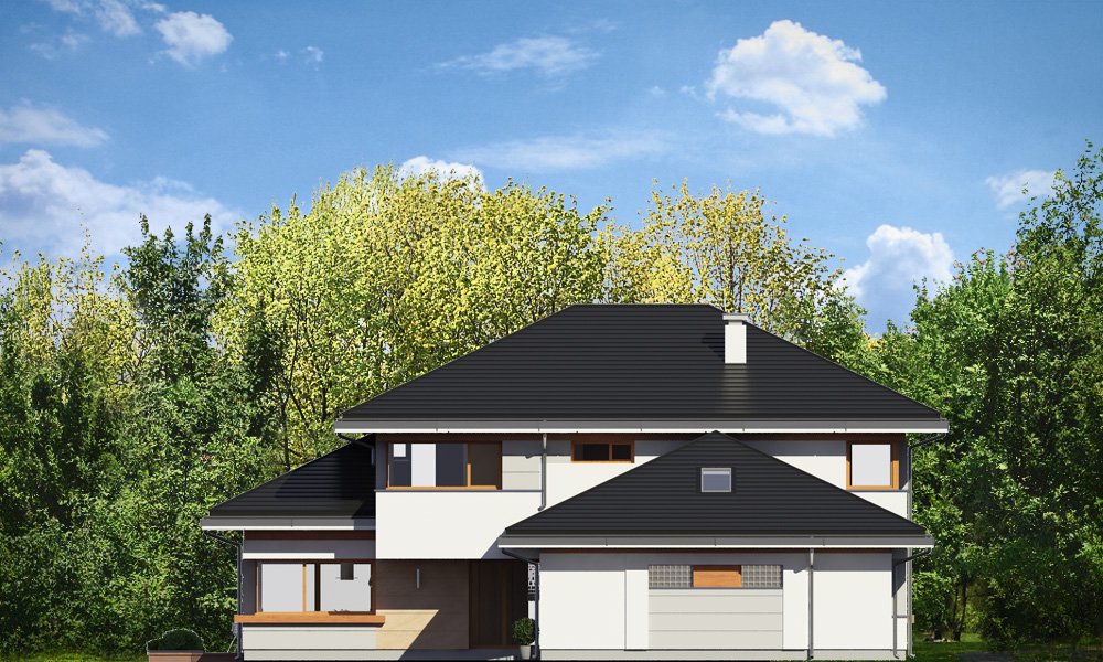 Dom z widokiem jest luksusową, nowoczesną willą, przeznaczoną dla 4-6cioosobowej rodziny, do budowy na działce z niekorzystnym usytuowaniem w stosunku do stron świata. Dom zaprojektowany został jako rozłożysta piętrowa rezydencja, połączona z otaczającym ogrodem licznymi przeszkleniami, oraz otwartymi i zadaszonymi tarasami. Bryła domu składa się z zasadniczej części piętrowej i trzech parterowych skrzydeł, tworzących w całości układ litery „T”. Projekt jest na tyle uniwersalny, że może być postawiony na każdej działce. Część wejściowo-wjazdowa i część tarasowa od strony salonu tworzą dwa osobne półotwarte dziedzińce : frontowy i ogrodowy. Duże narożne okna z rzadkimi podziałami stanowią wizytówkę domu. Elewację urozmaicają liczne detale, okładziny z piaskowca, boniowania tynku i drewniane wykończenia. Całość przykryta jest łagodnym dachem z szerokimi okapami. Dom ma nowoczesną, ale stonowaną architekturę. Emanuje z niej spokój i elegancja. Dzięki połączeniu dobrych sprawdzonych detali architektura domu nigdy się nie zestarzeje i nie wyjdzie z mody. Jednymi z głównych atrakcji wilii są jej przeszklenia, a największą atrakcją jest dwukondygnacyjny szklany narożnik salonu, łączący pokój dzienny z pustką z tarasem i ogrodem. Pozostałe przeszklenia : w jadalni, w kuchni, sypialniach, czy przy wejściu do domu, dodatkowo potęgują efekt otwartości wnętrza. Przestrzeń jest luksusem ! - Wnętrze domu zagospodarowano kierując się tą myślą. Parter to w dużej mierze otwarta duża część dzienna - salon, jadalnia, hol, kuchnia. Na parterze zmieściliśmy dodatkowy pokój - gabinet lub sypialnię gościnną. Piętro to sypialnie rodziców i dzieci, z łazienkami i garderobami. Na piętrze mieści się duża antresola nad salonem, którą można wykorzystać jako dodatkowy pokój. „Dom z widokiem” to dom dla ludzi wyjątkowych, z wizją, z pragnieniem życia w nietuzinkowym otoczeniu, wśród pięknych wnętrz. Zapraszamy !!