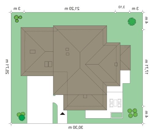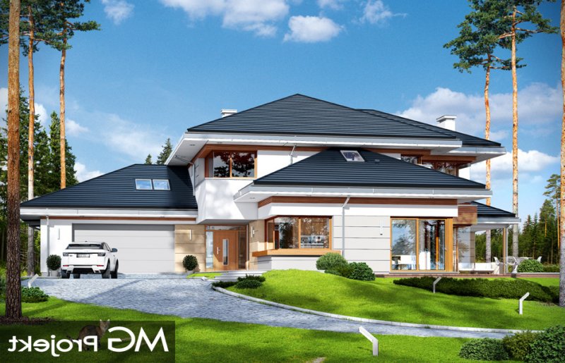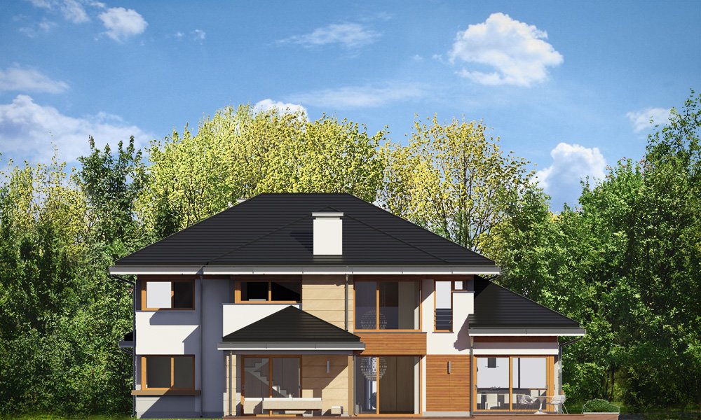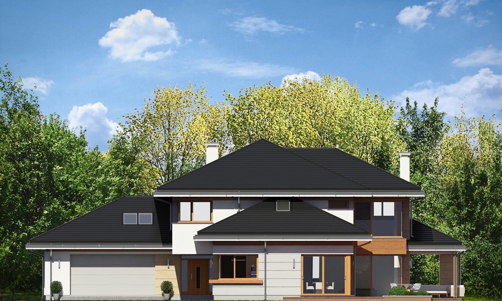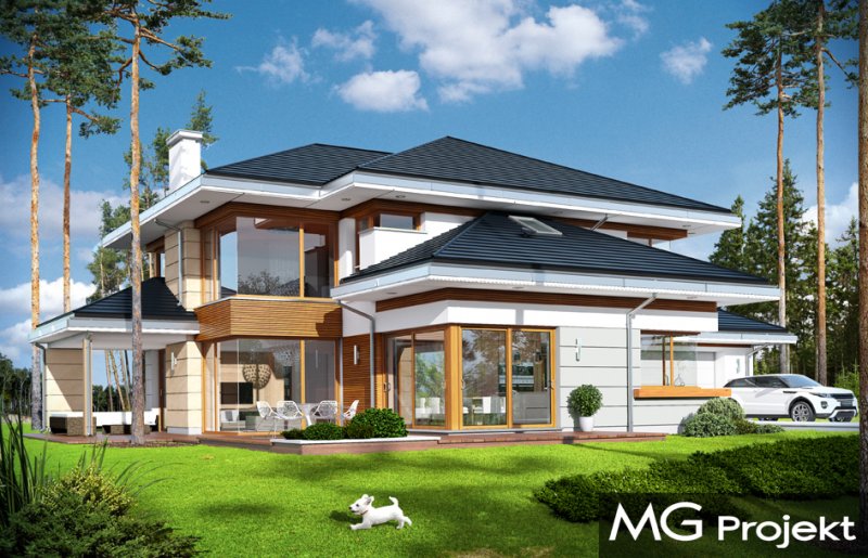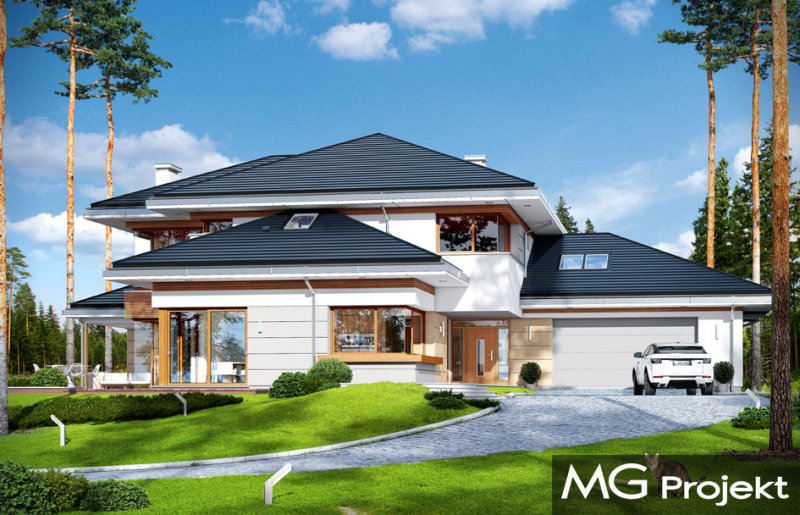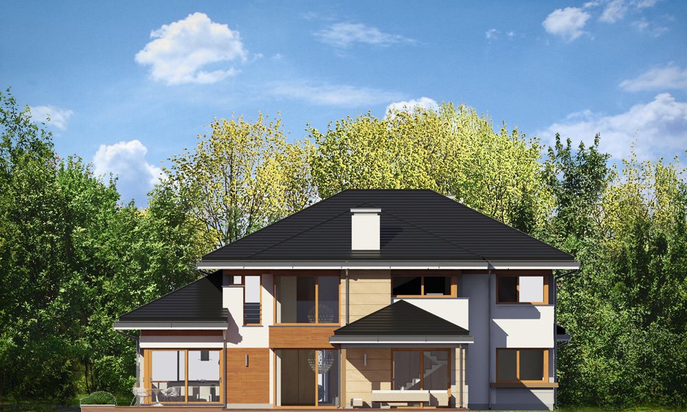 Dom z widokiem jest luksusową, nowoczesną willą, przeznaczoną dla 4-6cioosobowej rodziny, do budowy na działce z niekorzystnym usytuowaniem w stosunku do stron świata. Dom zaprojektowany został jako rozłożysta piętrowa rezydencja, połączona z otaczającym ogrodem licznymi przeszkleniami, oraz otwartymi i zadaszonymi tarasami. Bryła domu składa się z zasadniczej części piętrowej i trzech parterowych skrzydeł, tworzących w całości układ litery „T”. Projekt jest na tyle uniwersalny, że może być postawiony na każdej działce. Część wejściowo-wjazdowa i część tarasowa od strony salonu tworzą dwa osobne półotwarte dziedzińce : frontowy i ogrodowy. Duże narożne okna z rzadkimi podziałami stanowią wizytówkę domu. Elewację urozmaicają liczne detale, okładziny z piaskowca, boniowania tynku i drewniane wykończenia. Całość przykryta jest łagodnym dachem z szerokimi okapami. Dom ma nowoczesną, ale stonowaną architekturę. Emanuje z niej spokój i elegancja. Dzięki połączeniu dobrych sprawdzonych detali architektura domu nigdy się nie zestarzeje i nie wyjdzie z mody. Jednymi z głównych atrakcji wilii są jej przeszklenia, a największą atrakcją jest dwukondygnacyjny szklany narożnik salonu, łączący pokój dzienny z pustką z tarasem i ogrodem. Pozostałe przeszklenia : w jadalni, w kuchni, sypialniach, czy przy wejściu do domu, dodatkowo potęgują efekt otwartości wnętrza. Przestrzeń jest luksusem ! - Wnętrze domu zagospodarowano kierując się tą myślą. Parter to w dużej mierze otwarta duża część dzienna - salon, jadalnia, hol, kuchnia. Na parterze zmieściliśmy dodatkowy pokój - gabinet lub sypialnię gościnną. Piętro to sypialnie rodziców i dzieci, z łazienkami i garderobami. Na piętrze mieści się duża antresola nad salonem, którą można wykorzystać jako dodatkowy pokój. „Dom z widokiem” to dom dla ludzi wyjątkowych, z wizją, z pragnieniem życia w nietuzinkowym otoczeniu, wśród pięknych wnętrz. Zapraszamy !!