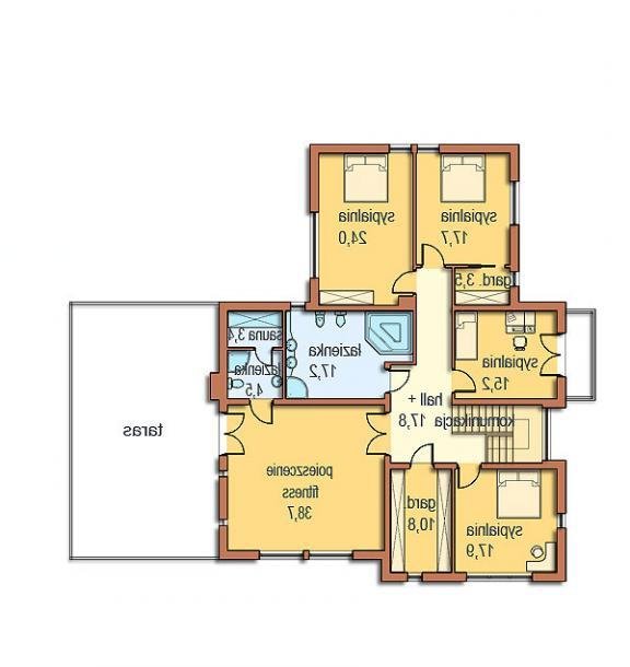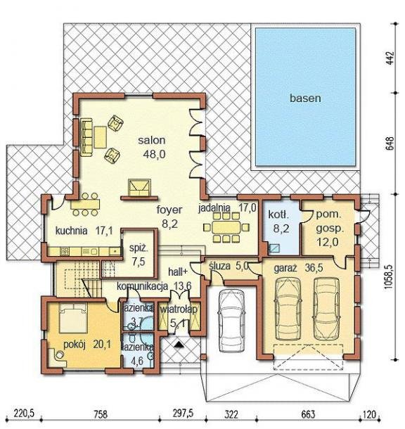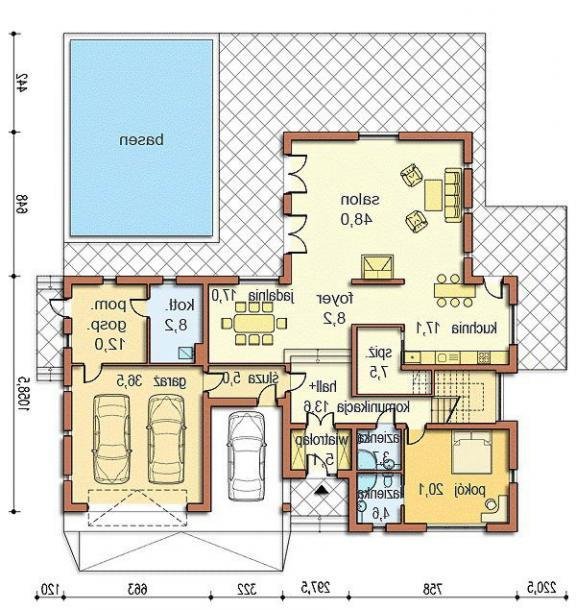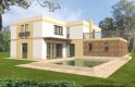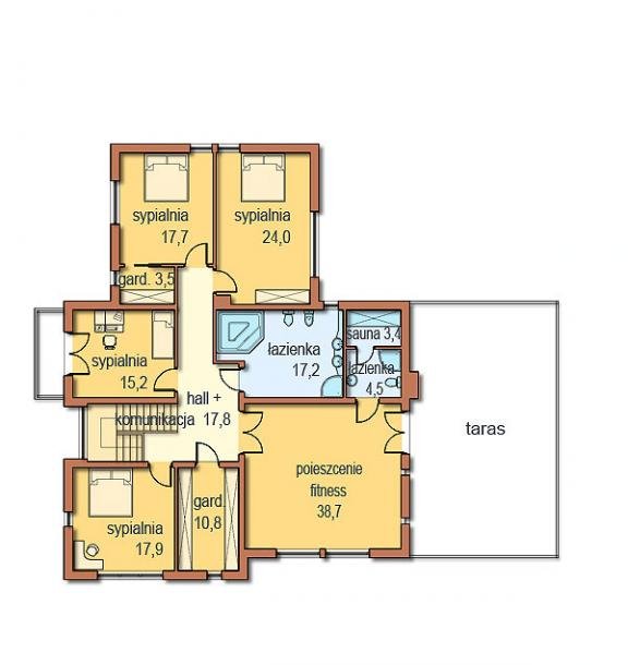 Na parterze znajduje się przestronny salon z kominkiem, duża kuchnia ze spiżarnią i obszerna jadalnia, hall, pokój gościnny z własną łazienką, łazienka ogólnodostępna oraz kotłownia i pomieszczenie gospodarcze przy garażu dwustanowiskowym. Przy tarasie zewnętrznym obok salonu zlokalizowano zewnętrzny basen. Na piętrze znajdują się cztery duże sypialnie, dwie garderoby, wygodna ogólnodostępna łazienka, pomieszczenie fitness z łazienką i sauną oraz duży taras zewnętrzny nad garażem.