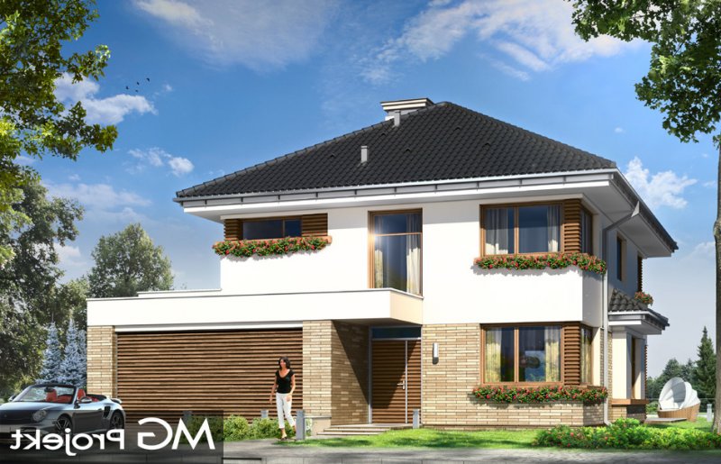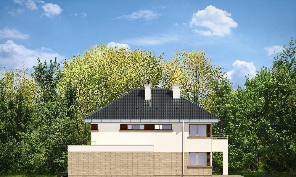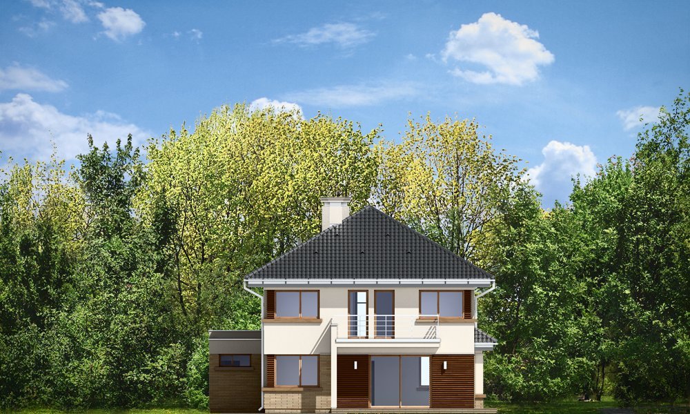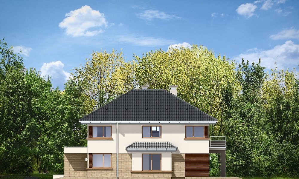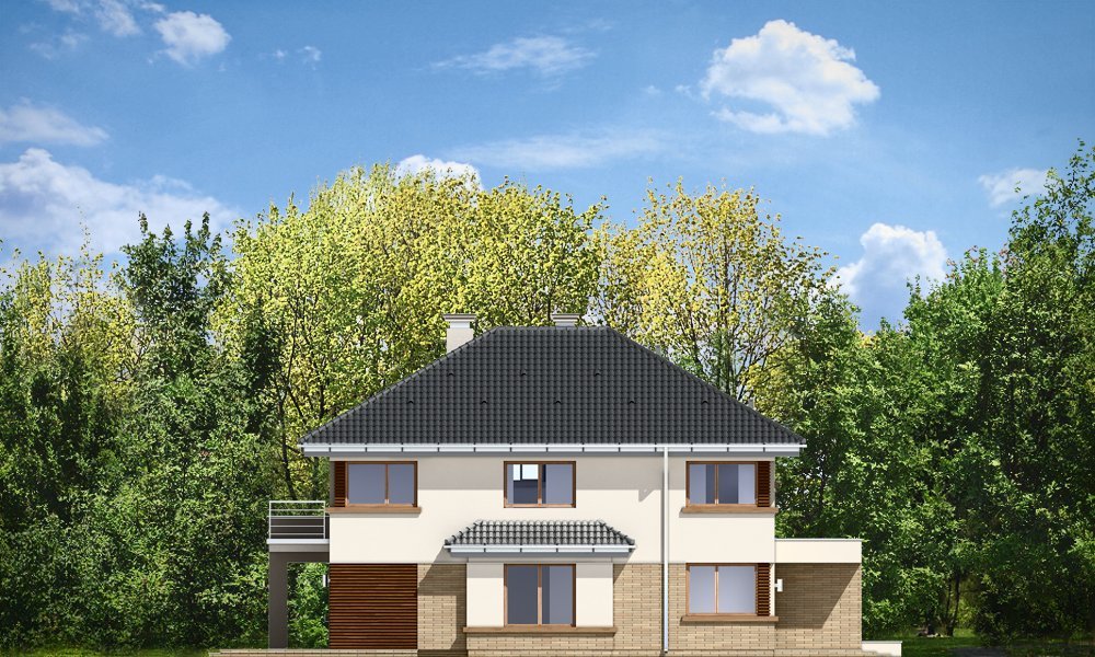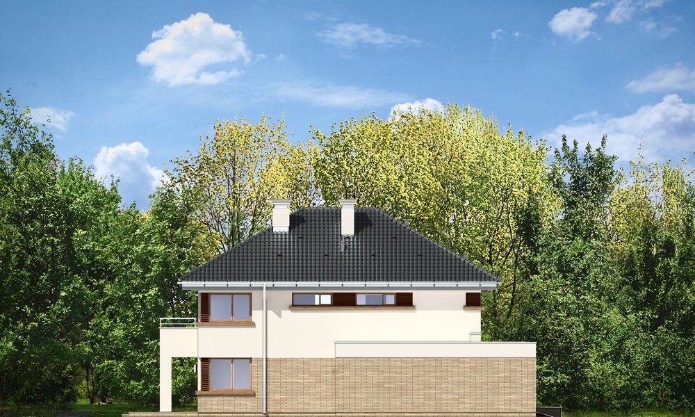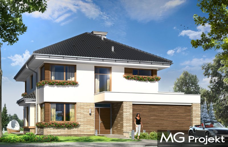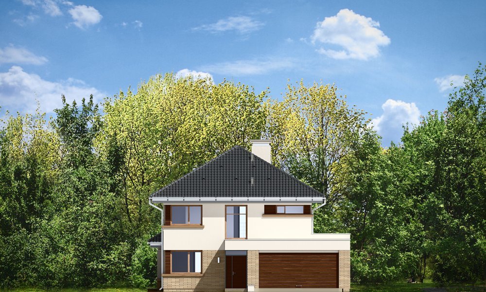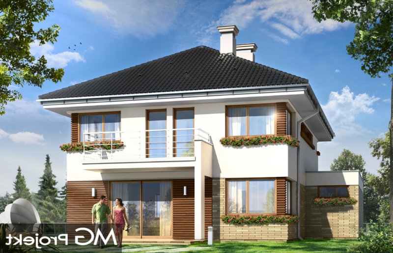 Helios to uroczy piętrowy domek dla cztero-pięcioosobowej rodziny. Jest to propozycja dla Inwestorów lubiących nowoczesną architekturę, którzy nie rezygnują z funkcjonalności i komfortu swojego domu. Piętrowa bryła budynku została przekryta czterospadowym dachem, a wbudowany częściowo garaż zwieńczono dachem płaskim. Dobrze dobrane detale architektoniczne, ciekawie rozmieszczone okna, drewniane i ceglane okładziny na ścianach - wszystko to tworzy atrakcyjny wygląd zewnętrzny domu. Wnętrze to otwarta część dzienna na parterze, z salonem, holem z ładnie wkomponowanymi schodami, jadalnią i kuchnią, oraz sypialnie na piętrze domu. Na parterze zaprojektowano dodatkowy pokój - gabinet lub sypialnię gościnną, oraz garaż z kotłownią. Na piętrze znajduje się apartament rodziców z własną łazienką i garderobą, sypialnie dziecięce z łazienką, oraz dodatkowy pokój. Pracownia posiada wersję odbicia lustrzanego projektu.