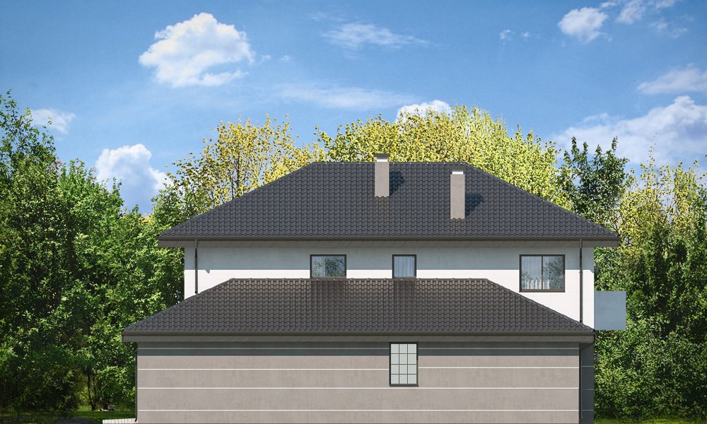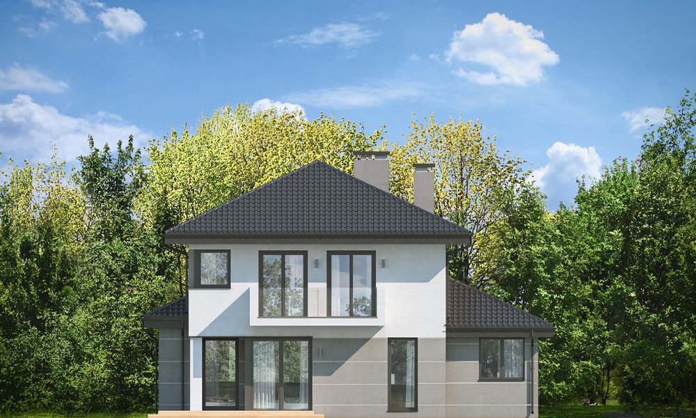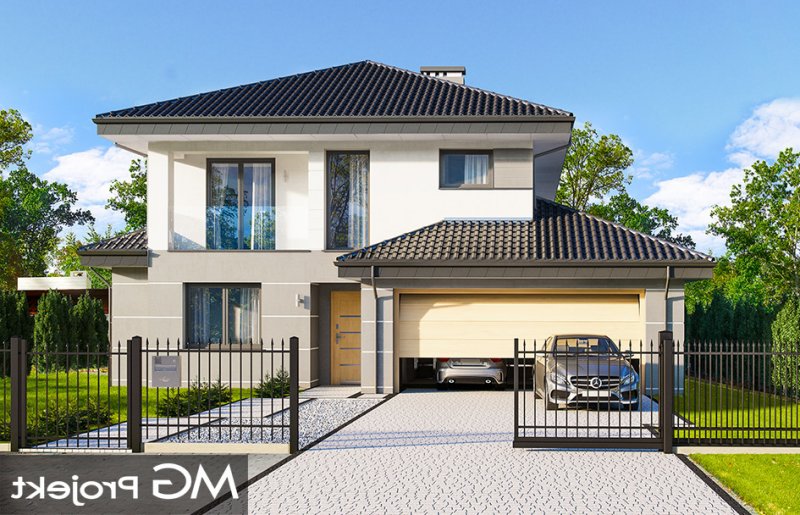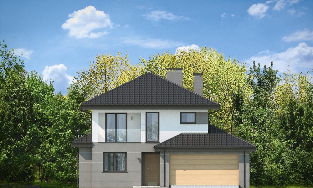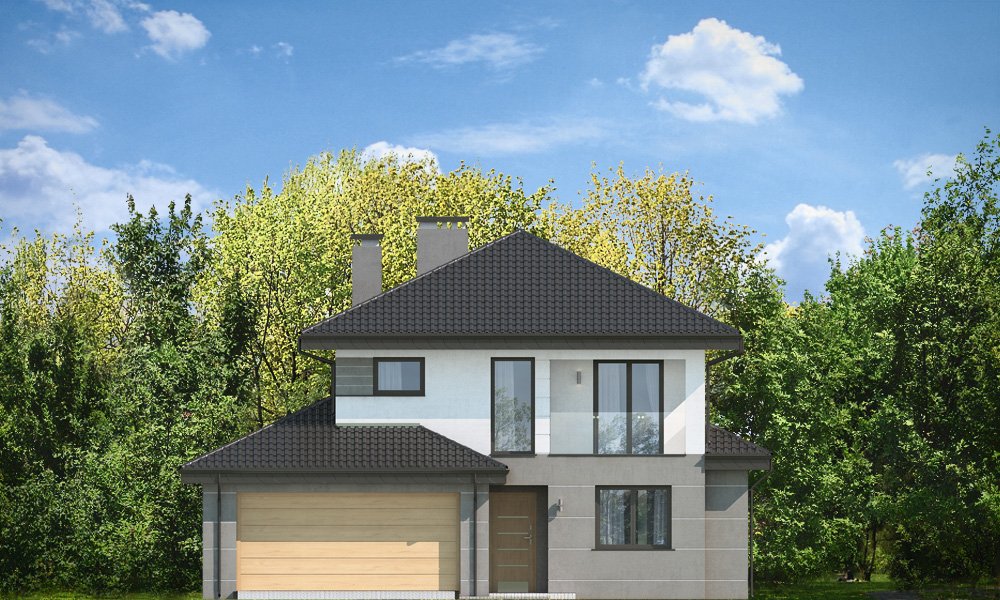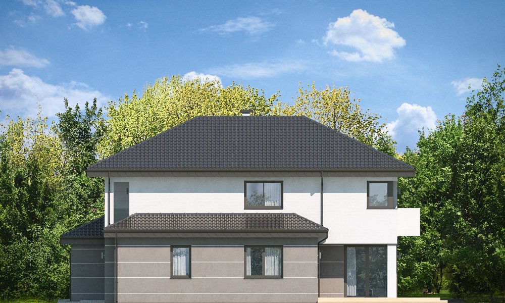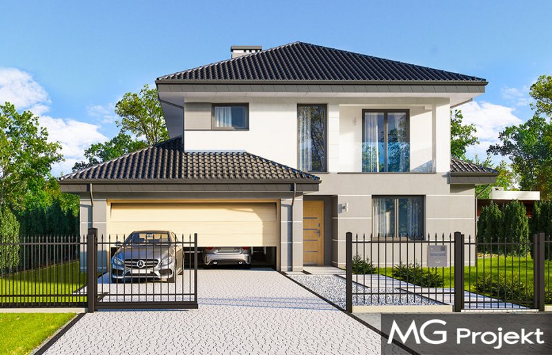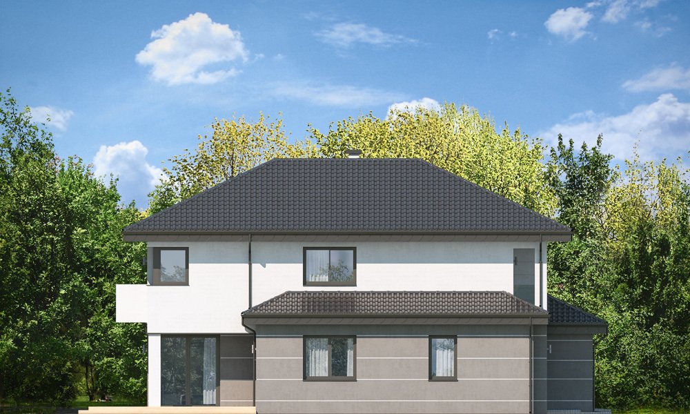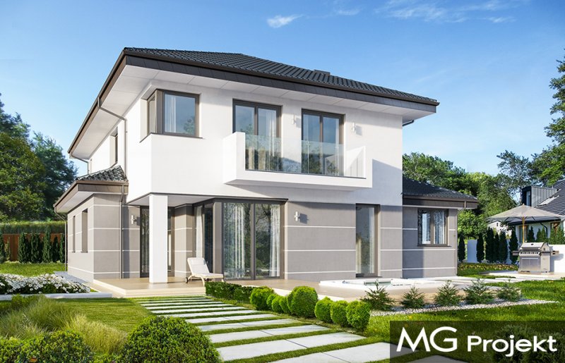 Kasjopea 7 to zupełnie nowy projekt z popularnej kolekcji domów „Kasjopea”. Projekt różni się zasadniczo od pozostałych domków z tej kolekcji, ma nowy oryginalny i nowoczesny wyraz architektoniczny. Osiągnięto go łącząc prostotę, oszczędność dodatków i detali, oraz ciekawą kolorystykę i materiały. Kasjopea 7 to budynek piętrowy, dla cztero-siedmioosobowej rodziny. Bryła domu jest piętrowa, przykryta czterospadowym dachem, z dobudowaną parterową częścią z garażem dwustanowiskowym. Kasjopea 7 to duża, komfortowa i reprezentacyjna willa, przeznaczona dla Inwestorów, którzy marzą o swobodzie przestrzeni. Jednocześnie budynek ma praktycznie zaprojektowane wnętrze, a jego konstrukcja jest dość prosta i łatwa w budowie. Elewacje domu podzielone są na poziome pasy. Dolny pas parteru ma szare boniowania, ściany piętra pozostają białe. Duże okna, podcienie i balkony dodatkowo ozdabiają bryłę budynku. Całość tworzy nowoczesną i dynamiczną sylwetkę domu. Wnętrze : parter to przede wszystkim naprawdę duży salon, połączony z jadalnią i holem, tworzący niemal 60ciometrową przestrzeń dzienną. Przy wejściu do domu od frontu zaprojektowano dużą kuchnię ze stołem na szybkie posiłki. Z przedsionka dostajemy się do podwójnego garażu i do kotłowni. Za schodami, nieco odseparowany od salonu zlokalizowany jest dodatkowy pokój z własną łazienką : gabinet, lub sypialnia gościnna. Może to być również pokój dla seniora. Na piętrze zaprojektowano aż cztery sypialnie i dwie łazienki. Sypialnie dzieci mają wbudowane szafy. Sypialnia rodziców to osobny apartament z własną łazienką, garderoba i zadaszonym balkonem. Kasjopea 7 to komfortowy, funkcjonalnie zaprojektowany dom, o nowoczesnej i reprezentacyjnej architekturze. Projekt bardzo łatwo można dostosować do standardu NF40. Zapraszamy.