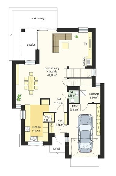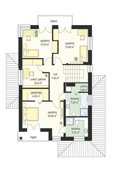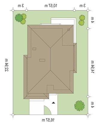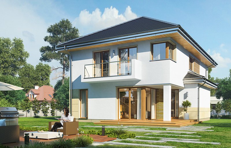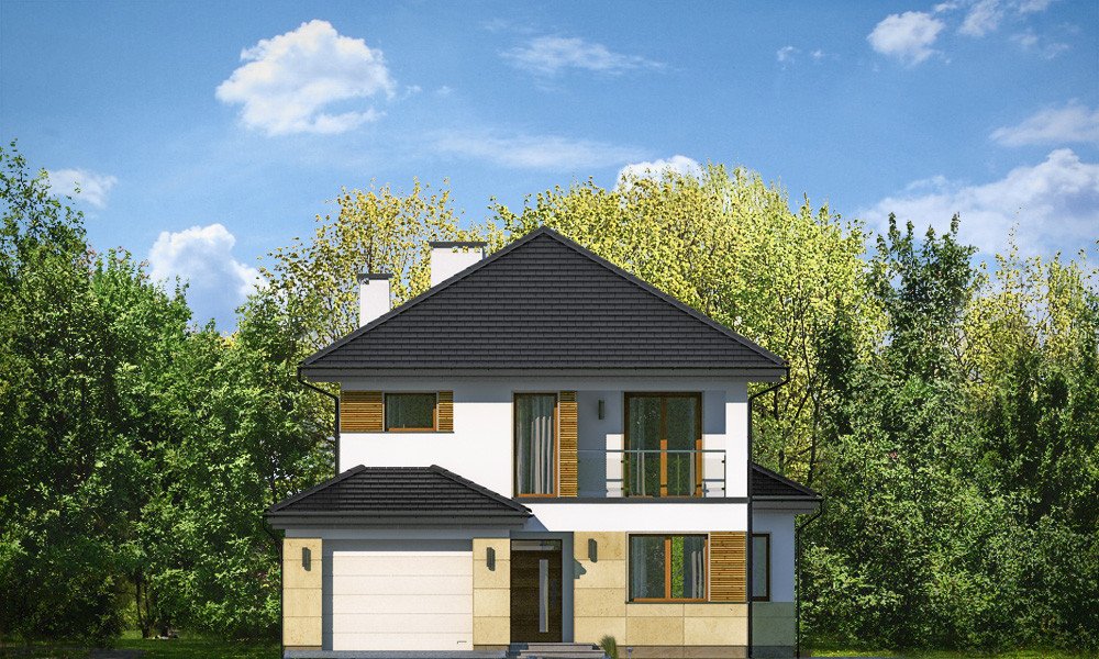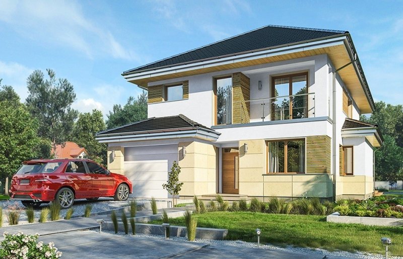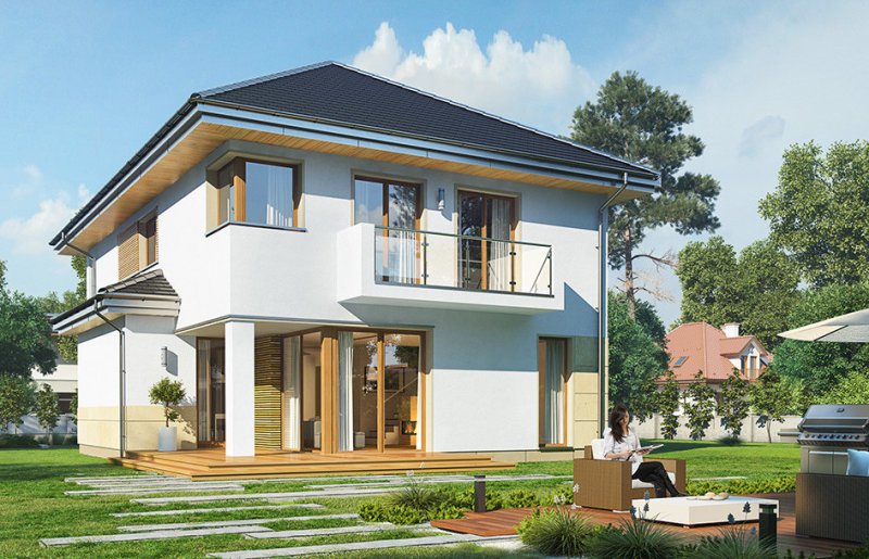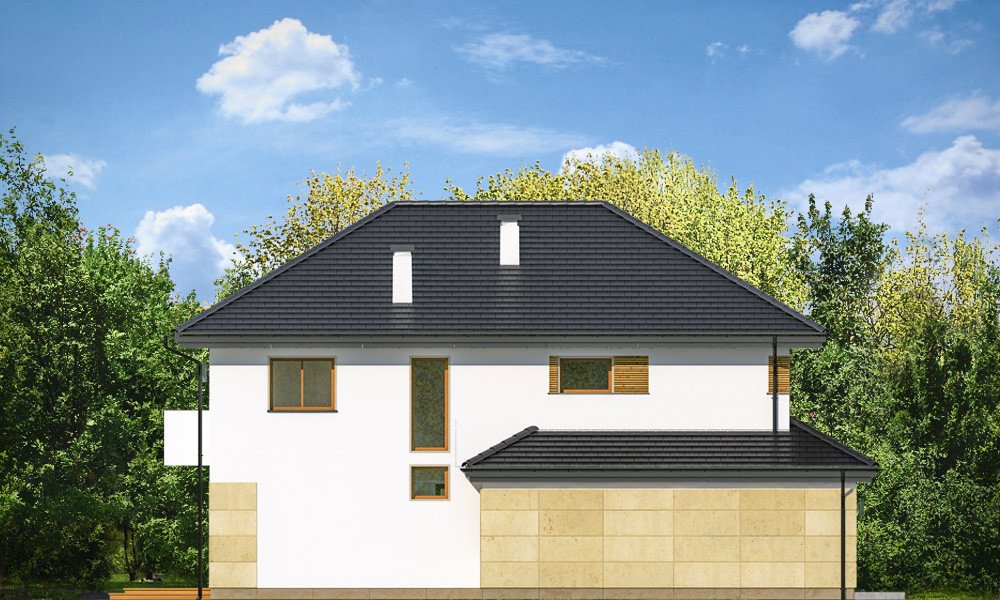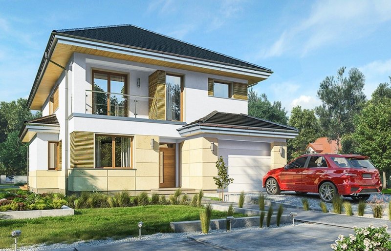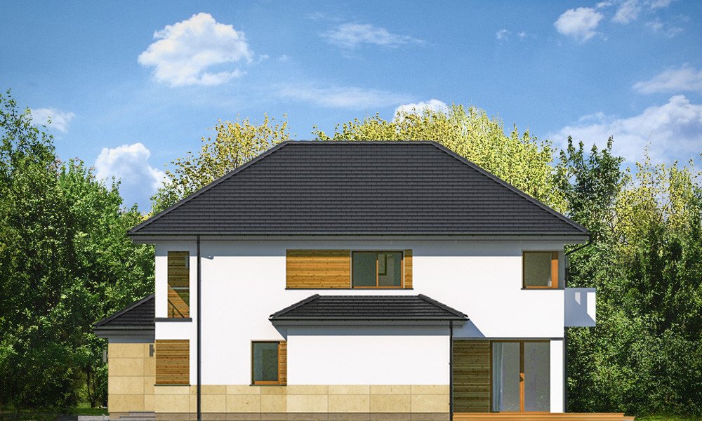Projekt domu Kasjopea 8 jest kolejną wersją z popularnej serii domów „Kasjopea”. Jest on odświeżoną wersją bazowego projektu z tej kolekcji, do którego wprowadzono szereg modyfikacji - przede wszystkim dach o wyższym kącie nachylenia. Kasjopea 8 to projekt budynku piętrowego, dla 4-5cioosobowej rodziny. Prostokątna bryła przykryta jest czterospadowym dachem. W główną bryłę wbudowany jest jednostanowiskowy garaż. Nowoczesna architektura łączy się tutaj z funkcjonalnie zaprojektowanym wnętrzem. Elewacje domu ozdobione są okładzinami z kamienia ( lub boniowaniami tynku ), oraz z drewna. Podział ścian na poziome pasy, dodatkowa frontowa loggia, oraz balkon od strony ogrodowej urozmaicają bryłę. Wnętrze domu podzielono na część dzienną i gospodarczo-garażową na parterze, oraz sypialnie na piętrze. Parter to jednoprzestrzenne wnętrze salonu, jadalni i holu. Z pokoju dziennego mamy piękne przeszklenie, otwierające wnętrze na ogród i częściowo zadaszony podcieniem taras. Półotwarta kuchnia ze spiżarnią umieszczona jest niedaleko wejścia i garażu. Z garażu dostępnego z przedsionka dostajemy się do kotłowni domu. Piętro to aż cztery sypialnie i dwie łazienki. Sypialnie dzieci mają wbudowane szafy, natomiast sypialnia rodziców to osoby apartament z własną łazienką, garderobą i zadaszonym balkonem. Dom ma dość prostą konstrukcję, jest bardzo dobrze ocieplony.
