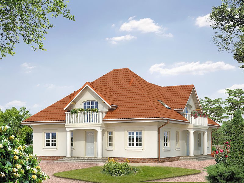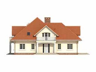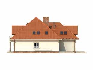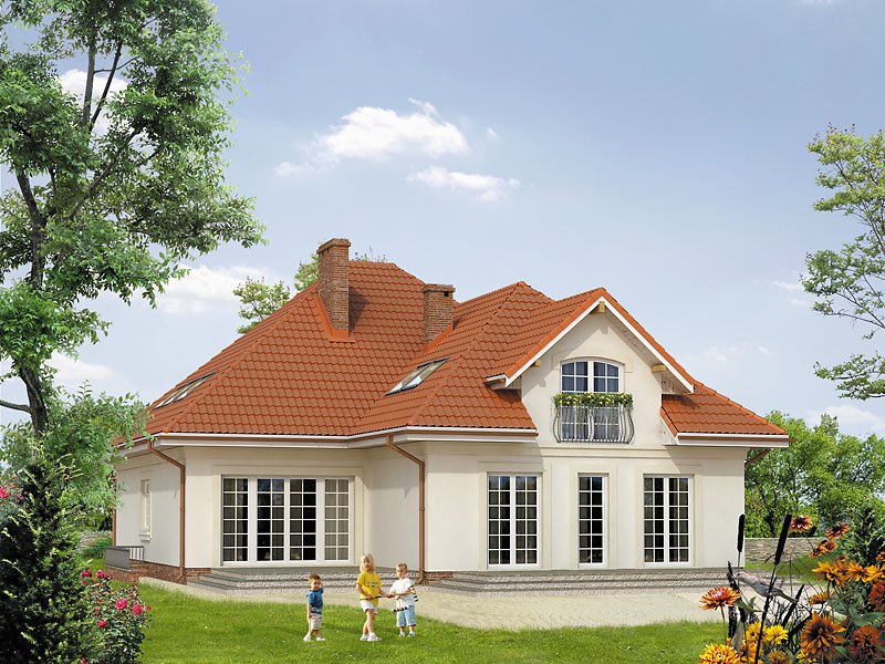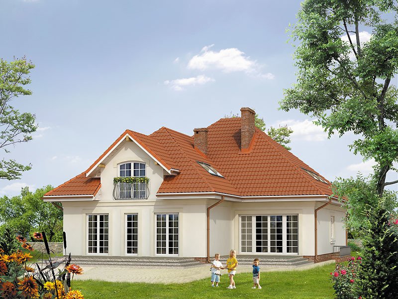 Ściany: 2-warstwowe - pustak ceramiczny + styropian, Stropy: żelbetowe, wylewane, Dach: dachówka ceramiczna, kąt nachylenia 40°