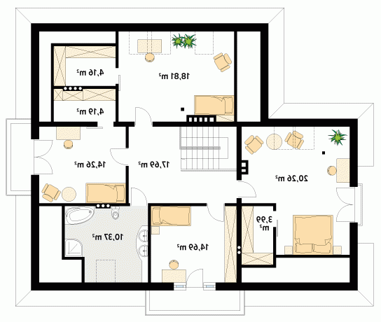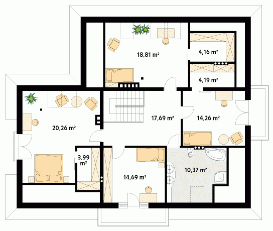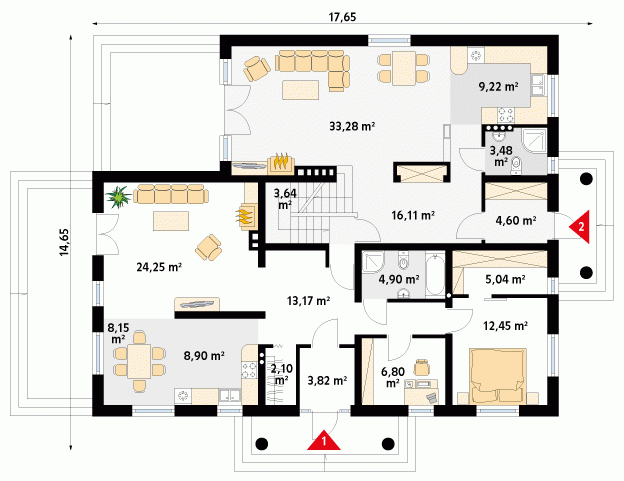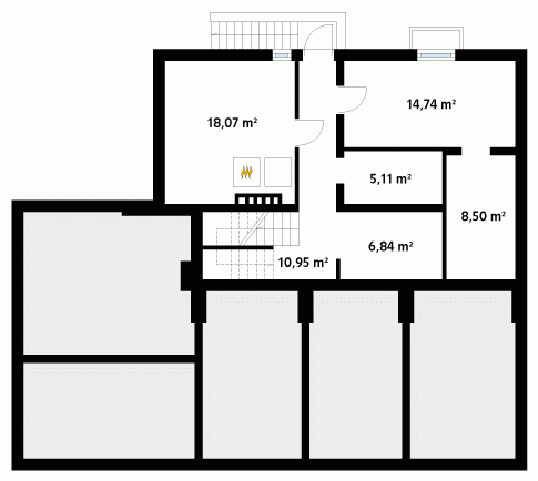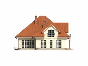 Budynek mieszkalny dwurodzinny z użytkowym poddaszem. Na parterze znajdują się dwa mieszkania z oddzielnymi wejściami, przy czym jedno zajmuje tylko jedną kondygnację i posiada, oprócz części dziennej, dwa dodatkowe pokoje i łazienkę. Natomiast drugie dodatkowo ma schody na poddasze, gdzie znajdują się trzy sypialnie z garderobami i łazienką. Z obu mieszkań jest wspólne zejście do piwnicy, w której zaprojektowano kotłownię, pralnię oraz pomieszczenie gospodarcze.