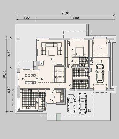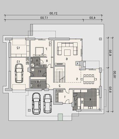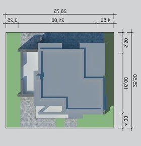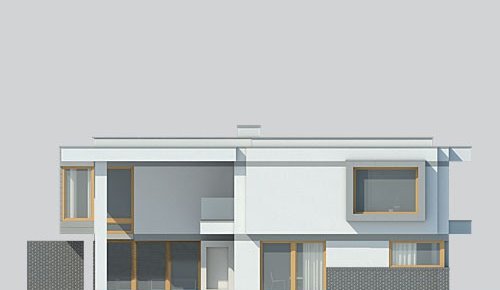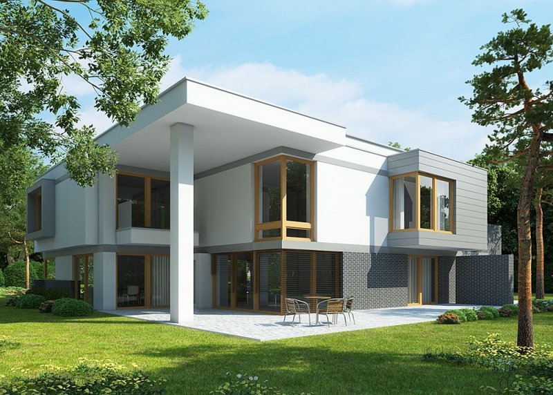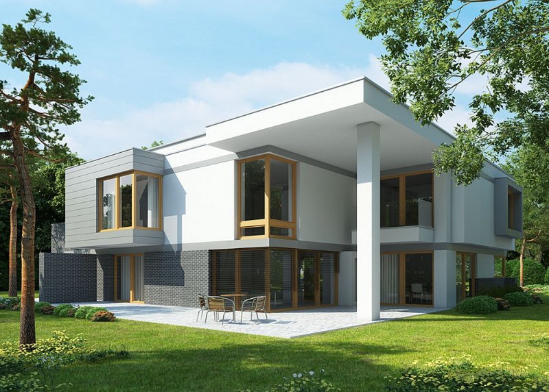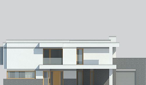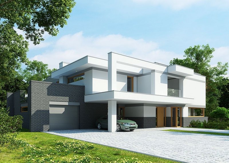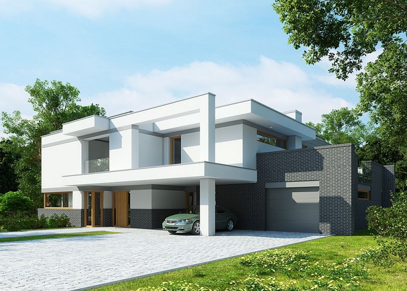 Projekt nowoczesnego, piętrowego domu, posiadającego garaż, a także podjazd z miejscami na dwa samochody.