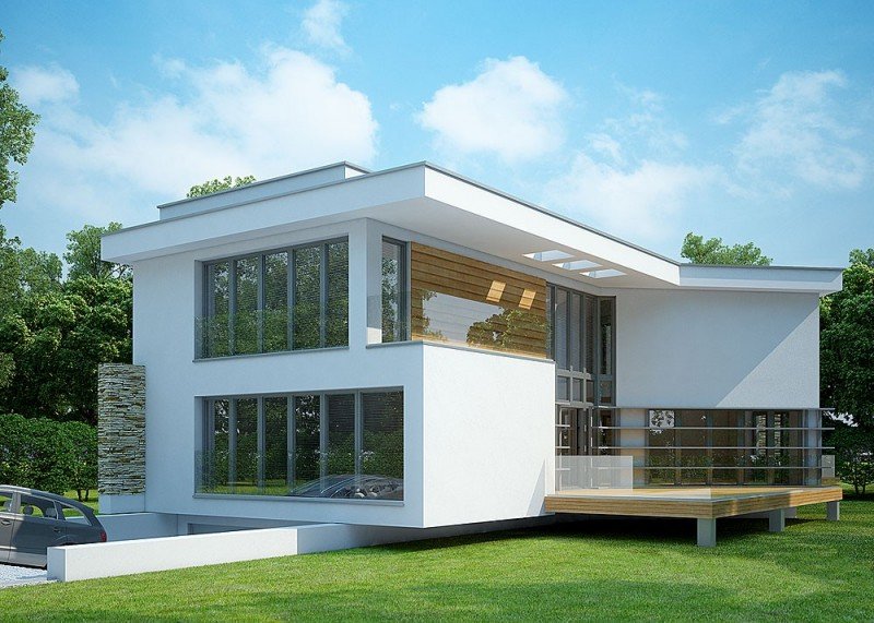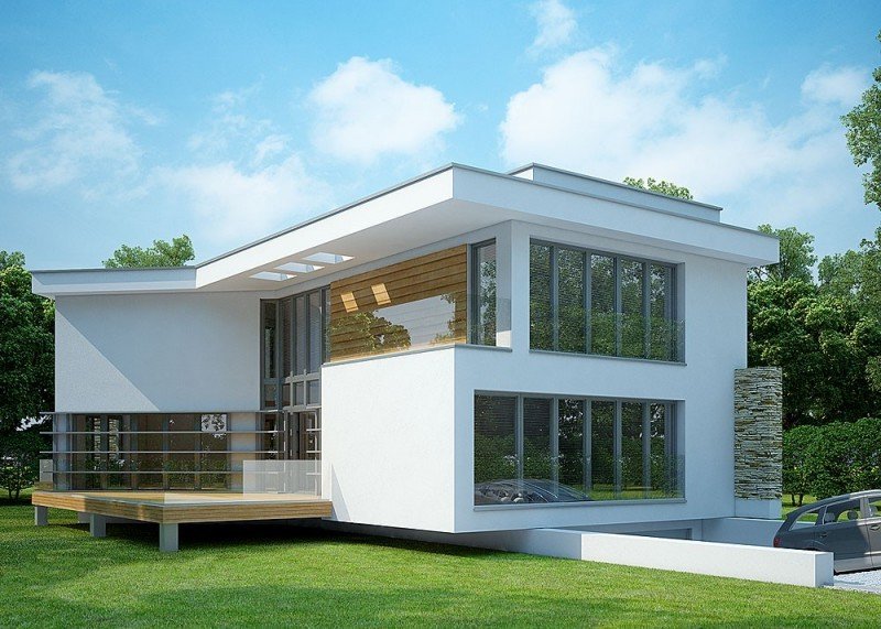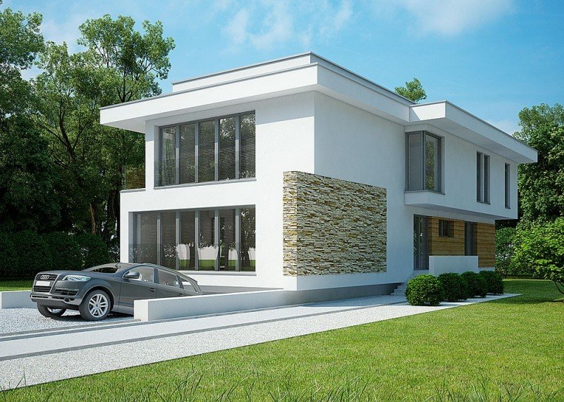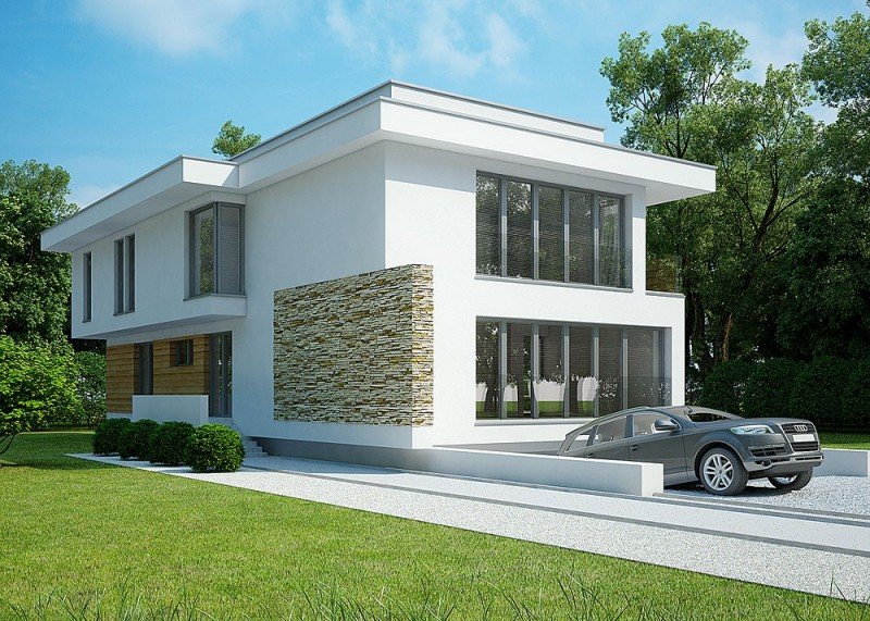 - Elewacje: wykończone tynkiem silikonowym, kamieniem naturalnym i drewnem elewacyjnym