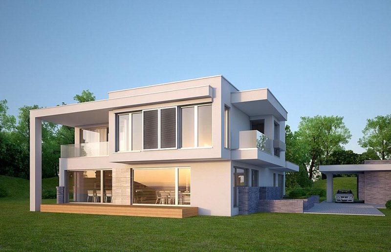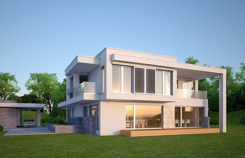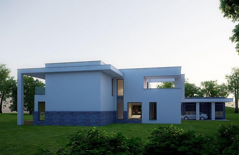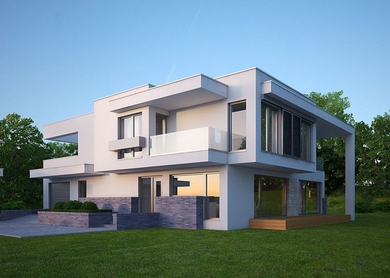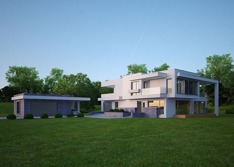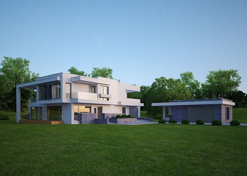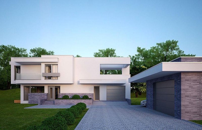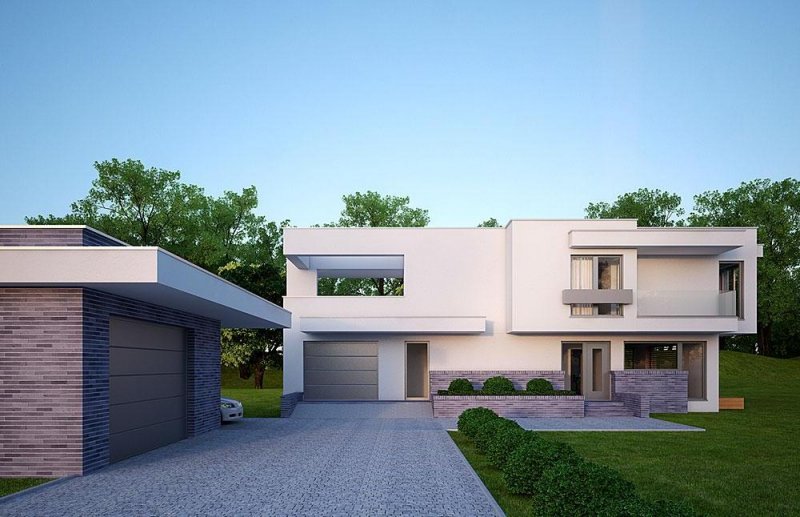 Nowoczesny, piętrowy dom jednorodzinny, z jednostanowiskowym garażem.