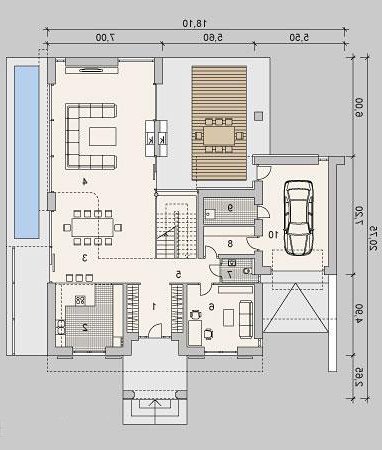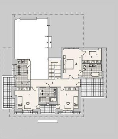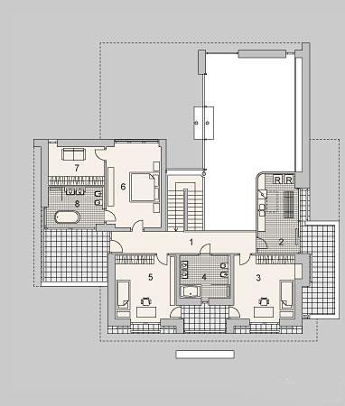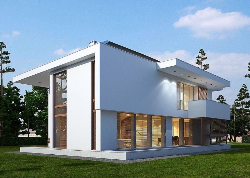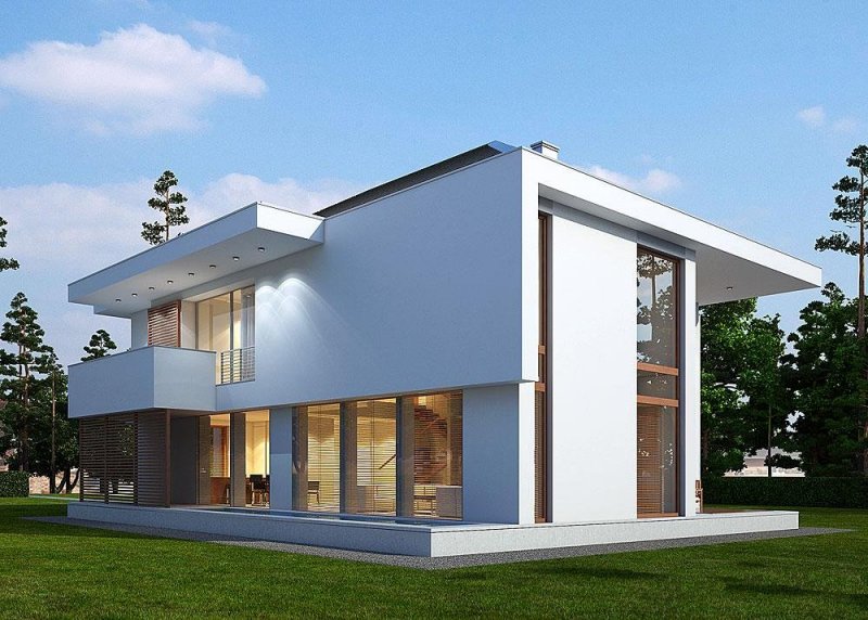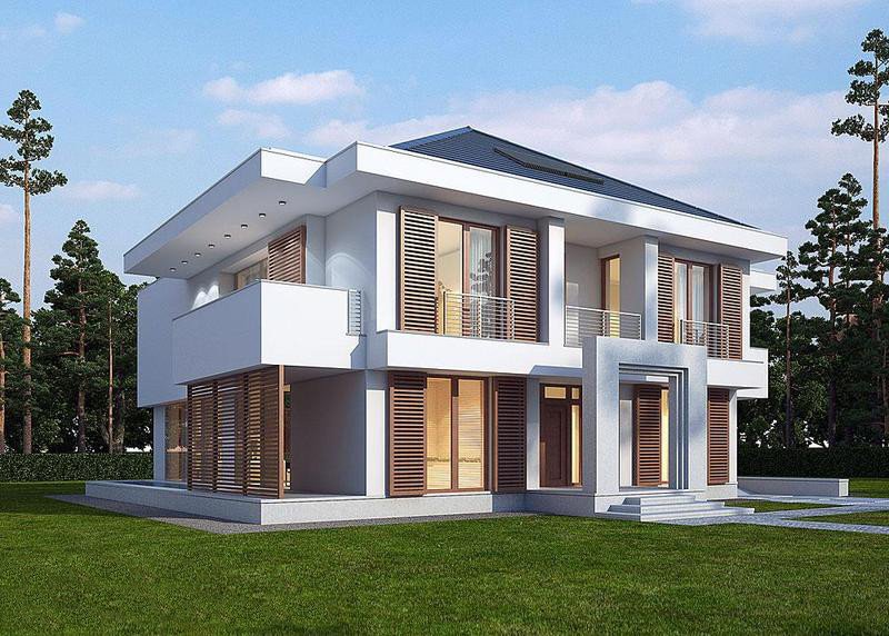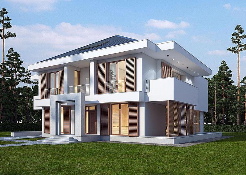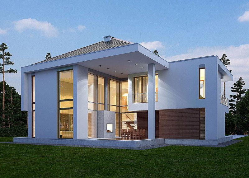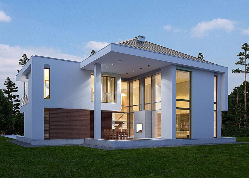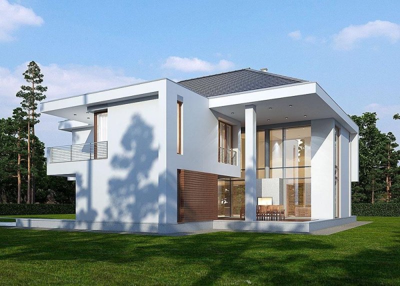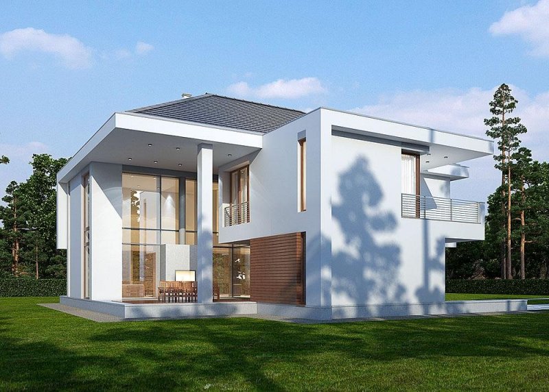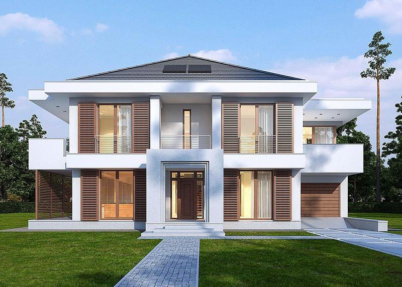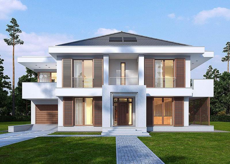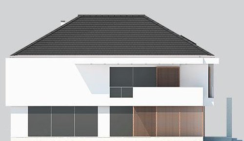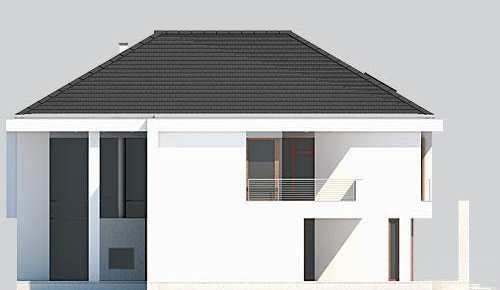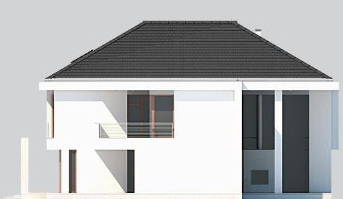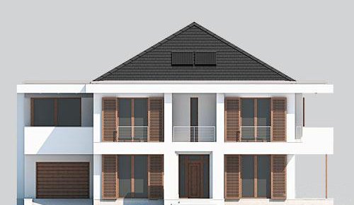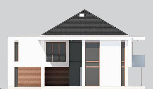 Piętrowy dom z garażem jednostanowiskowym w stylu rezydencjonalnym. Dom został zaprojektowany z myślą o miejscowych planach zagospodarowania przestrzennego, w których, m.in. jednym z wymogów jest dach. Stąd też włączenie tego elementu do stropodachu. W projekcie połączono nowoczesną architekturę z interesującymi funkcjami. Front domu to typowy klasyk z centralnie umieszczonym wejściem, podkreślonym dużym portalem. Od strony ogrodu zaplanowano przestronny, zadaszony, drewniany taras z zewnętrznym kominkiem. Dla nadania wiekszej lekkości bryle budynku zastosowano tu liczne przeszklenia, które sprawiają również, że wnętrza są pełne światła. Na parterze zaprojektowano jedną przestrzeń z wydzielonymi funkcjami jadalni, kuchni i salonu, który jest otwarty na dwie kondygnacje. Pietro to w całości strefa sypialniana. Elementem, który dodatkowo dodaje atrakcyjnosci budynkowi jest dekoracyjna tafla wody umieszczona pod dłuższym przeszklemniem w salonie.