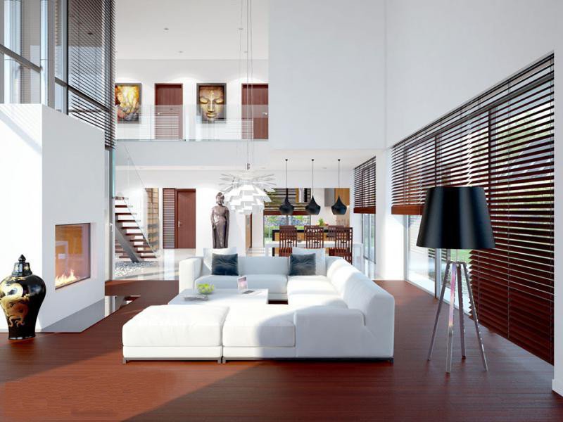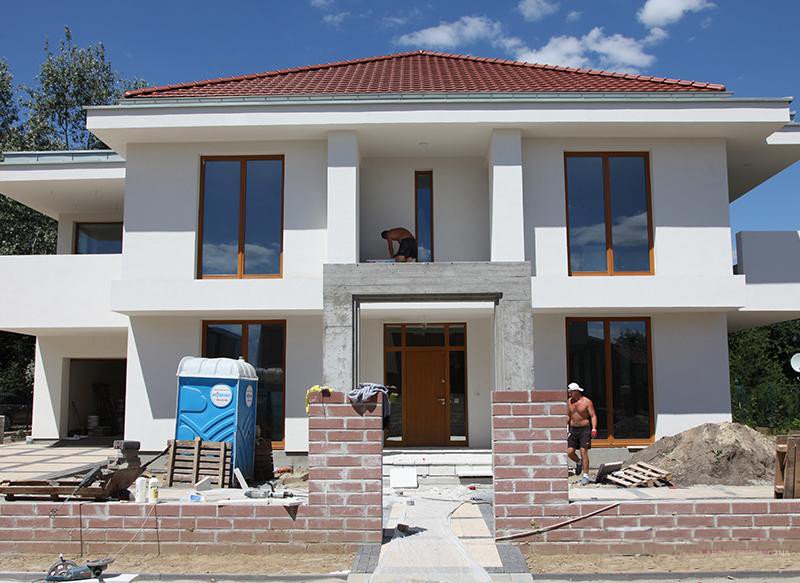 - Elewacje: wykończone tynkiem silikonowym, kamieniem naturalnym, deskami mahoniowymi