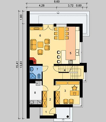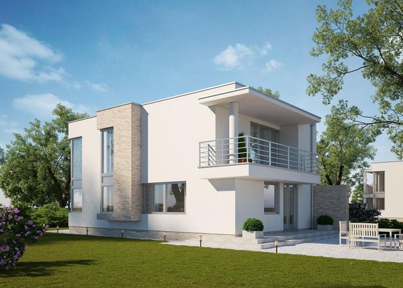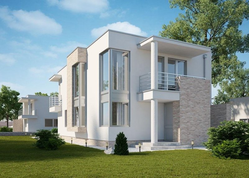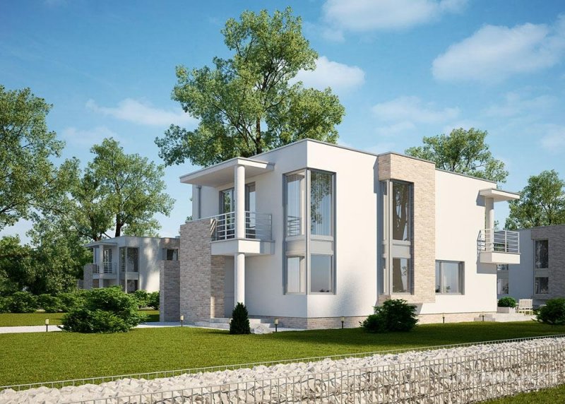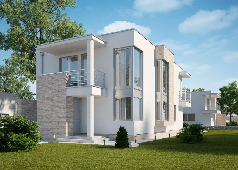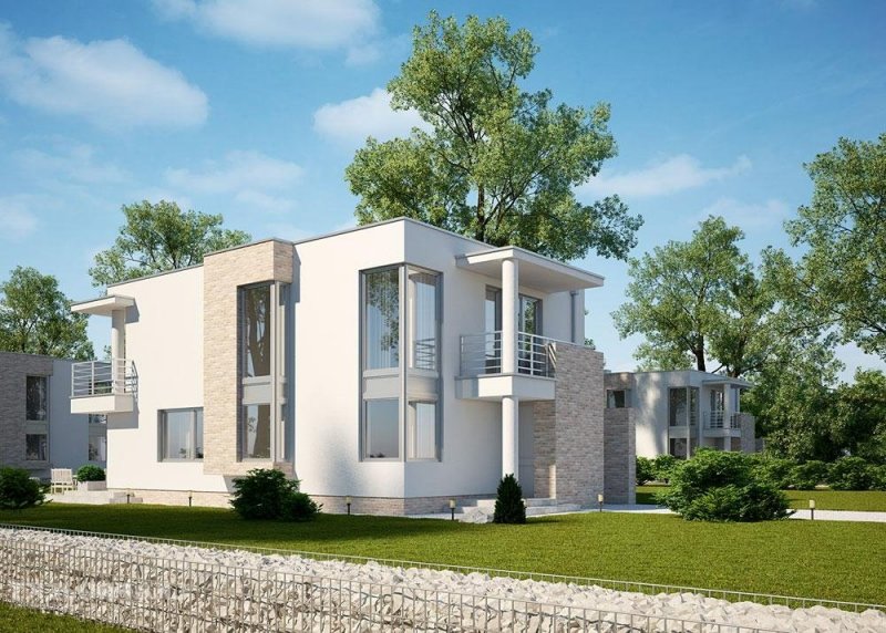- Elewacje: wykończone tynkiem silikonowym, cokoły budynku obłożone kamieniem