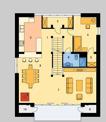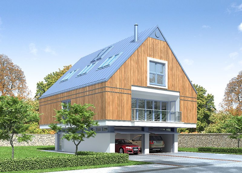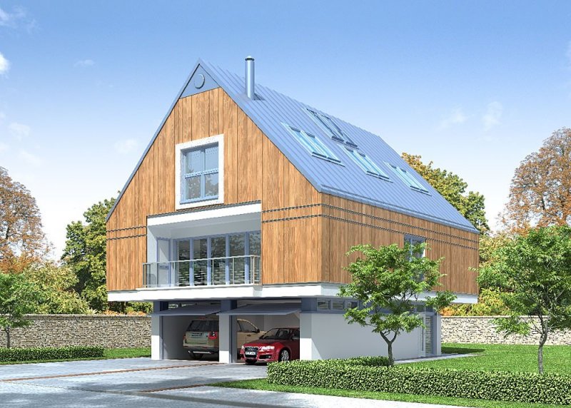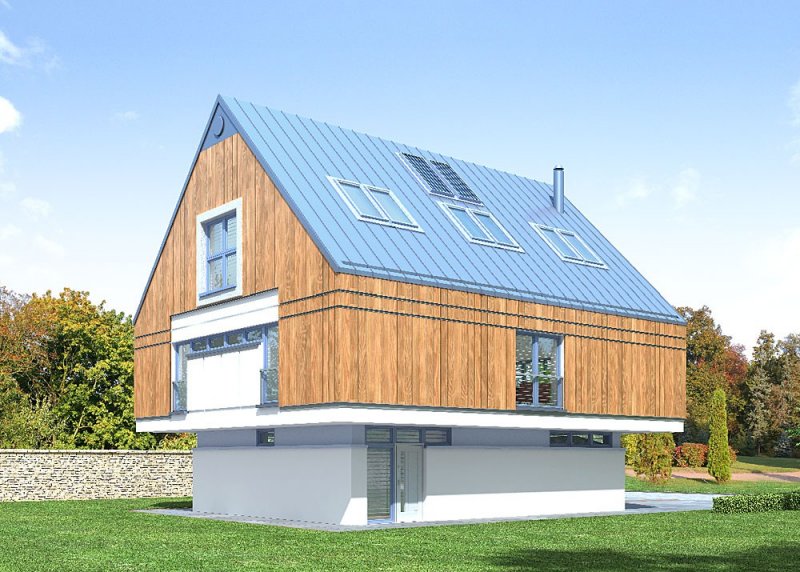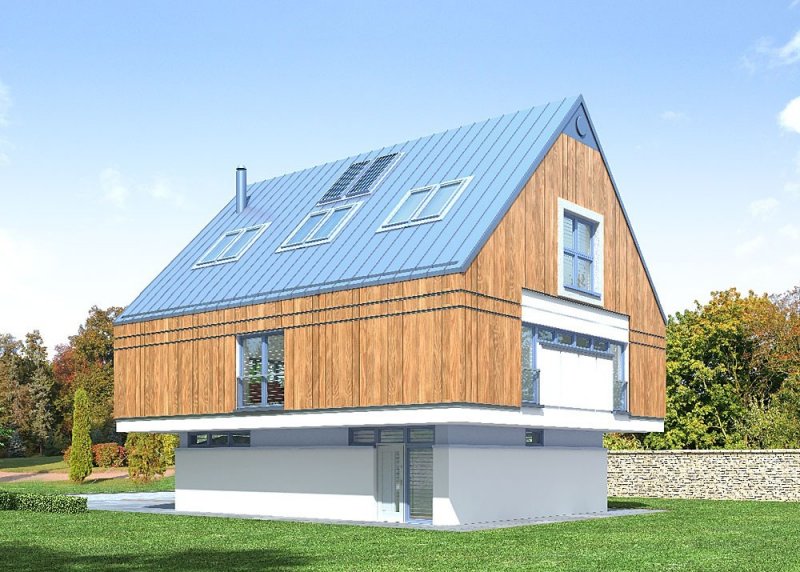 Dom jednorodzinny, piętrowy, z poddaszem użytkowym, z jednostanowiskowym garażem.