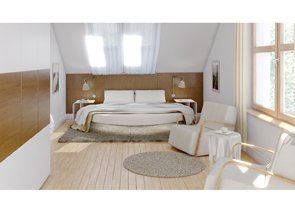 - Elewacje: Elewacja parteru oraz opaski wokół okien na pietrach wykończone tynkiem silikonowym, wyższe kondygnacje wykończone drewnem