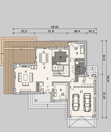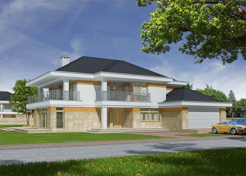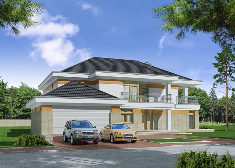 - Elewacje: tynk silikatowy, okładzina z piaskowca naturalnego, okładzina z desek drewnianych