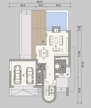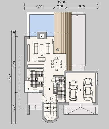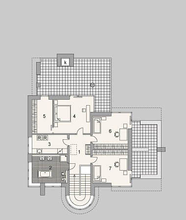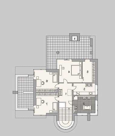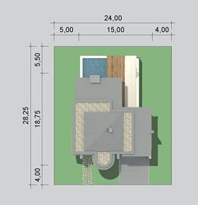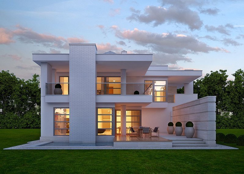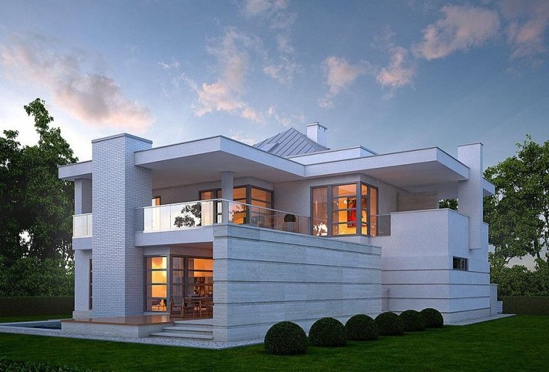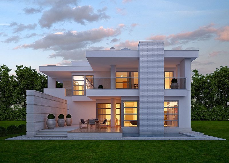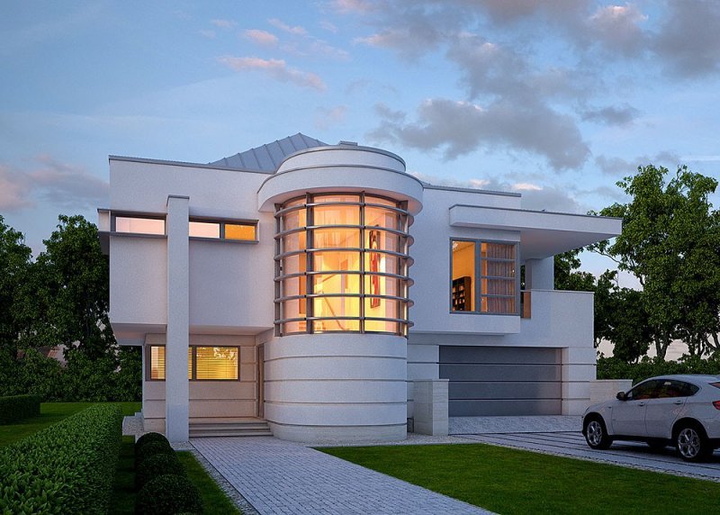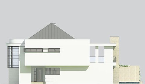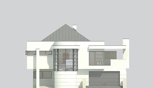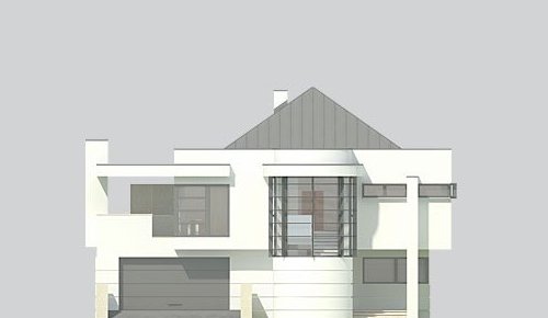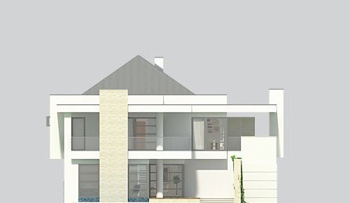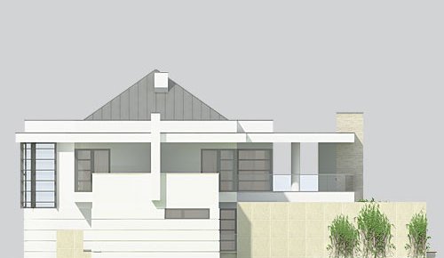 Dom jednorodzinny, piętrowy z garażem dwustanowiskowym. Głównym założeniem projektu było stworzenie interesujących wnętrz i bezpośredniego kontaktu z przestrzenią ogrodu, którą tworzą: tafla wody, deski ogrodowe, kamienna posadzka i mur. Na piętrze domu usytuowano wygodne sypialnie z garderobami, dużą łazienkę i pralnię. Wszystkie pokoje mają dostęp do przestronnych, zadaszonych tarasów z widokiem na ogród. Na jednym z nich, dodatkowo zaprojektowano zewnętrzny kominek. Styl domu inspirowany jest architekturą polskiego modernizmu.