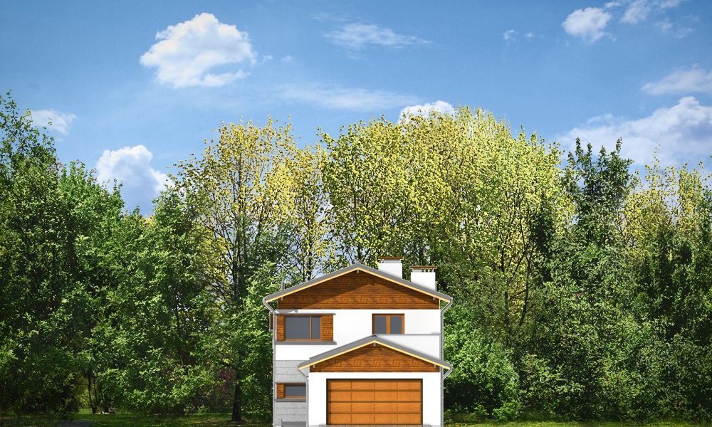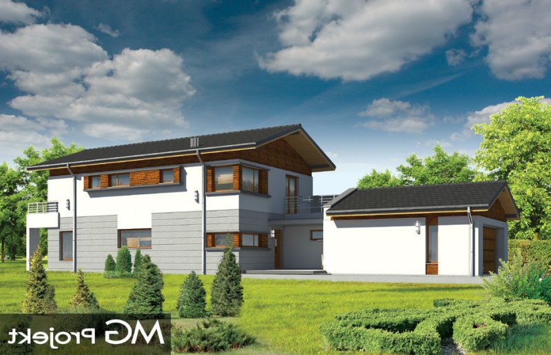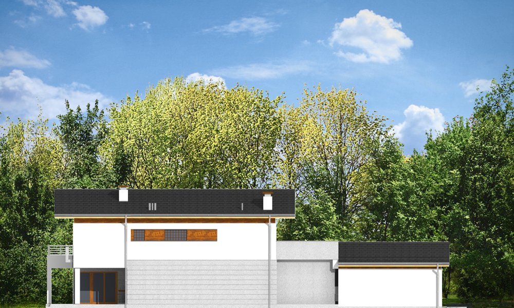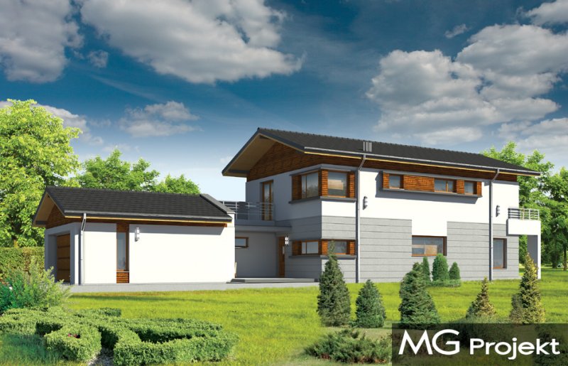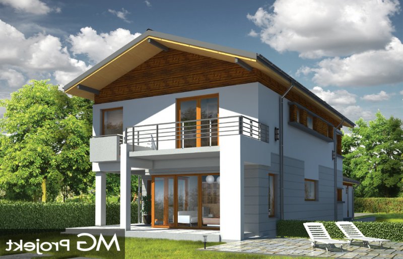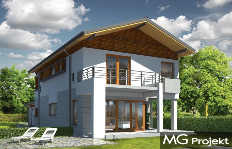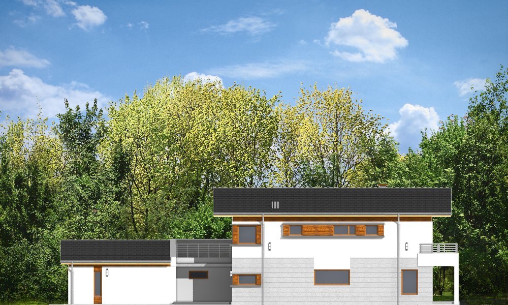 Lugano to willa jednorodzinna dla rodziny cztero-pięcioosobowej. Piętrowy budynek przykryty został dwuspadowym symetrycznym dachem z dachówki ceramicznej. Dom ma nowoczesny charakter, zaprojektowany został z przeznaczeniem dla wąskich działek, na których budynek musi mieć formę długiego wąskiego prostopadłościanu. Część garażowa parterowa została wyciągnięta przed główną bryłę budynku, urozmaicając w ten sposób część frontową. Od strony ogrodu bryłę domu ozdabia narożne okno salonu, podcień i taras piętra na bocznych słupach. Dwuspadowy łagodny dach z dużymi okapami dodaje całemu budynkowi dynamiki. Wnętrze podzielono na jednoprzestrzenną część dzienną na parterze, z ciekawymi, jednobiegowymi schodami, stanowiącymi niewątpliwą ozdobę salonu, oraz część nocną piętra z czterema sypialniami i dużą rodzinną łazienką. Domek pomimo niewielkiej powierzchni jest zaprojektowany funkcjonalnie, a same pomieszczenia są słusznej wielkości. Na parterze obok salonu swoje miejsce znalazł dodatkowy pokój - gabinet lub sypialnia gościnna. Garaż połączono z resztą domu przez duże pomieszczenie techniczne. Z pokoju dziennego można podziwiać ogród przez duże przeszklone otwarcie, połączone z podcieniem z kominkiem zewnętrznym i tarasem. Projekt dostępny jest również w wersji odbicia lustrzanego.